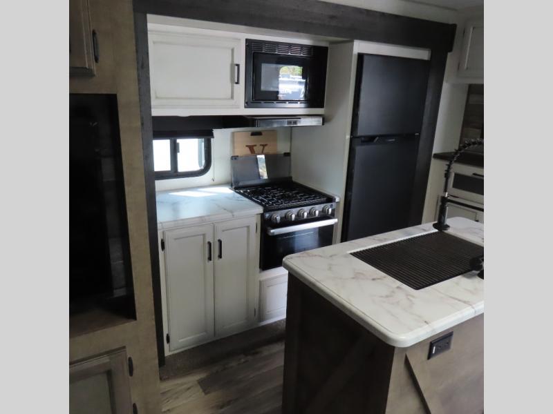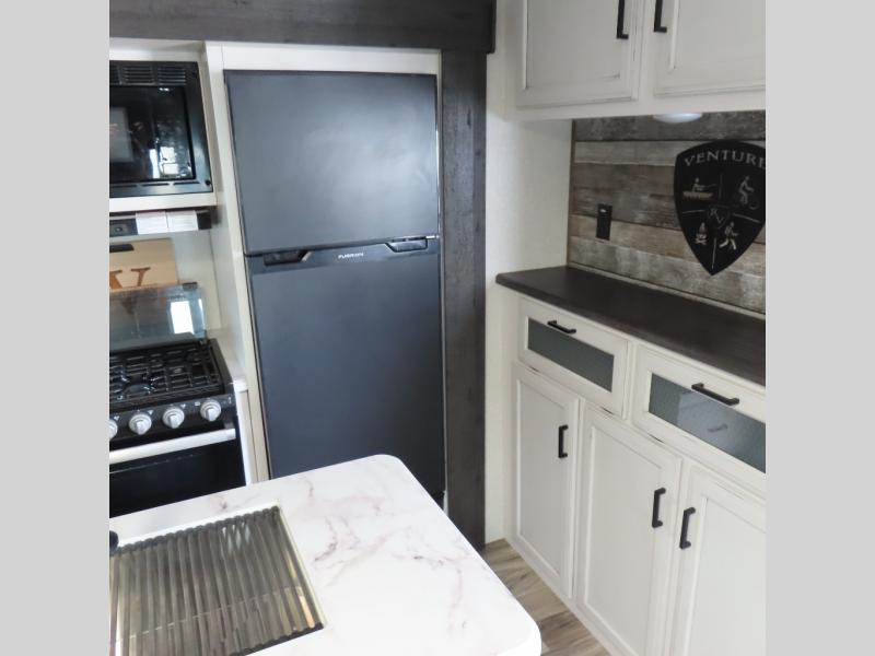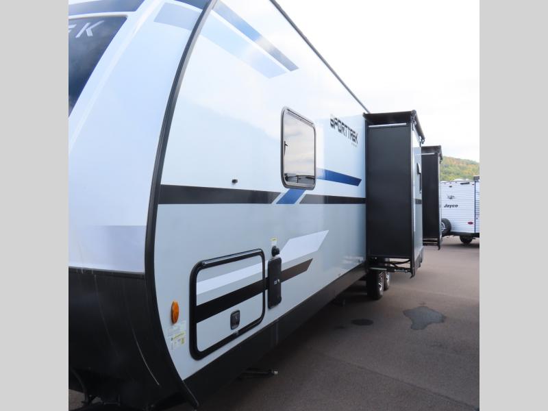 Every Venture RV SportTrek lightweight travel trailer is constructed to offer peace of mind and the comforts home! Their purposeful residential kitchens are packed with handy features like a recessed gas cooktop with glass cover for more countertop space, a sink cover to drain food and dishes which can be rolled out of the way for sink use, and continuous countertops. You will find plenty of storage throughout with unique areas like the under-seat removable storage tubs below the dinette cushions, the oversize, deep heavy-duty pot and pan drawer, and the StorMore nightstands on either side of the bed behind the full-length closets. The magnetic slam-latch baggage doors to the spacious pass-through storage area will hold your outdoor gear in place. They even come with a hot and cold exterior shower and SporTrek's Weather Shield which includes a radiant foil barrier, forced heat, enclosed underbelly, enclosed gate valves, and a reflective PVC roof membrane. What more could you want, come find your favorite model today!