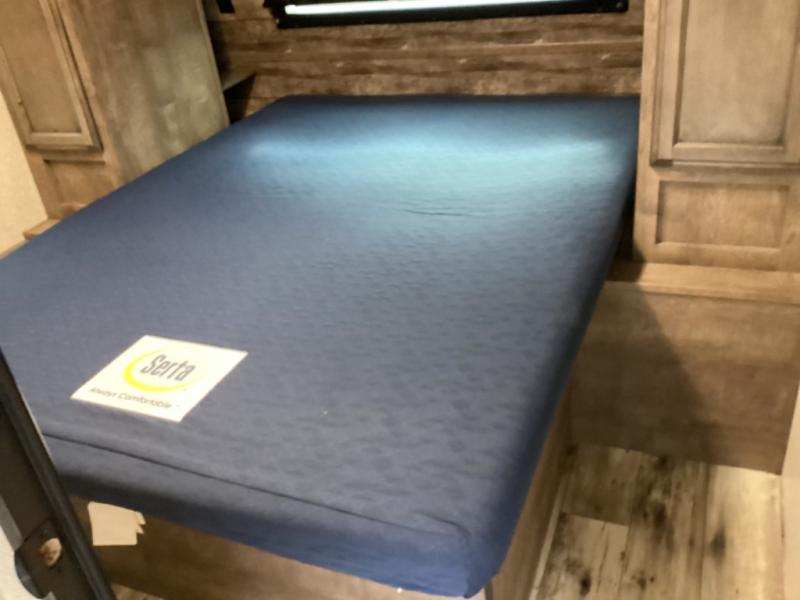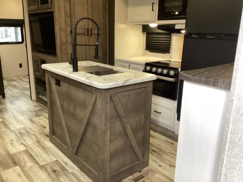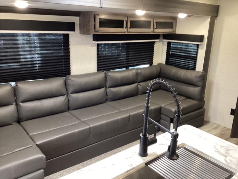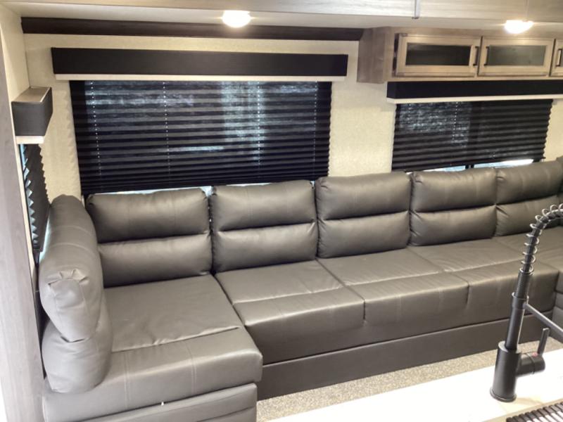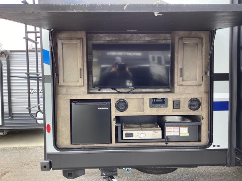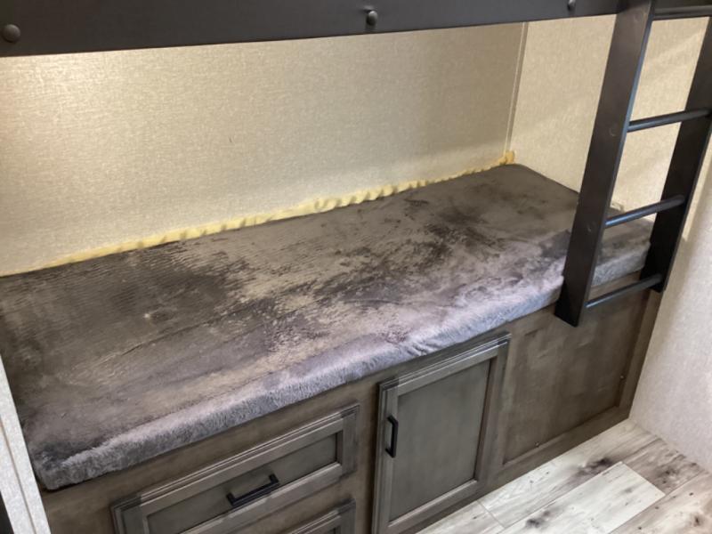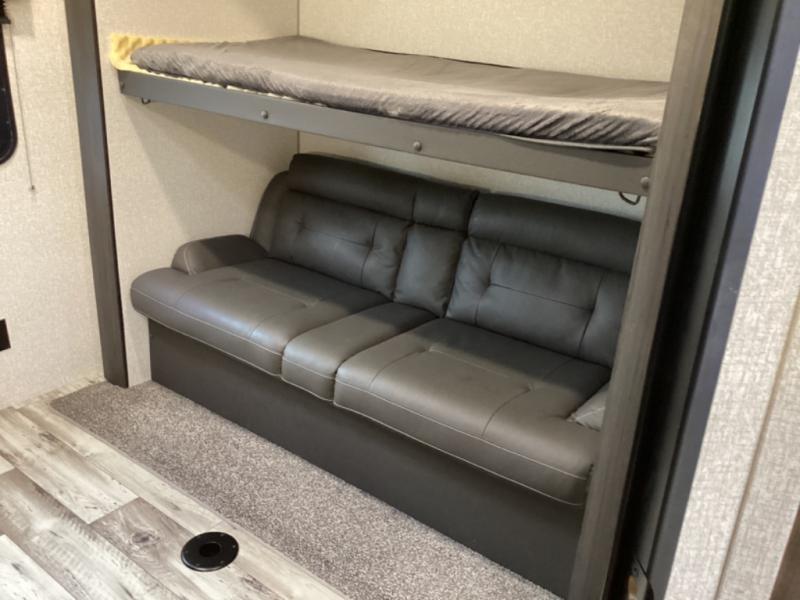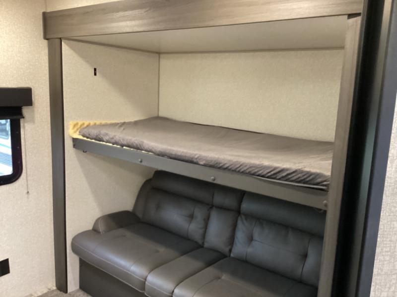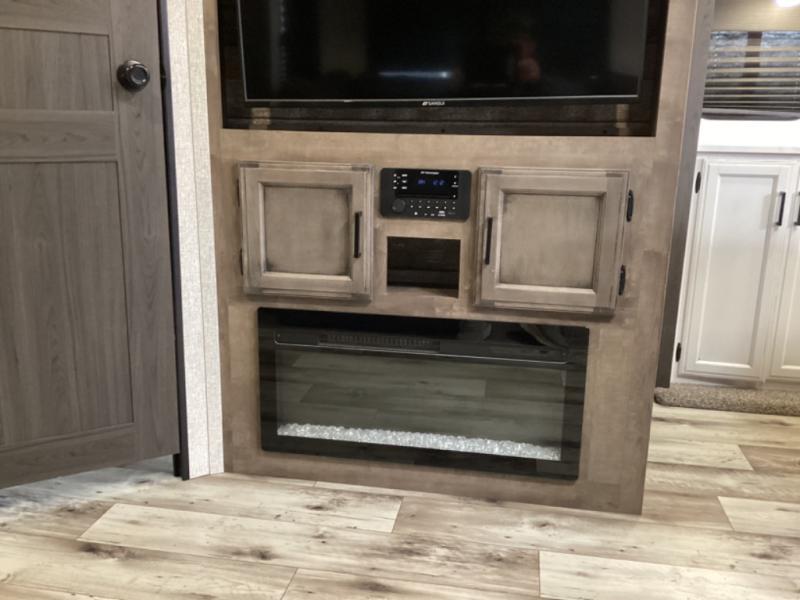 Stay protected rain or shine with the two 10' legless awnings with wind sensor on this travel trailer! Some other exterior features you will enjoy include a campfire café with a 38" TV to watch the big game while you grill steaks on the griddle, and the pass-through storage area with slam latch baggage doors will keep your gear in place. Inside there is a rear private bunkhouse with a closet, a 32" x 70" flip-up bunk above a 70" sofa with a table, and a 28" x 70" bunk above a 40" x 70" bottom bunk. The living area has a sofa across from an entertainment center with a 5,000 BTU frameless fireplace and a 40" TV with a swing arm so others can watch it from the 42" booth dinette. The dual entry bathroom has a 34" radius shower to freshen up in, and is easy to access, especially those staying in the front private bedroom!