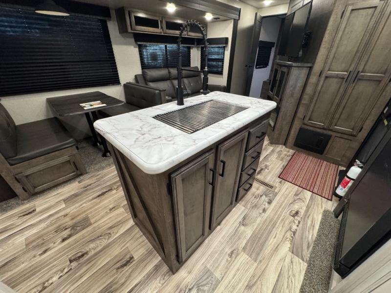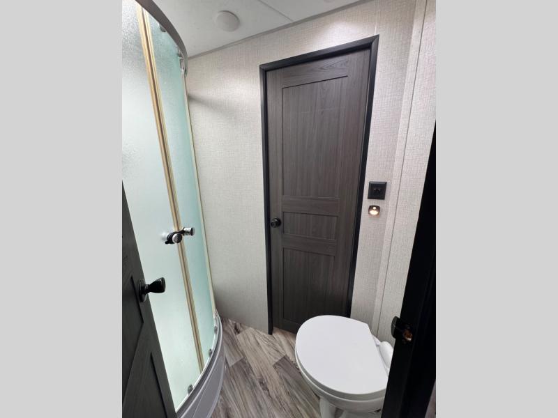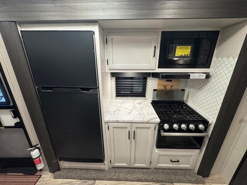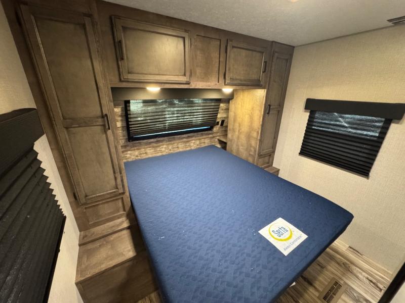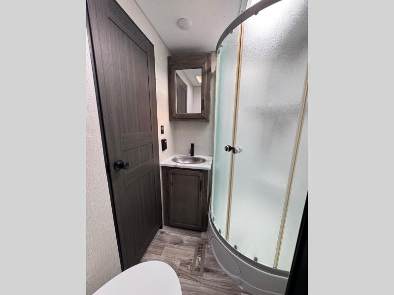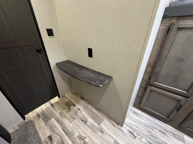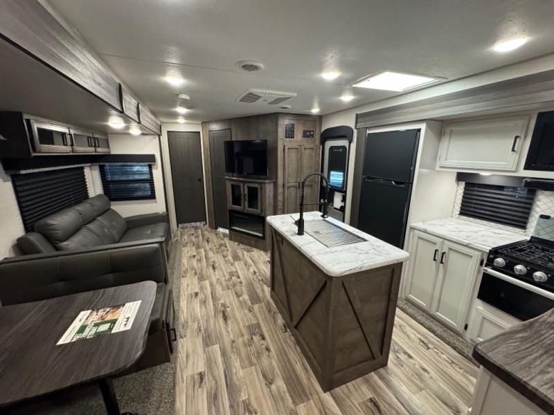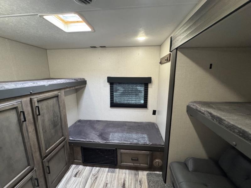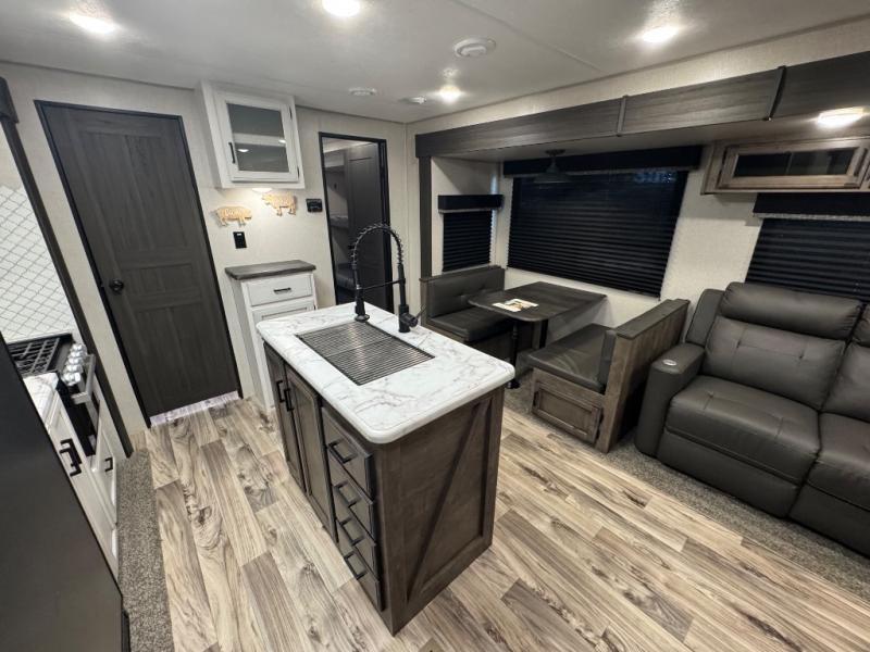 It's a clean decision with a bath and a half to take this travel trailer on your next camping trip! The rear private bunkhouse is decked out with a 28" x 70" bunk bed, a 32" x 70" top bunk, a 28" x 73" flip-up bunk above a 72" sofa with table, and a flip desk to do some school work. The half bathroom has an entrance/exit door so you can get back to cooking at the outdoor campfire café which has two 3 cu. ft. refrigerators, a sink, a griddle, and storage. Your clean up will be a breeze thanks to the kitchen island with a large sink and dish drying sink cover. If you need extra sleeping space then simply convert the 42" grand dinette and 70" sofa into sleeping spaces. Those staying in the front private bedroom will enjoy a good night's rest on the sleep tight queen bed and have the convenience of accessing the dual entry bathroom!