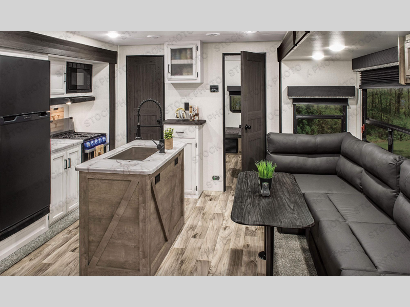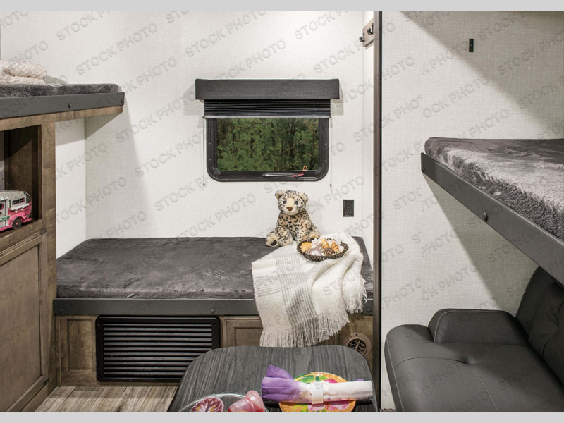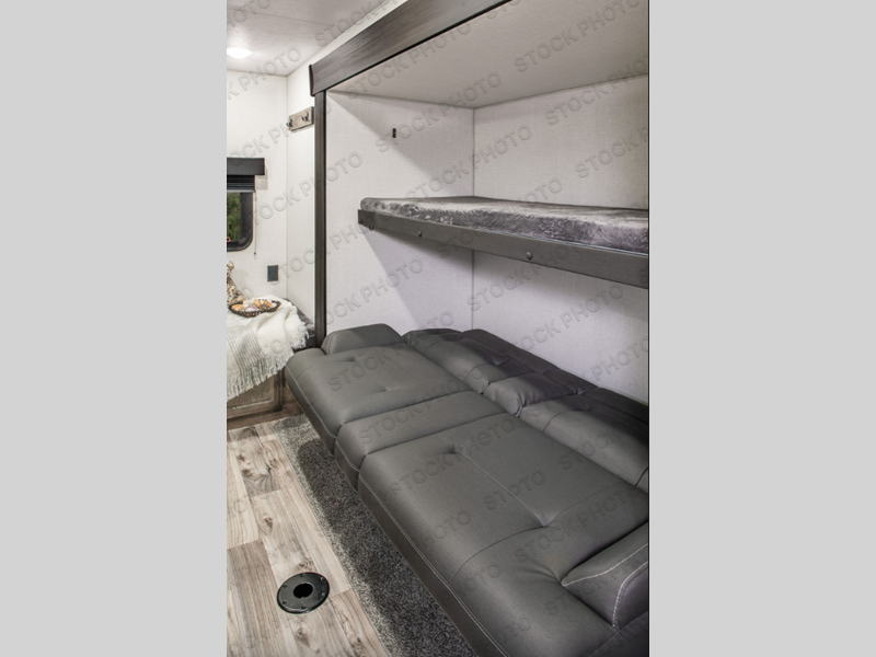It's a clean decision with a bath and a half to take this travel trailer on your next camping trip! The rear private bunkhouse is decked out with a 28" x 70" bunk bed, a 32" x 70" top bunk, a 28" x 73" flip-up bunk above a 72" sofa with table, and a flip desk to do some school work. The half bathroom has an entrance/exit door so you can get back to cooking at the outdoor campfire café which has two 3 cu. ft. refrigerators, a sink, a griddle, and storage. Your clean up will be a breeze thanks to the kitchen island with a large sink and dish drying sink cover. If you need extra sleeping space then simply convert the 42" grand dinette and 70" sofa into sleeping spaces. Those staying in the front private bedroom will enjoy a good night's rest on the sleep tight queen bed and have the convenience of accessing the dual entry bathroom!