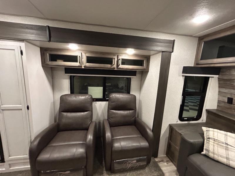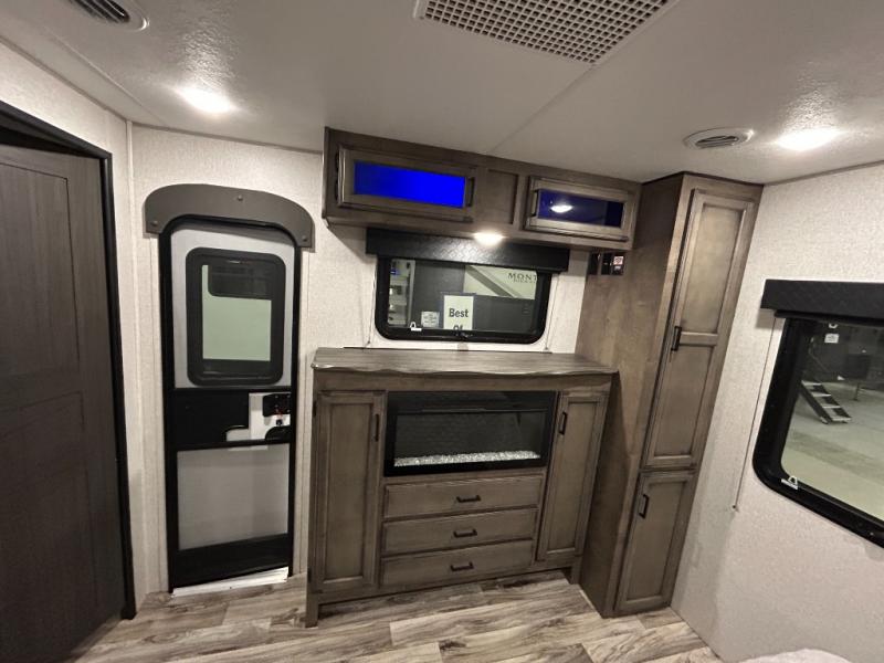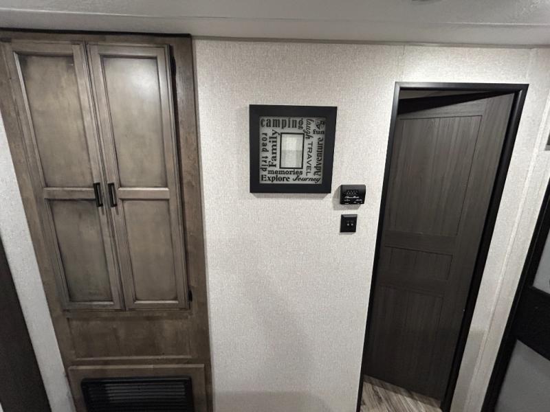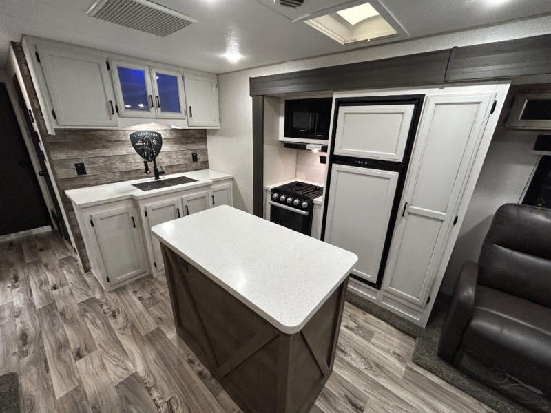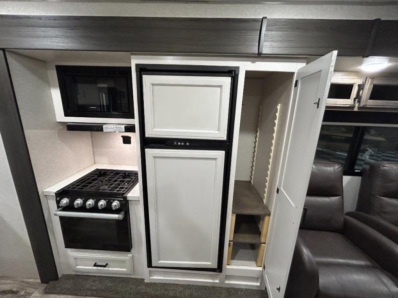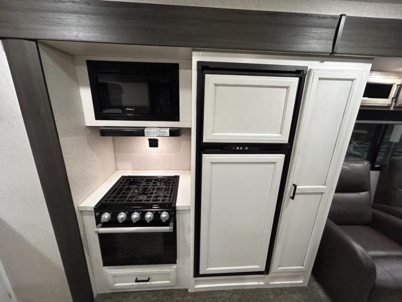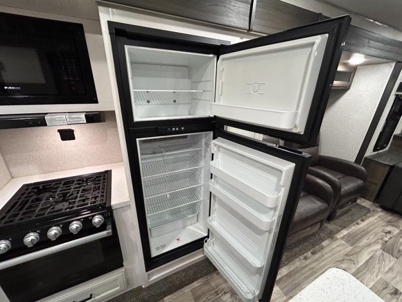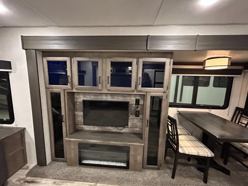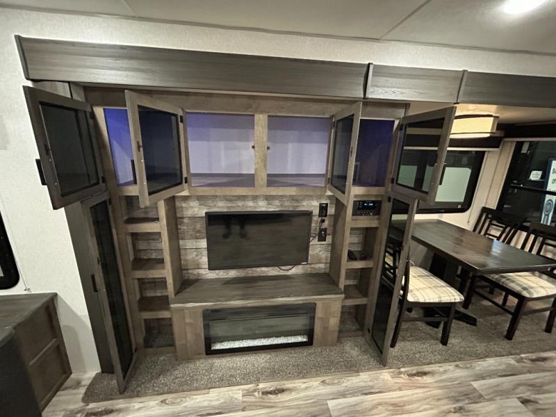 Come see why this travel trailer was awarded the "2022 Top RV Debut" by RV Business! Relax in true comfort in the front living area with a 70" tri-fold sofa with end tables on either side or in the theater seating across from the entertainment center with a TV and 30" frameless fireplace. The kitchen island will make your meal prepping easier and you can enjoy them at the table and chairs then play a card game or two. You could even cook your meals at the exterior campfire café with a refrigerator, a sink with countertop space, and a griddle. The full bathroom has a 30" x 36" shower for you to freshen up in each morning. Enjoy a good night's rest each night on the 70" x 80" sleep tight king bed slide across from a dresser with a 30" frameless fireplace in the rear private bedroom, plus there is a wardrobe that is prepped to add an optional washer and dryer and one of the dual entry doors with triple pull-out aluminum steps!