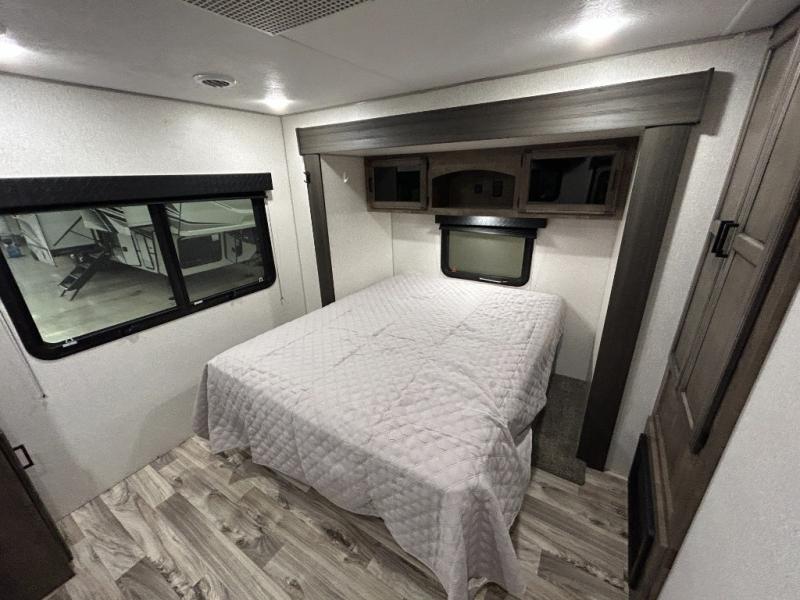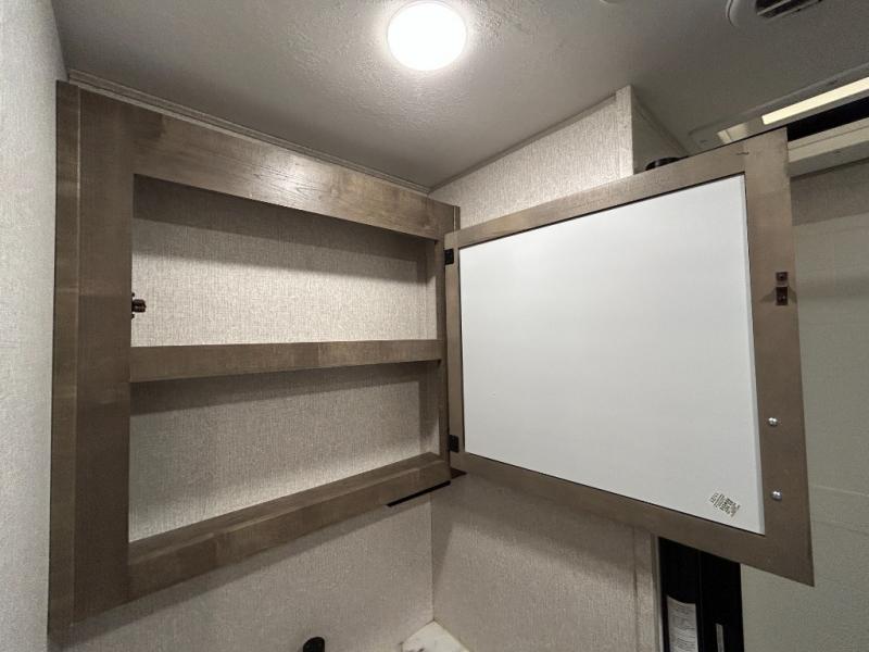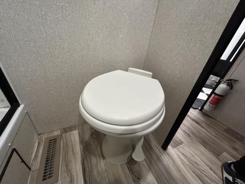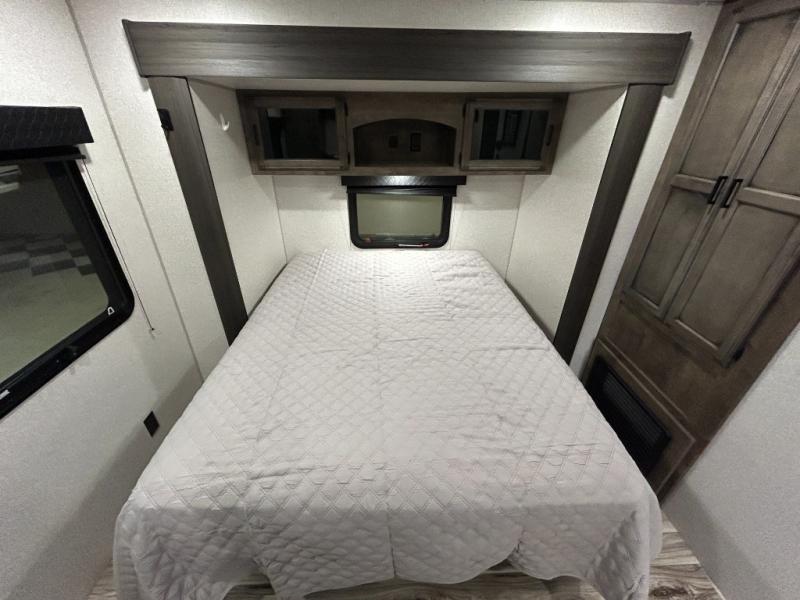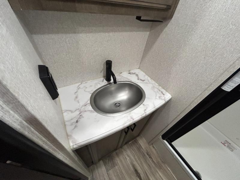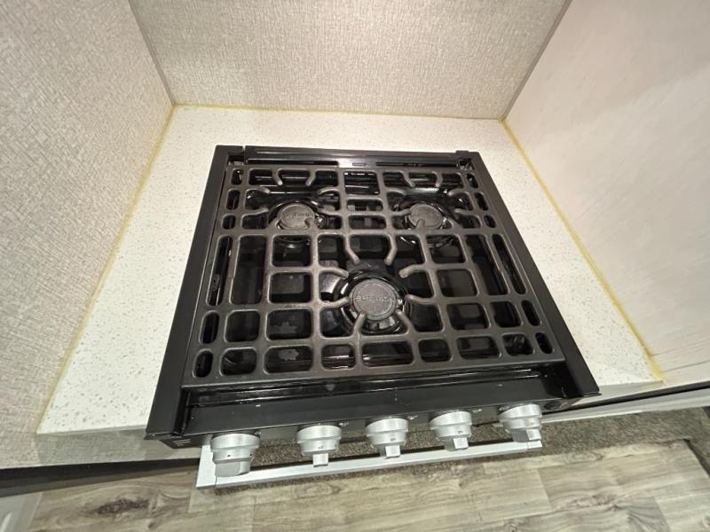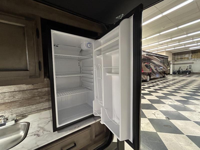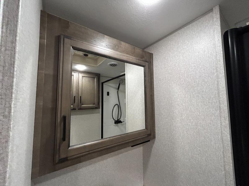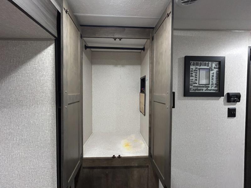 Come see why this travel trailer was awarded the "2022 Top RV Debut" by RV Business! Relax in true comfort in the front living area with a 70" tri-fold sofa with end tables on either side or in the theater seating across from the entertainment center with a TV and 30" frameless fireplace. The kitchen island will make your meal prepping easier and you can enjoy them at the table and chairs then play a card game or two. You could even cook your meals at the exterior campfire café with a refrigerator, a sink with countertop space, and a griddle. The full bathroom has a 30" x 36" shower for you to freshen up in each morning. Enjoy a good night's rest each night on the 70" x 80" sleep tight king bed slide across from a dresser with a 30" frameless fireplace in the rear private bedroom, plus there is a wardrobe that is prepped to add an optional washer and dryer and one of the dual entry doors with triple pull-out aluminum steps!