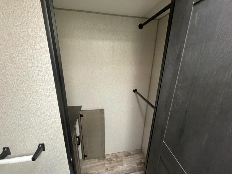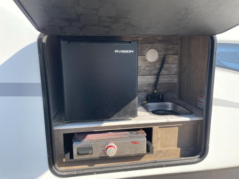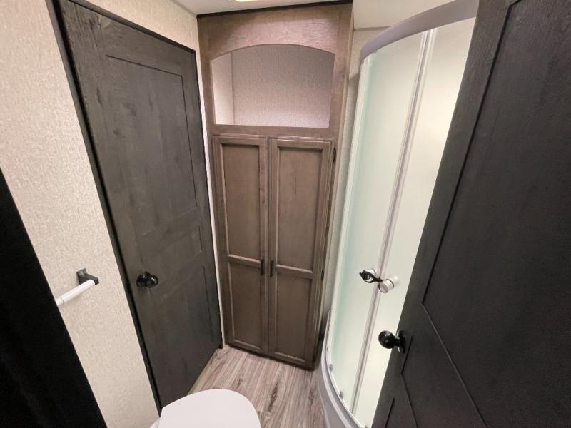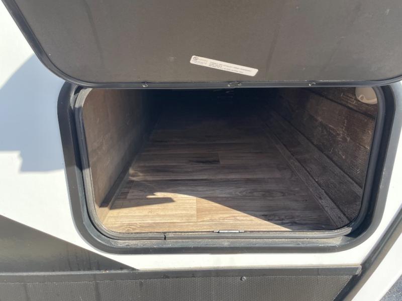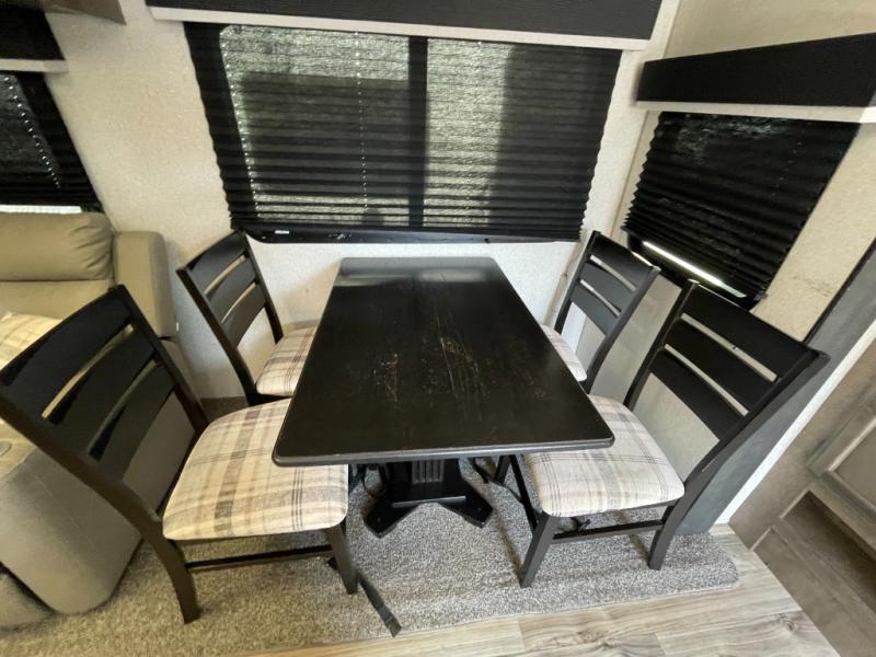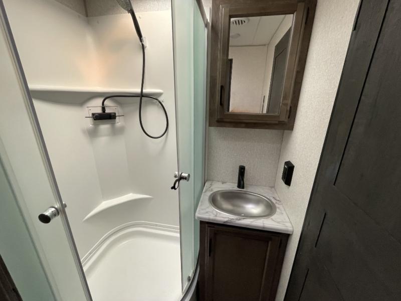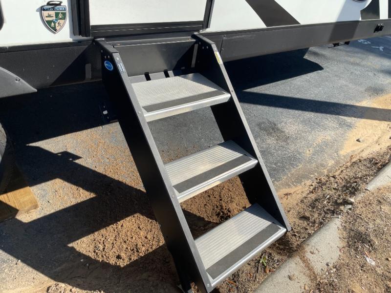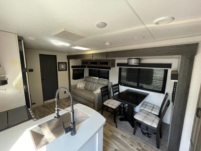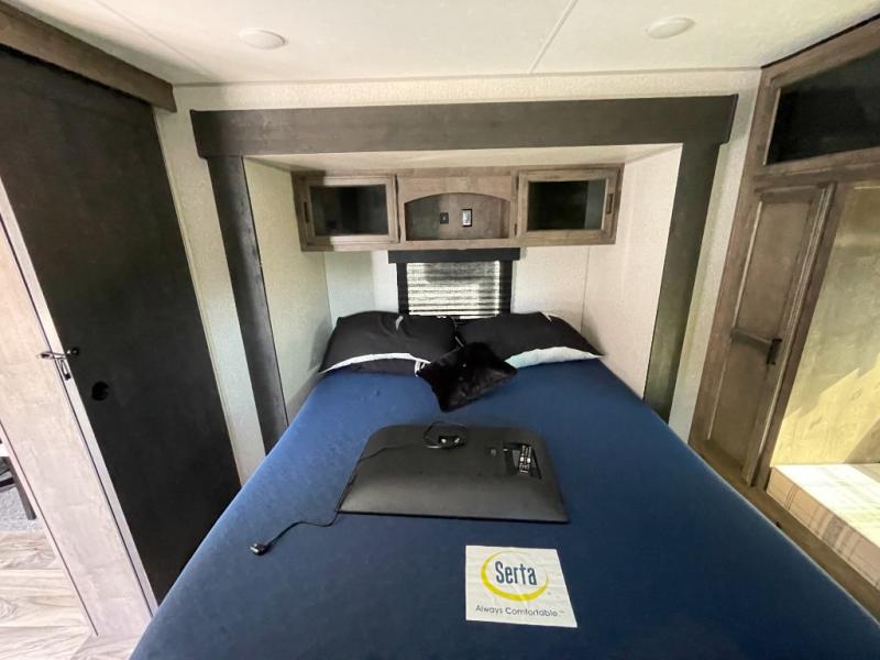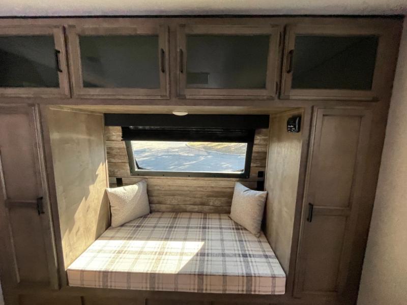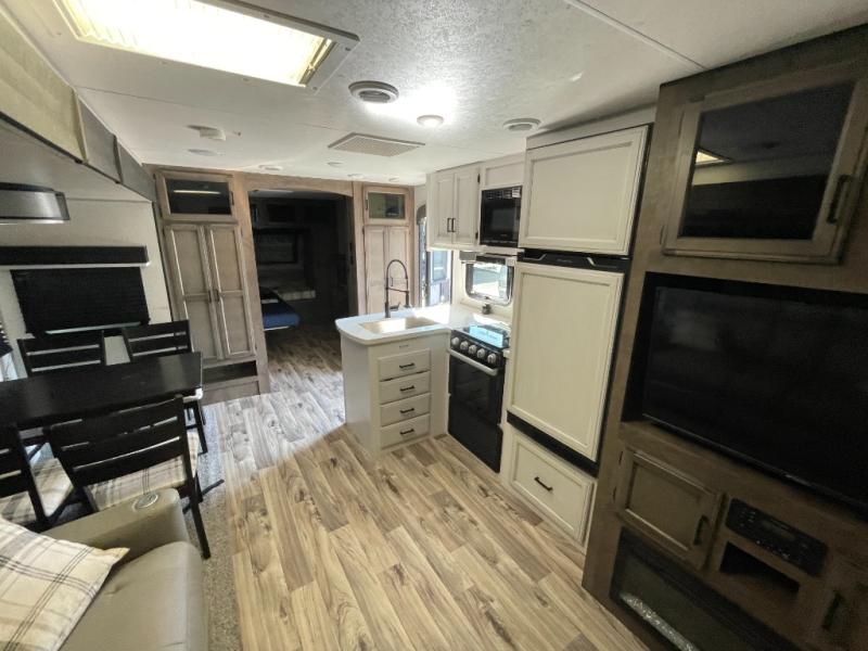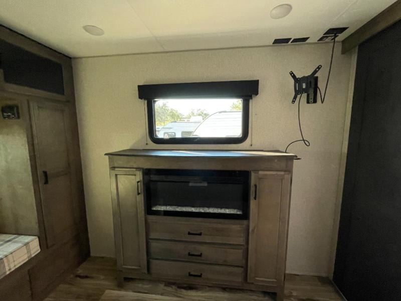 Sleep tight in this travel trailer with the 70" x 80" sleep tight king bed in the front private bedroom! The bedroom also has a dresser with a 30" frameless fireplace and TV, as well as a window seat for a view of your beautiful surroundings as you read a book. The chef can prepare their best meals inside with the three burner cooktop and 10 cu. ft. refrigerator or head to the exterior campfire café with a refrigerator, a griddle, and a sink for clean up while staying protected from the 20' power awning. Enjoy your meals at the table and chairs then relax on the 70" sofa to let your food settle while you watch a movie or the 30" frameless fireplace at the entertainment center. The full rear bathroom has a 34" radius shower to freshen up in each morning, a linen closet for your towels, and a closet that has a dresser with a mirror and an area prepped to add an optional washer and dryer!