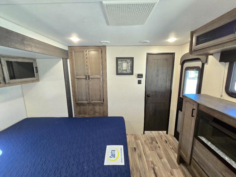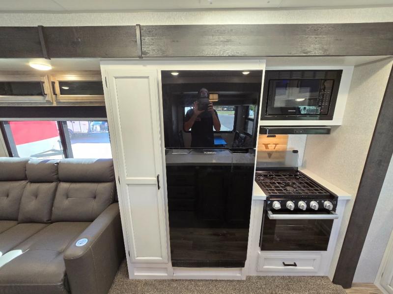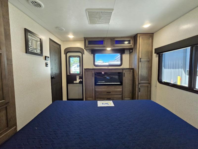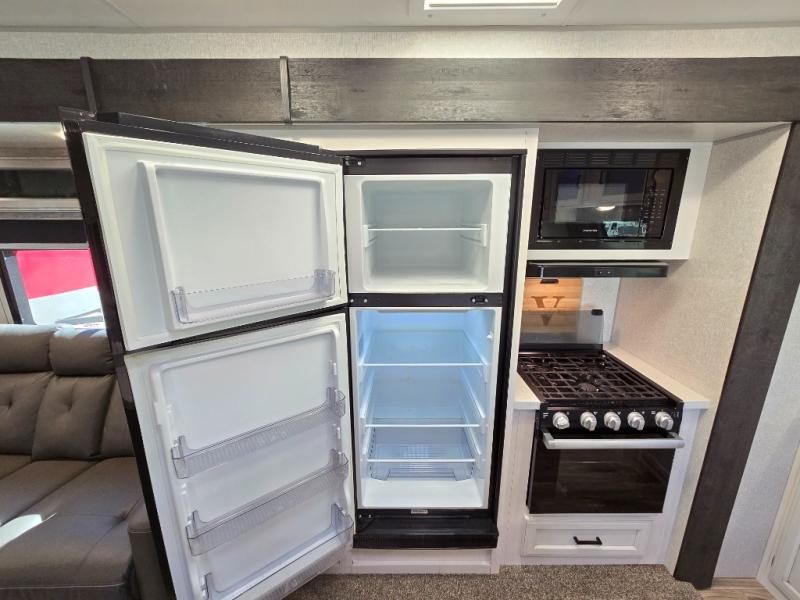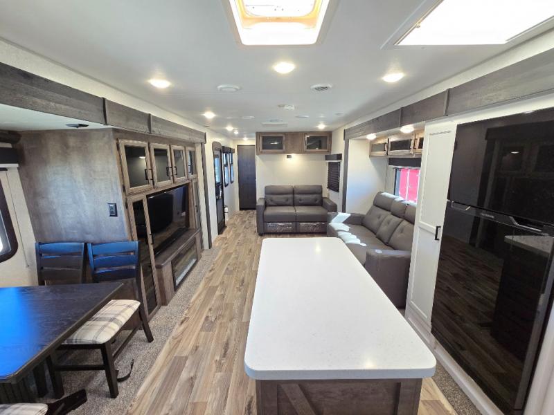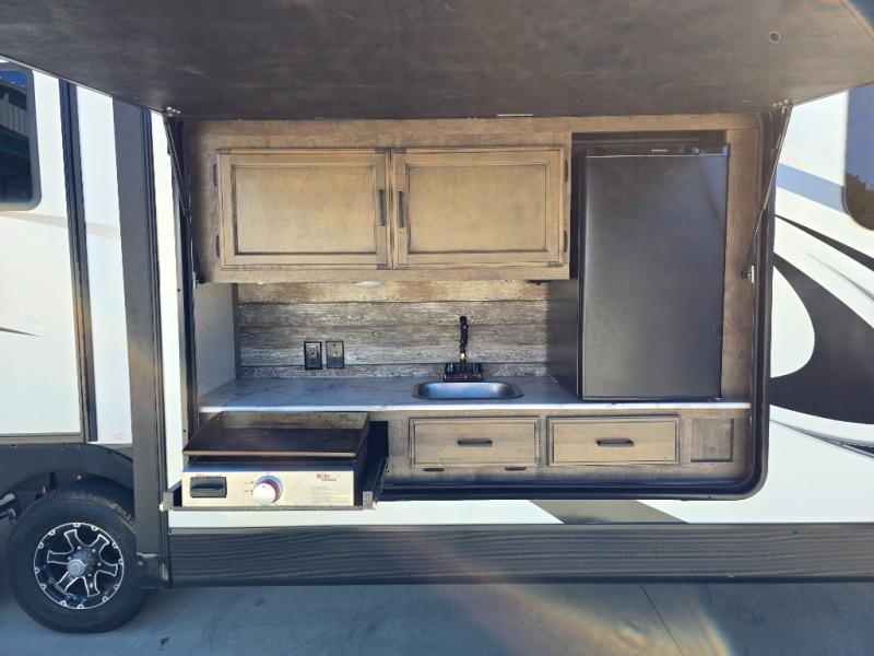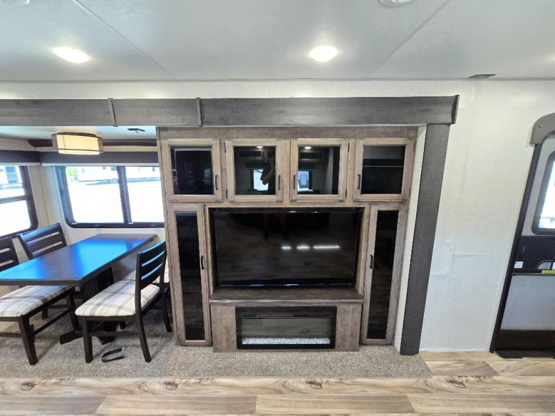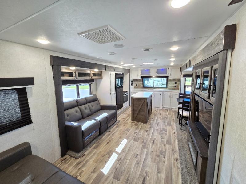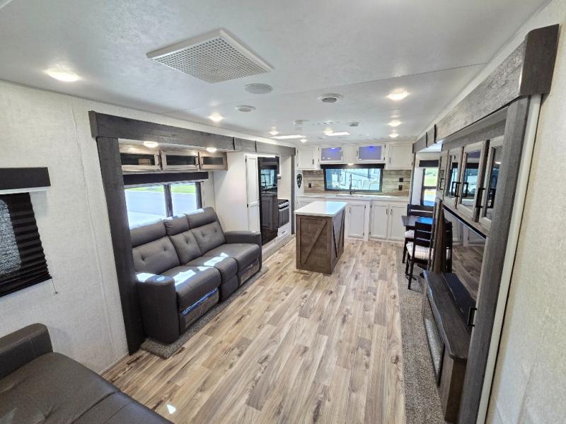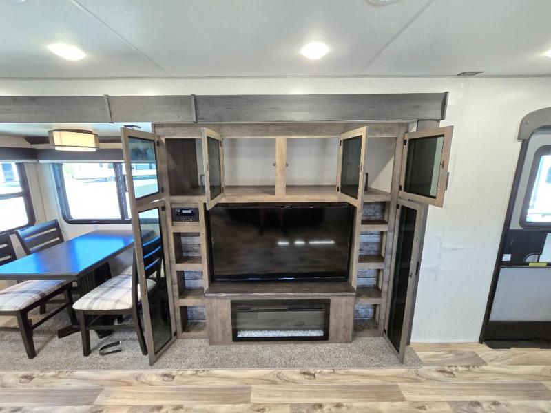 Comfort and convenience is what you will find all throughout this travel trailer! The front kitchen has a large single-bowl under-mount stainless steel sink with lots of countertop space on either side of it, a three burner cooktop, a 10 cu. ft. refrigerator to keep your perishables fresh, a pantry for your snacks, and a kitchen island to make meal prepping even easier. You can enjoy your meals at the table and chairs then relax on either the 64" sofa or theater seating with USB charging while your food settles as you watch a movie or the 30" frameless fireplace at the entertainment center. You will feel right at home in the rear private bedroom with a 70" x 80" sleep tight king bed slide, a dresser with a 30" frameless fireplace, and a wardrobe that is prepped to add an optional washer and dryer, plus you even have an entrance/exit door to the unit with triple pull-out aluminum steps. There is an exterior campfire café with a refrigerator, a sink with countertop space, and a griddle for juicy burgers!