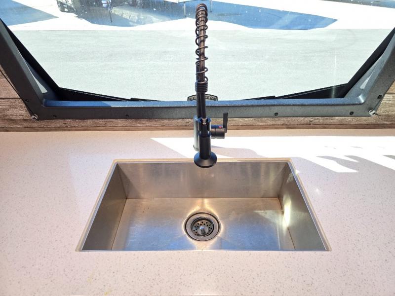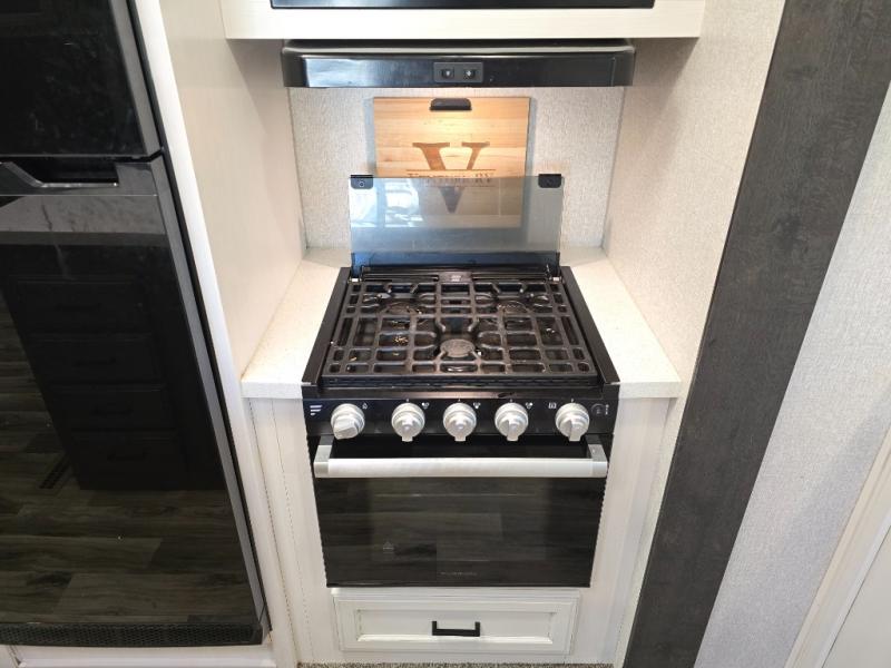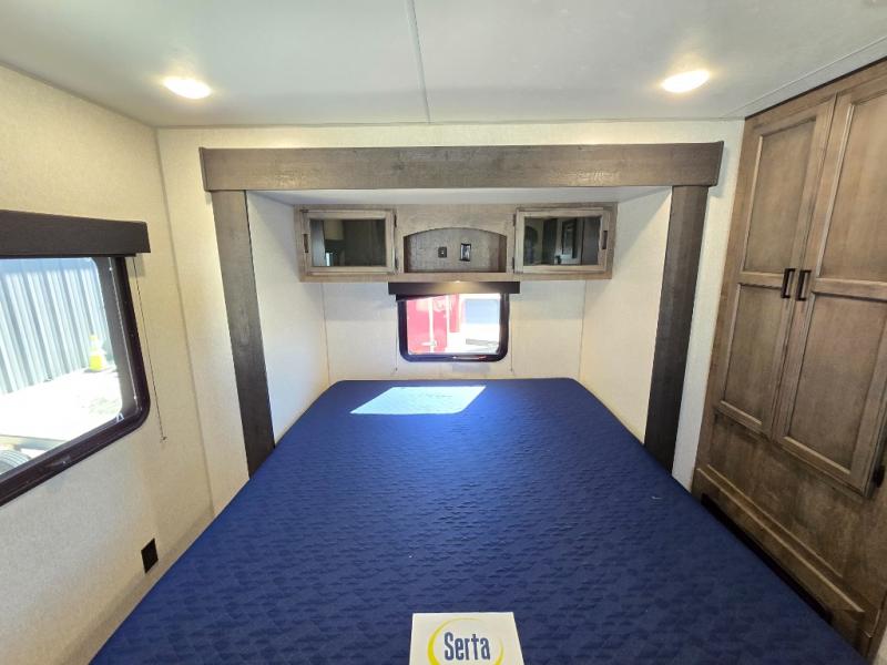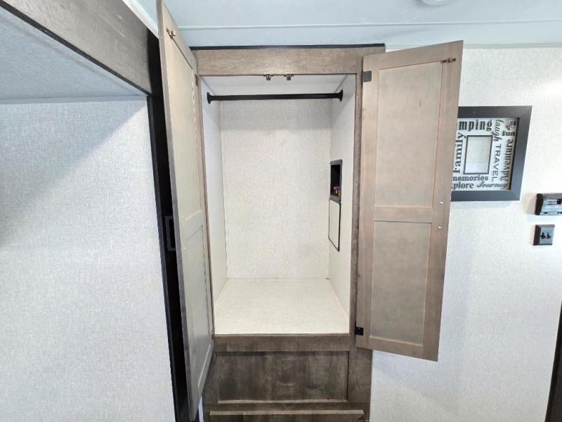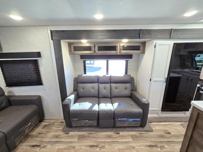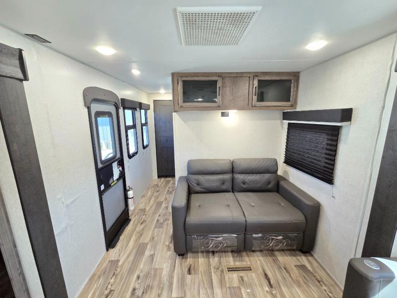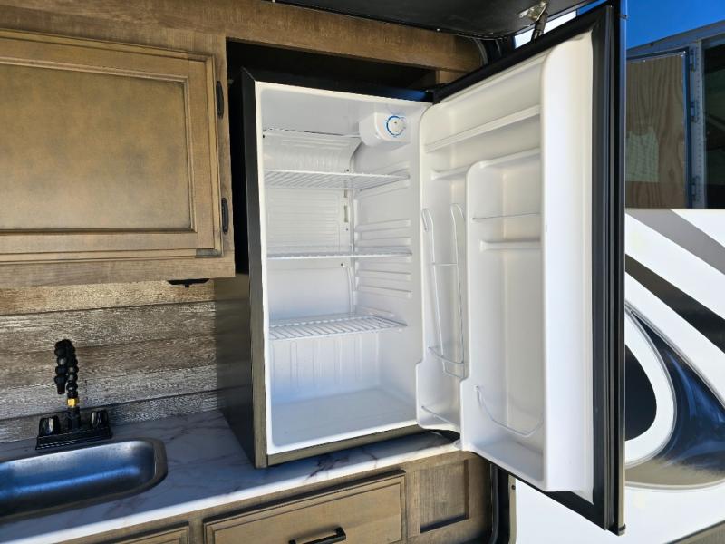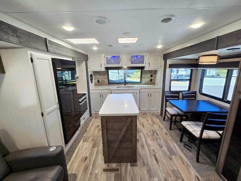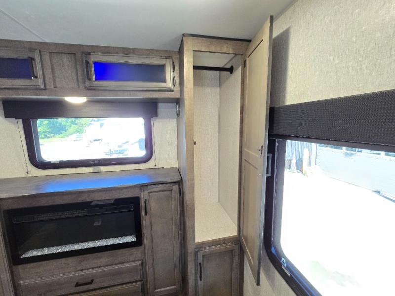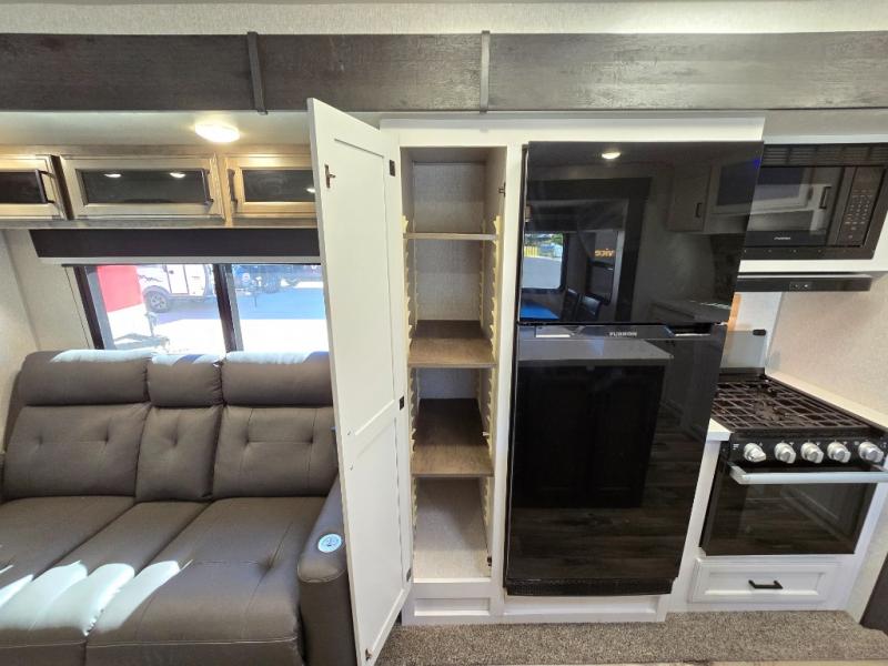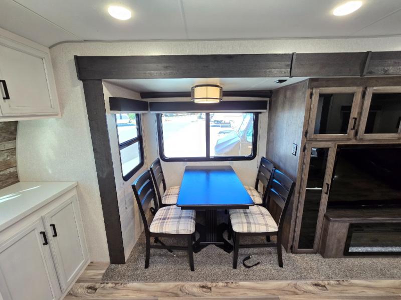 Comfort and convenience is what you will find all throughout this travel trailer! The front kitchen has a large single-bowl under-mount stainless steel sink with lots of countertop space on either side of it, a three burner cooktop, a 10 cu. ft. refrigerator to keep your perishables fresh, a pantry for your snacks, and a kitchen island to make meal prepping even easier. You can enjoy your meals at the table and chairs then relax on either the 64" sofa or theater seating with USB charging while your food settles as you watch a movie or the 30" frameless fireplace at the entertainment center. You will feel right at home in the rear private bedroom with a 70" x 80" sleep tight king bed slide, a dresser with a 30" frameless fireplace, and a wardrobe that is prepped to add an optional washer and dryer, plus you even have an entrance/exit door to the unit with triple pull-out aluminum steps. There is an exterior campfire café with a refrigerator, a sink with countertop space, and a griddle for juicy burgers!