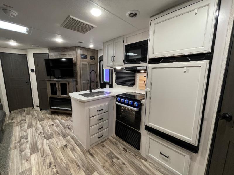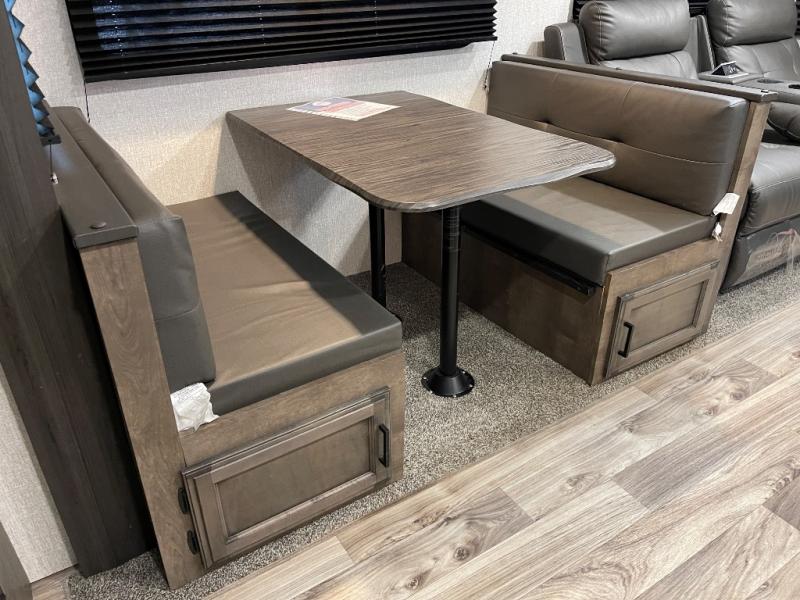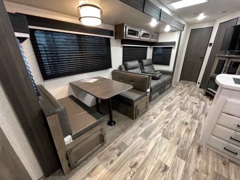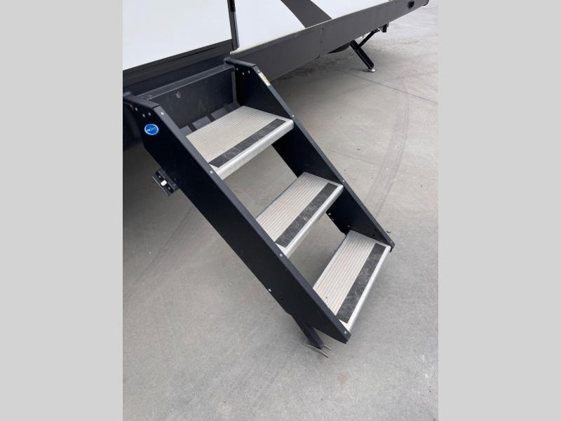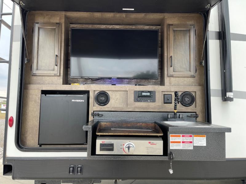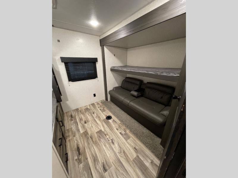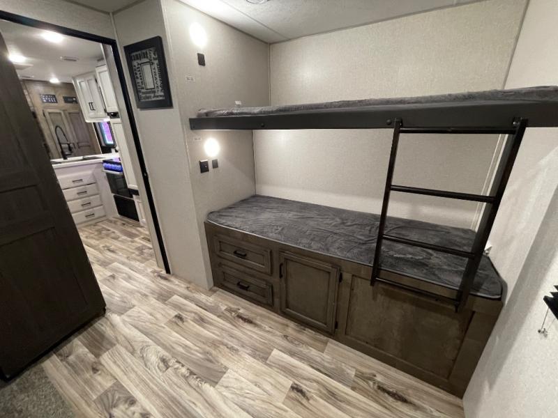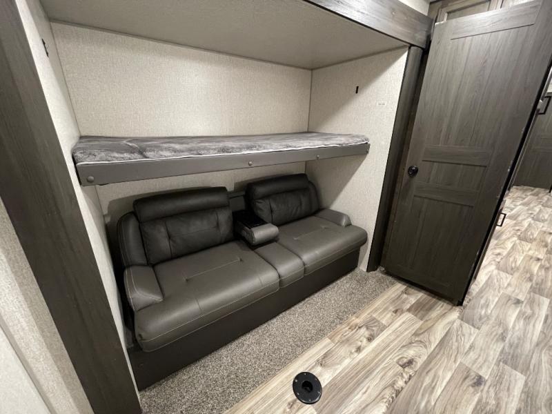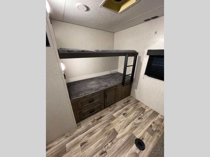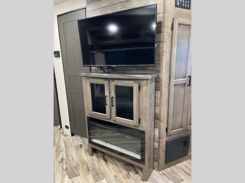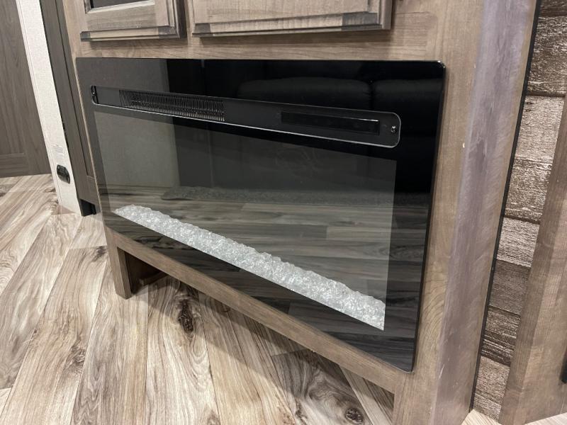 The whole family can camp together in this travel trailer! It features a rear private bunkhouse with a 28" x 70" top bunk above a 40" x 70" bottom bunk, a closet, and a 28" x 73" flip up top bunk above a 70" sofa with table slide. One of the dual entry doors leads directly into the half bathroom with fold-out aluminum steps so you can get back to having fun faster. The chef can prepare their best meals for the crew either indoors with the three burner cooktop or at the exterior campfire café with a 40" TV/DVD/speakers to entertain them while they cook. Everyone can gather together at the 42" grand dinette and 70" tri-fold sofa across from the entertainment center with a fireplace for a cozy evening. The dual entry bathroom is easy to access, especially for those staying in the front private bedroom. You even have a coat closet next to the main entrance to limit the clutter!