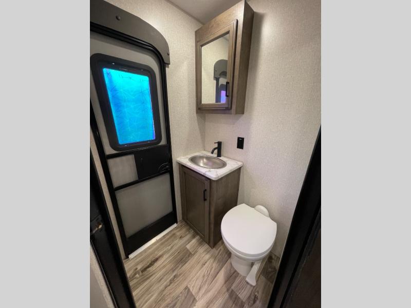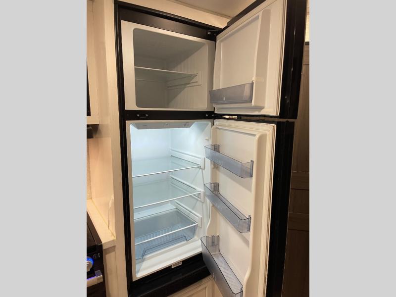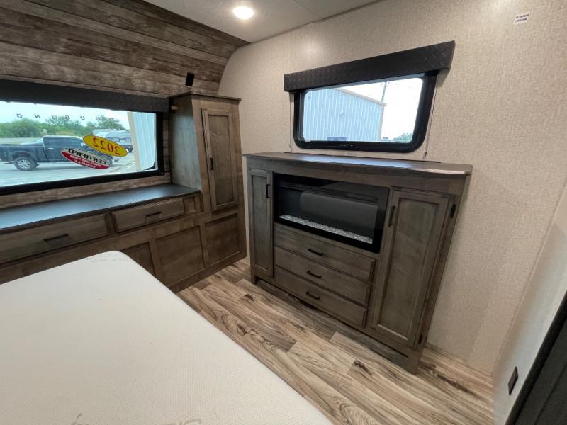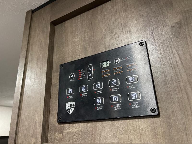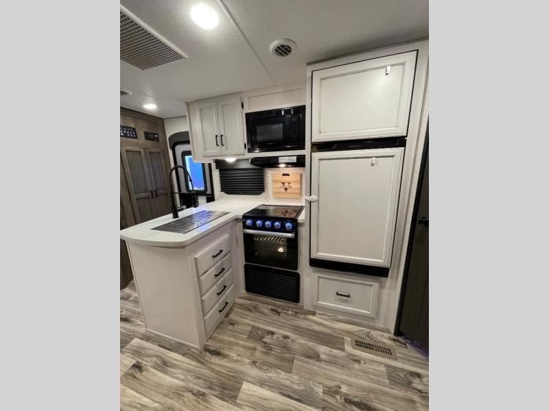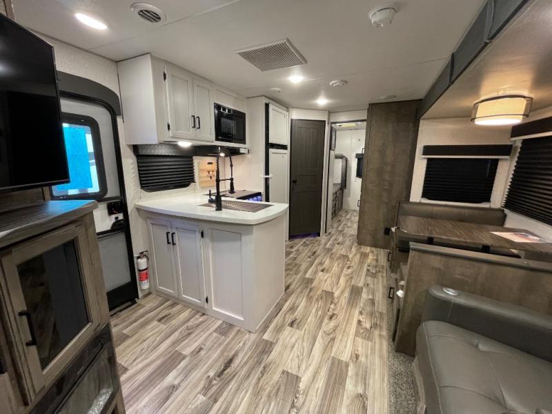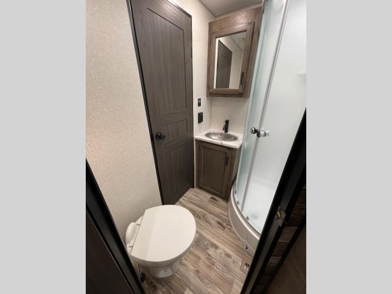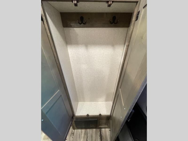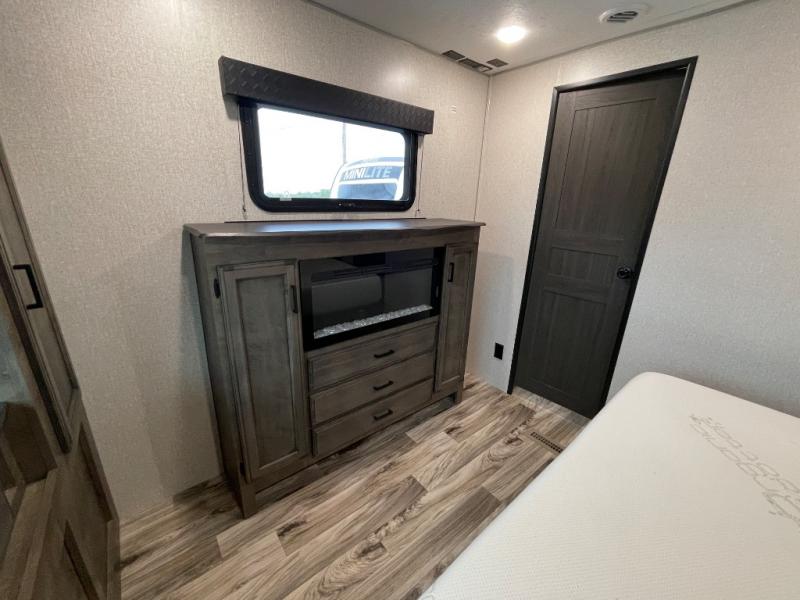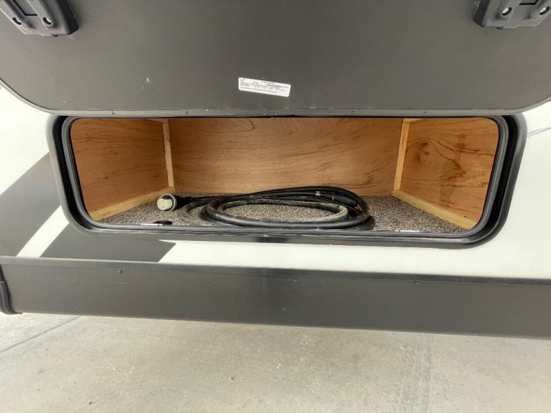 The whole family can camp together in this travel trailer! It features a rear private bunkhouse with a 28" x 70" top bunk above a 40" x 70" bottom bunk, a closet, and a 28" x 73" flip up top bunk above a 70" sofa with table slide. One of the dual entry doors leads directly into the half bathroom with fold-out aluminum steps so you can get back to having fun faster. The chef can prepare their best meals for the crew either indoors with the three burner cooktop or at the exterior campfire café with a 40" TV/DVD/speakers to entertain them while they cook. Everyone can gather together at the 42" grand dinette and 70" tri-fold sofa across from the entertainment center with a fireplace for a cozy evening. The dual entry bathroom is easy to access, especially for those staying in the front private bedroom. You even have a coat closet next to the main entrance to limit the clutter!
