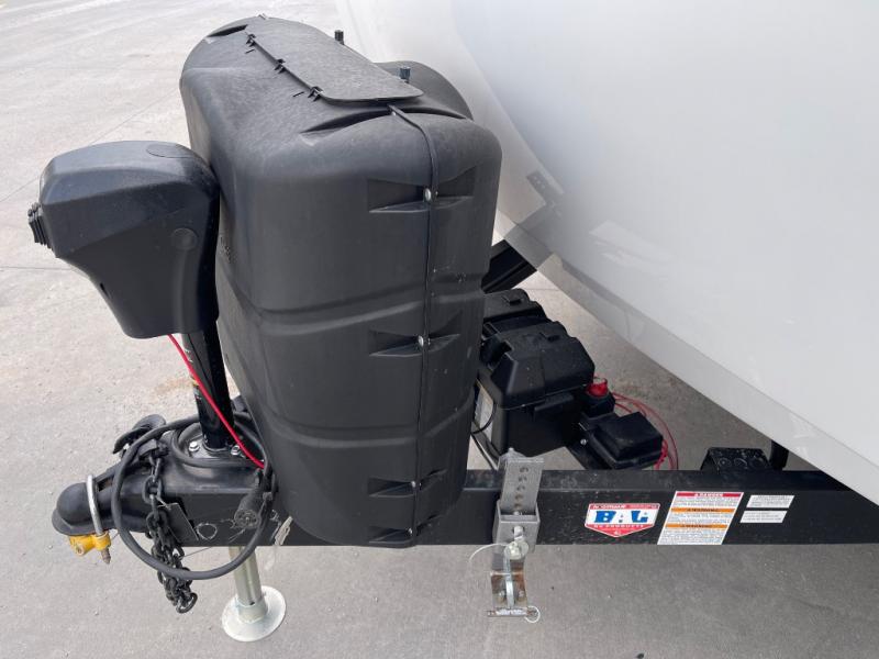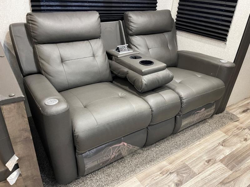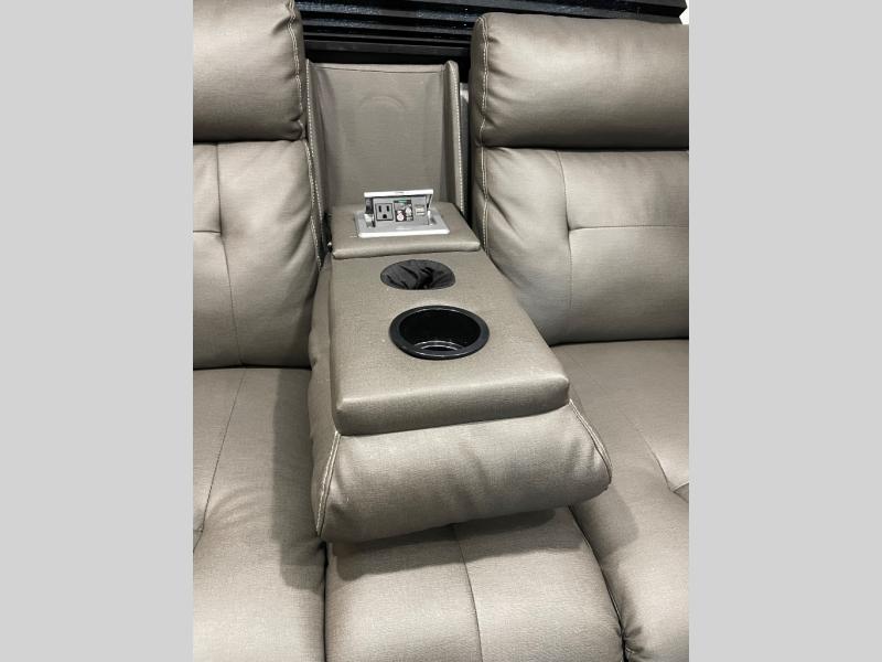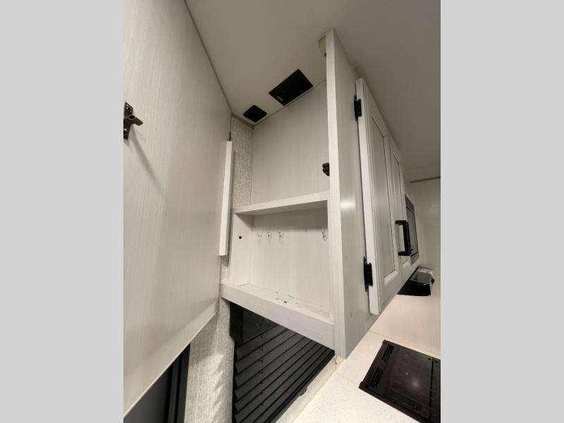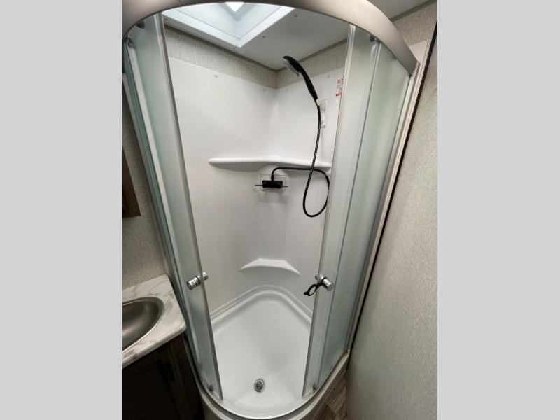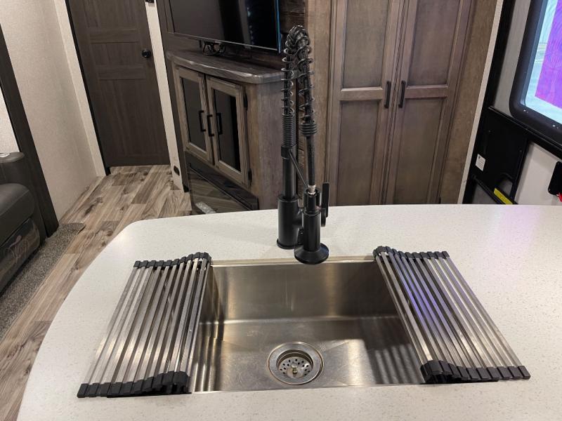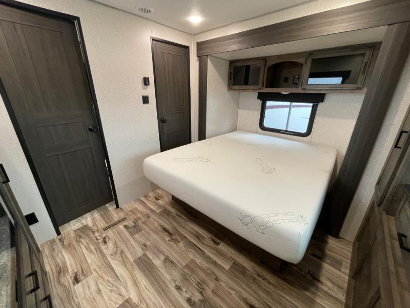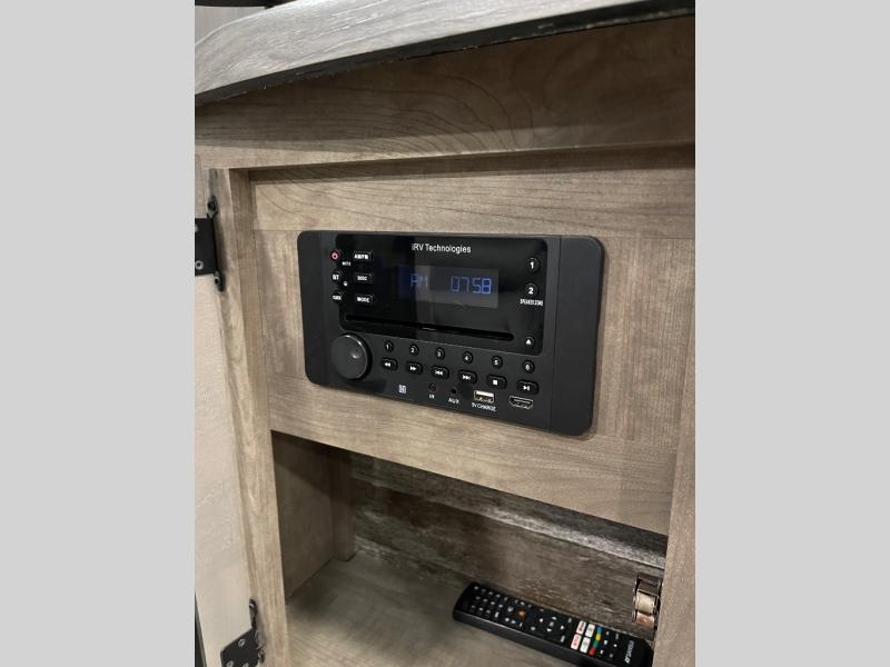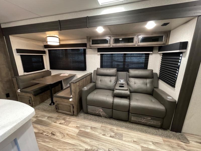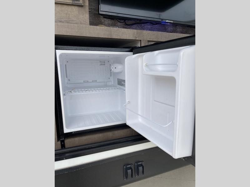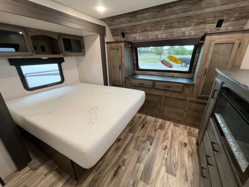 The whole family can camp together in this travel trailer! It features a rear private bunkhouse with a 28" x 70" top bunk above a 40" x 70" bottom bunk, a closet, and a 28" x 73" flip up top bunk above a 70" sofa with table slide. One of the dual entry doors leads directly into the half bathroom with fold-out aluminum steps so you can get back to having fun faster. The chef can prepare their best meals for the crew either indoors with the three burner cooktop or at the exterior campfire café with a 40" TV/DVD/speakers to entertain them while they cook. Everyone can gather together at the 42" grand dinette and 70" tri-fold sofa across from the entertainment center with a fireplace for a cozy evening. The dual entry bathroom is easy to access, especially for those staying in the front private bedroom. You even have a coat closet next to the main entrance to limit the clutter!