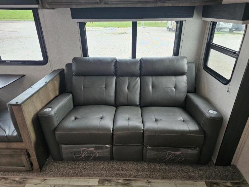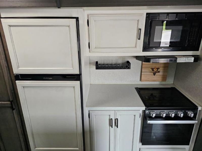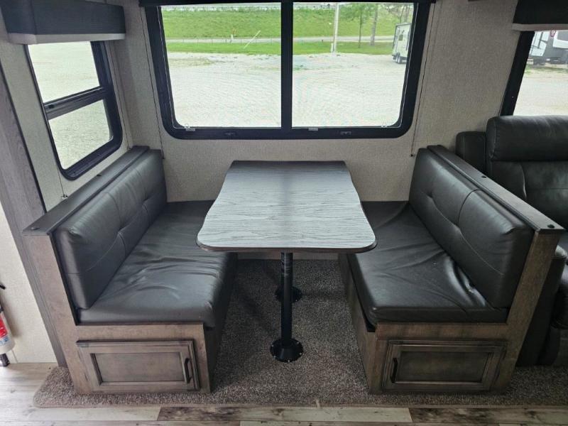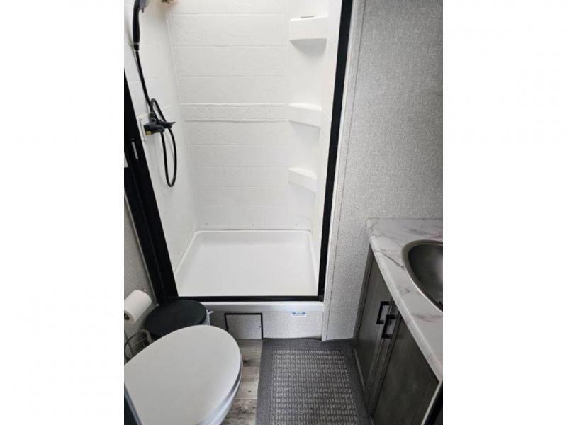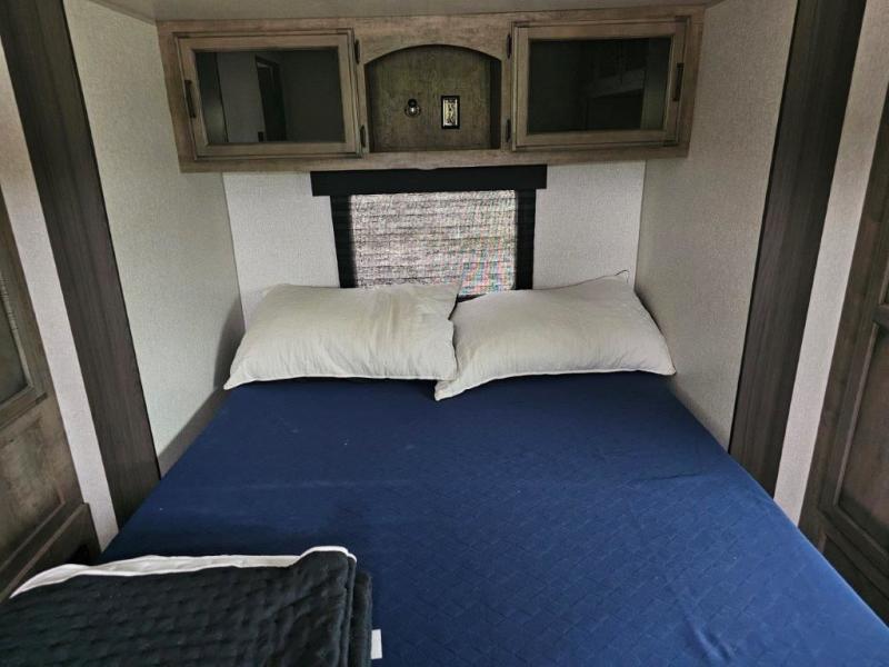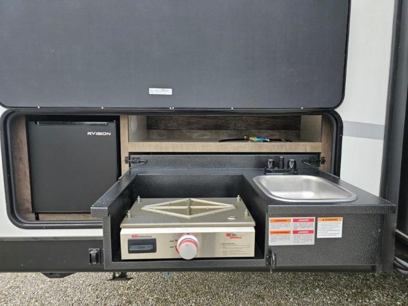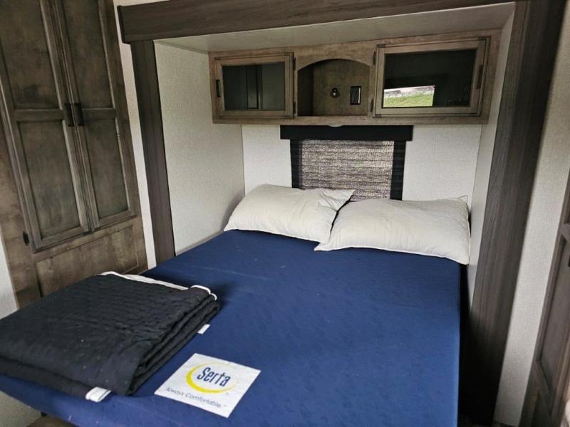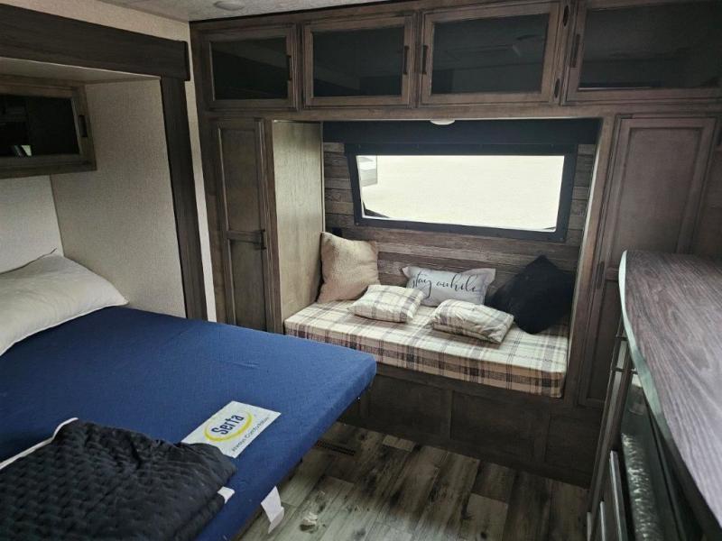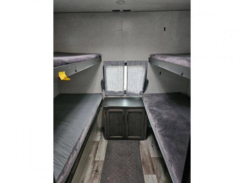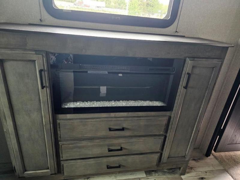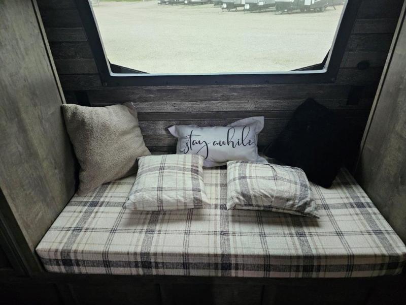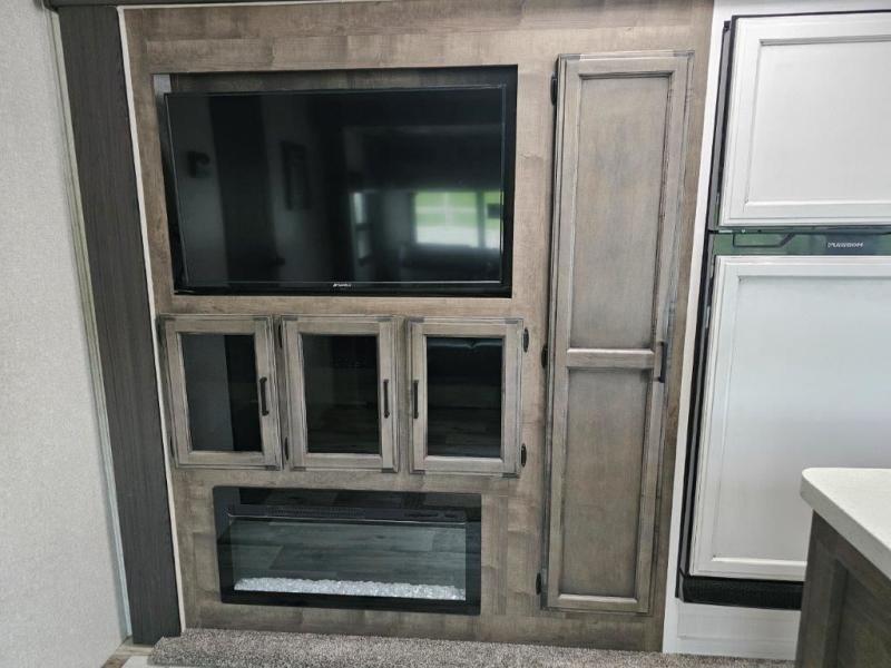 This travel trailer was awarded "2022 Bunkhouse Travel Trailer of the Year" for good reason! The rear private bunkhouse has a set of 32" x 70" bunk beds and a set of 28" x 70" flip up bunk beds, but what is really special about this room is its ability to convert to a desk, king bed, storage, and pet palace. The chef will enjoy having their choice of either cooking indoors with the kitchen island and three burner cooktop or cooking at the exterior campfire café with a refrigerator, a griddle, and a sink with countertop space. Relax each night in true comfort with a 70" tri-fold sofa across from the entertainment center with a 30" frameless fireplace, plus the front private bedroom has a 30" frameless fireplace across from a 60" x 80" queen bed slide. The bedroom also has a window seat so you can look out at your beautiful scenery while reading a book and an interior wall wardrobe that is prepped to add an optional washer and dryer instead if you choose!