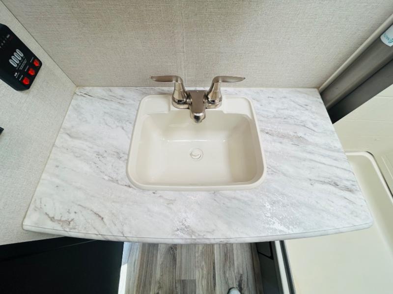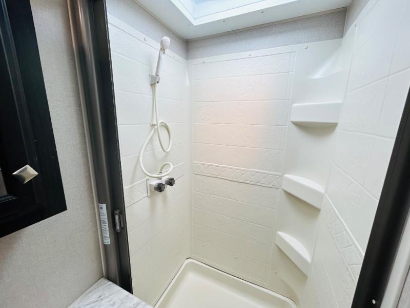 Pack your bags and hitch up this travel trailer for a great weekend camping trip! The front private bedroom has a 70" x 80" sleep tight king bed slide to lay your head at night, a dresser with a 30" frameless fireplace, a window seat with shelves on either side for your books, and a wardrobe that is prepped to add an optional washer and dryer for an extended trip. Freshen up each morning in the full bathroom with the 30" x 36" shower then head to the kitchen to fry up some eggs on the three burner cooktop and pour a cold glass of orange juice stored in the 10 cu. ft. refrigerator. The kitchen island will make your meal prepping easier and the table and chairs offer a comfortable place to enjoy your meals or play card games. You could even cook your meals at the exterior campfire café and set up a table underneath one of the two power awnings!