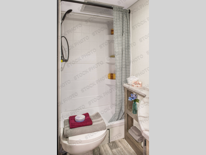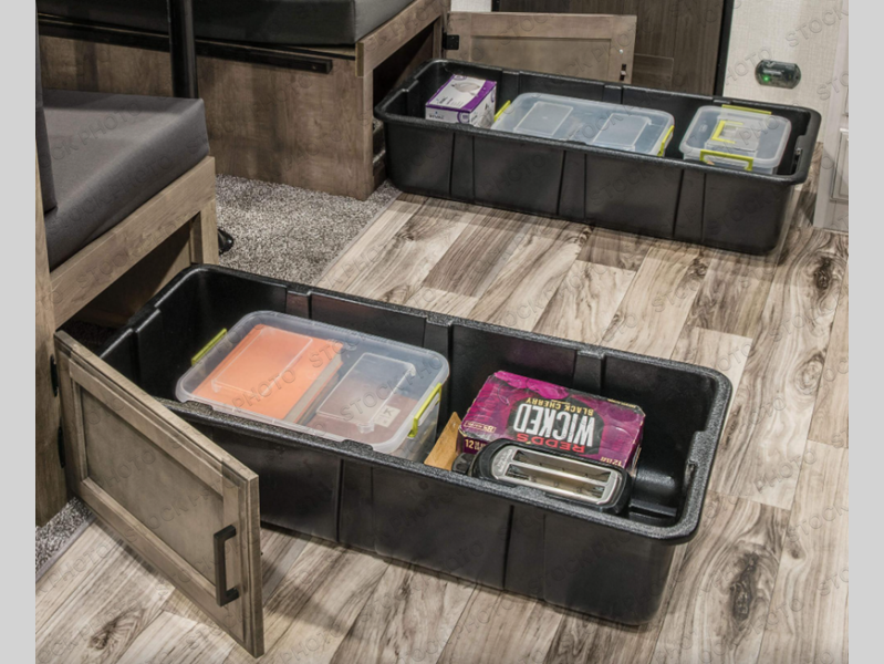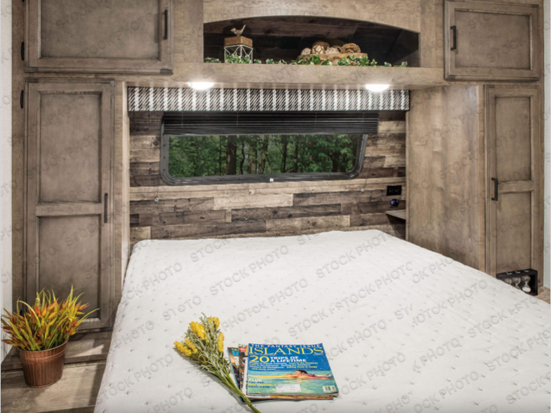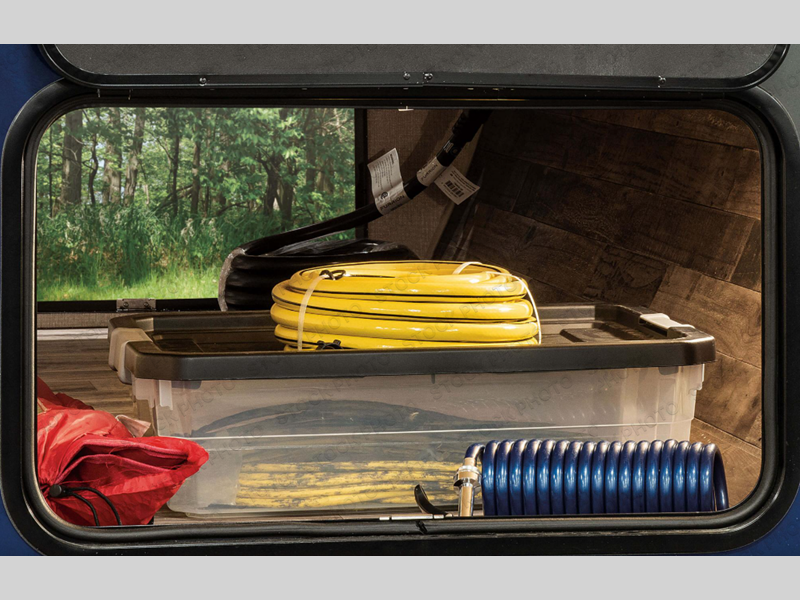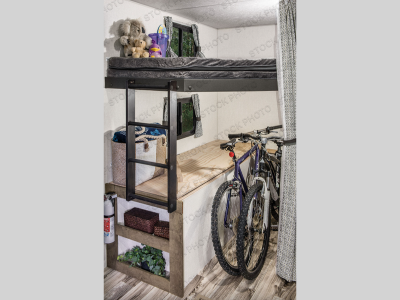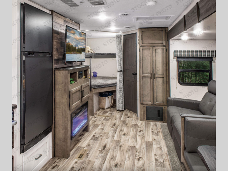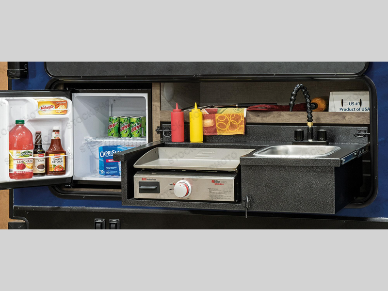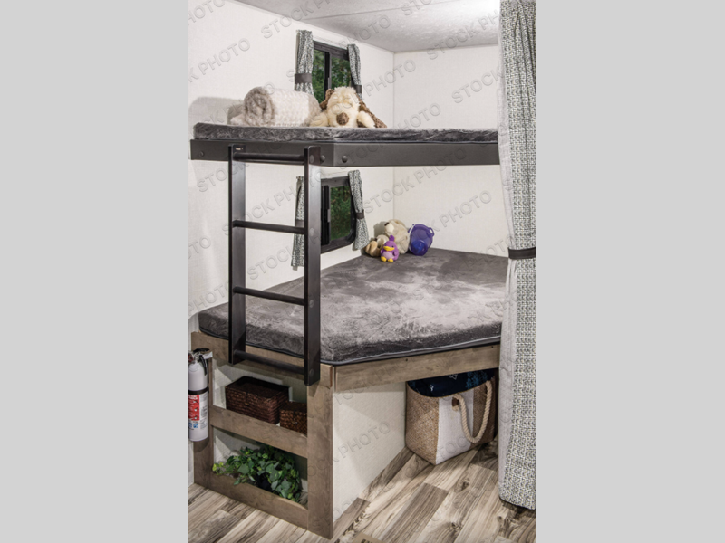 The whole family will have a fun time camping in this travel trailer! You will appreciate having your own privacy with the front private bedroom that has a sleep tight queen bed to lay your head at night and wardrobes on either side to hang your clothes. The kids can sleep on the set of 51" x 75" double bed over double bunk beds and can even invite a friend or two to tag along and sleep on either the 70" sofa or the 42" booth dinette once they are converted. Everyone can freshen up in the rear corner bathroom with the 30" x 36" shower. Behind the entertainment center is a walk-in pantry with coat hooks so you can store your jacket and canned goods in one place. The chef will enjoy cooking at the outside campfire café with the griddle, the refrigerator, and the sink!