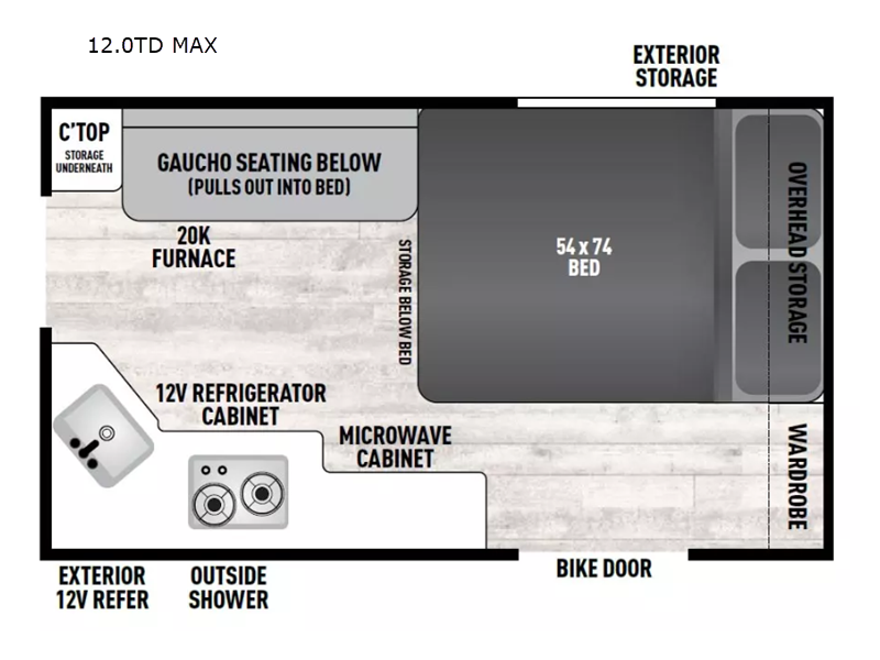 Last minute plans to explore the outdoors can happen with this teardrop! Even when you are headed to the campsite, you might need to get to something from inside the camper at a stop. Just use the side bike door without having to raise the roof. There is sleeping for two on the full size bed, and the sofa will even accommodate one more person. You can make warm meals on the two burner range, wash dishes and brush your teeth using the sink, and store leftovers in the 12V 1.7 cu. ft. refrigerator underneath. You will also enjoy Off-Road Package that comes with a flipped axle and 15" off-road tires!