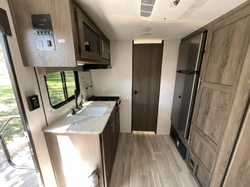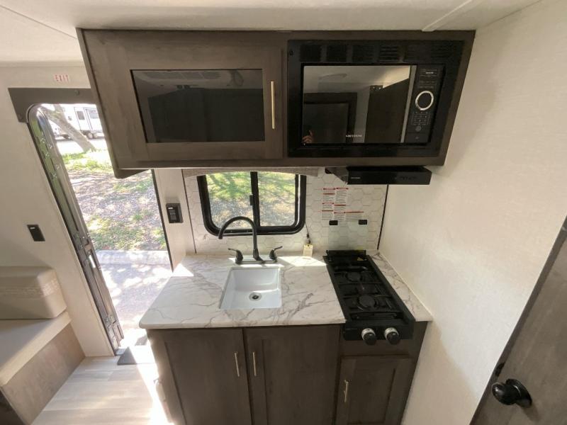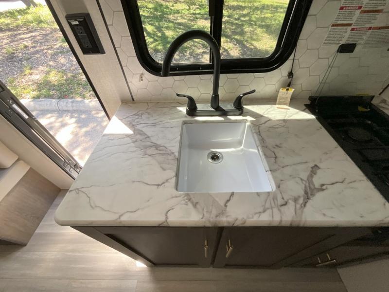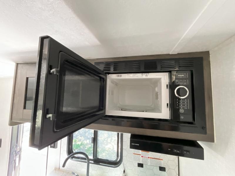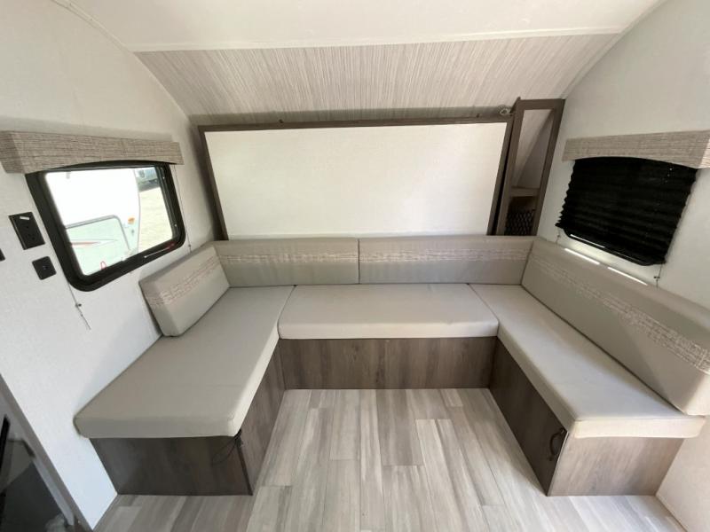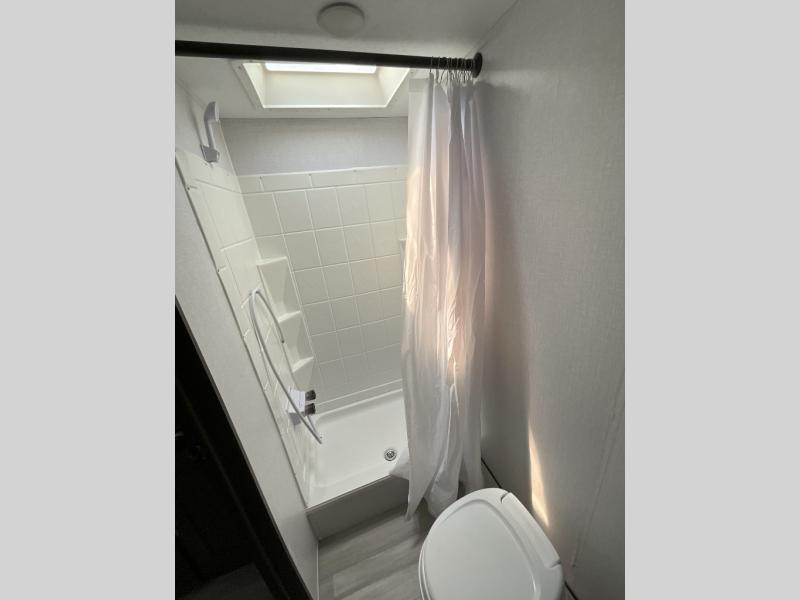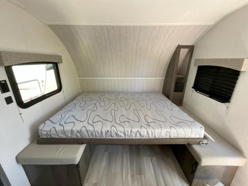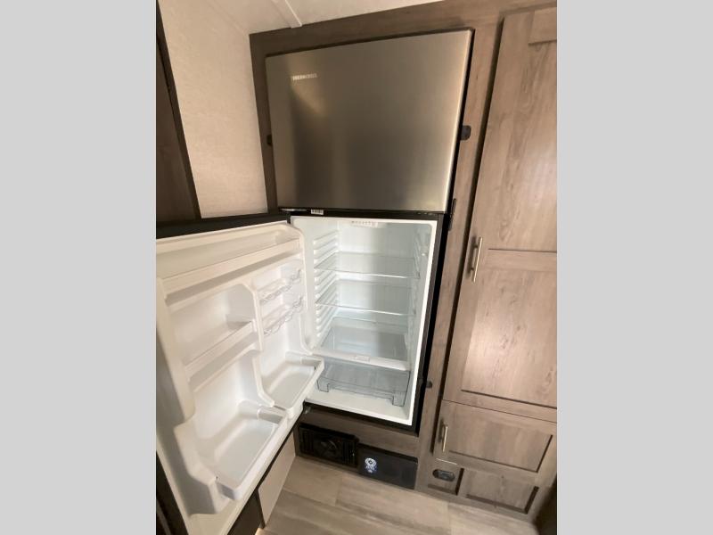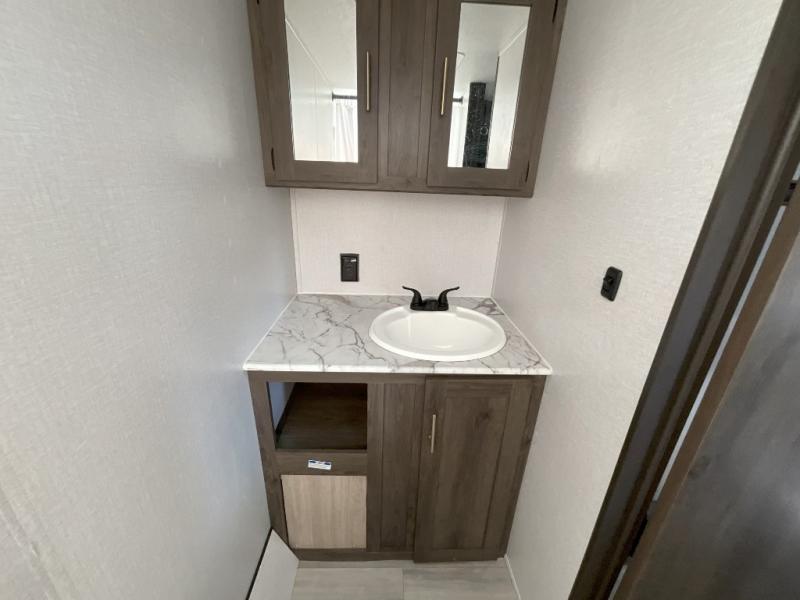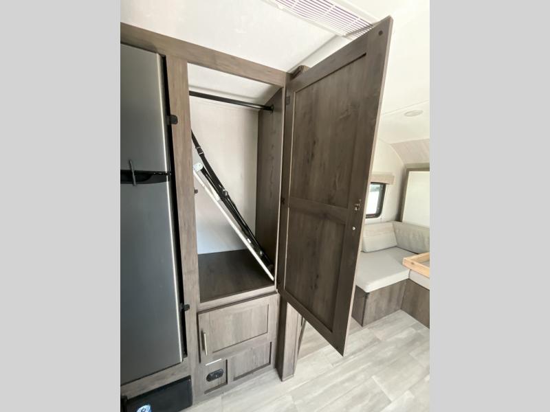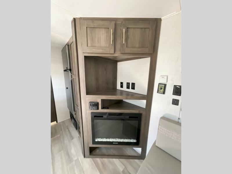 Camping in this single-axle will just feel right with its full bath, comfortable sleeping space, and plenty of storage space for your belongings. Each morning you can fold up the Murphy bed so you can enjoy breakfast around the U-shaped dinette, then freshen up in the full bath before heading out for the day. There is a 7 cu. ft. gas/electric refrigerator and a pantry for store your food for the weekend, and a front wardrobe by the bed to keep your clothes in order. This model also incudes an entertainment center where you can add an optional fireplace!