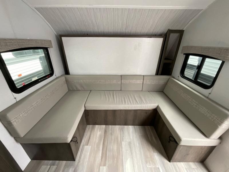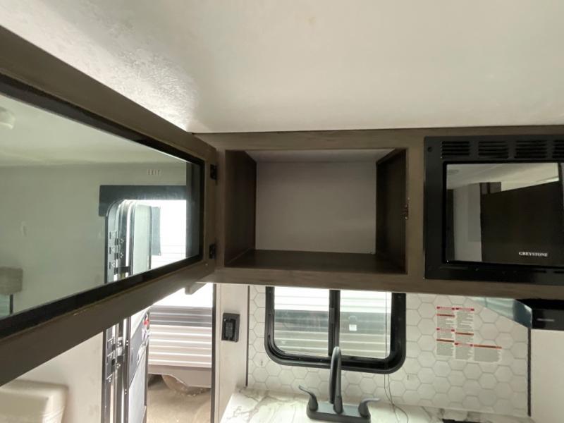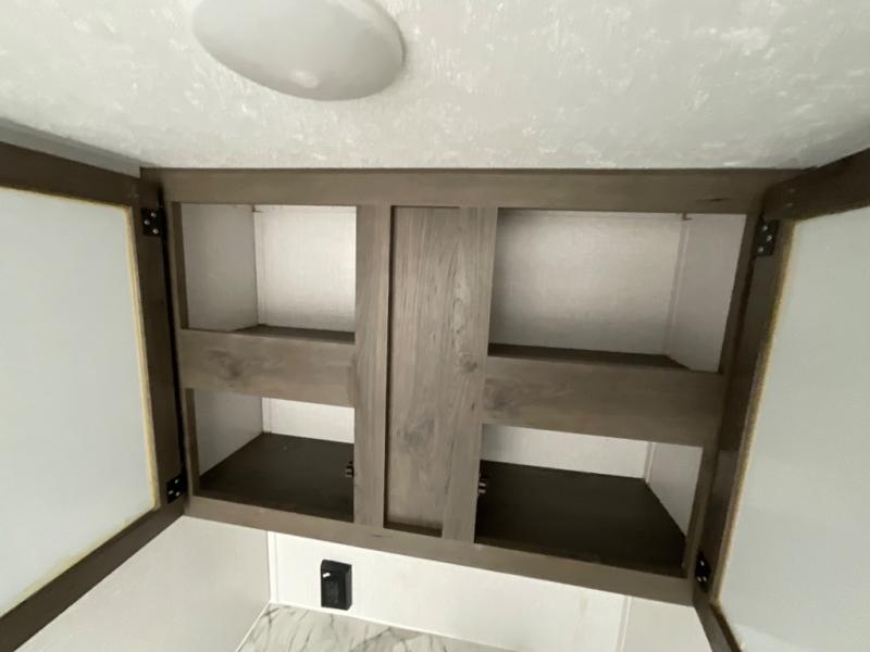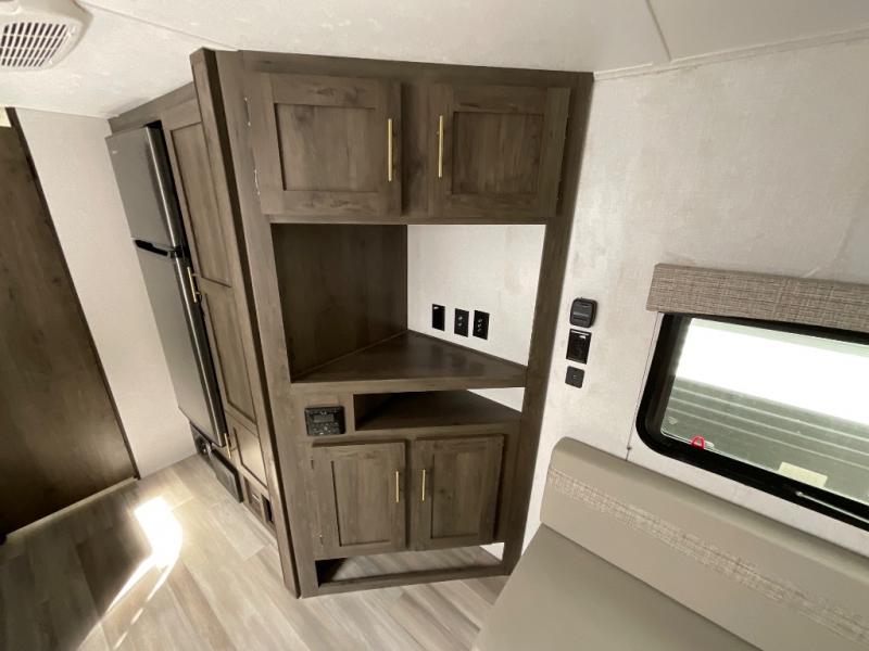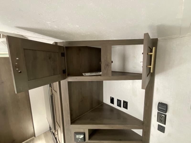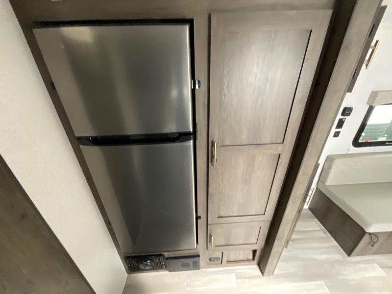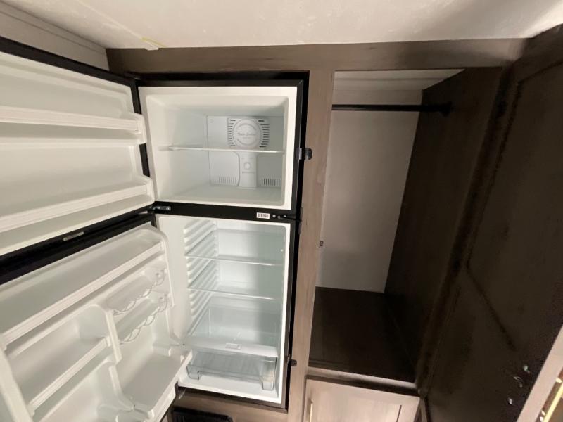 Camping in this single-axle will just feel right with its full bath, comfortable sleeping space, and plenty of storage space for your belongings. Each morning you can fold up the Murphy bed so you can enjoy breakfast around the U-shaped dinette, then freshen up in the full bath before heading out for the day. There is a 7 cu. ft. gas/electric refrigerator and a pantry for store your food for the weekend, and a front wardrobe by the bed to keep your clothes in order. This model also incudes an entertainment center where you can add an optional fireplace!