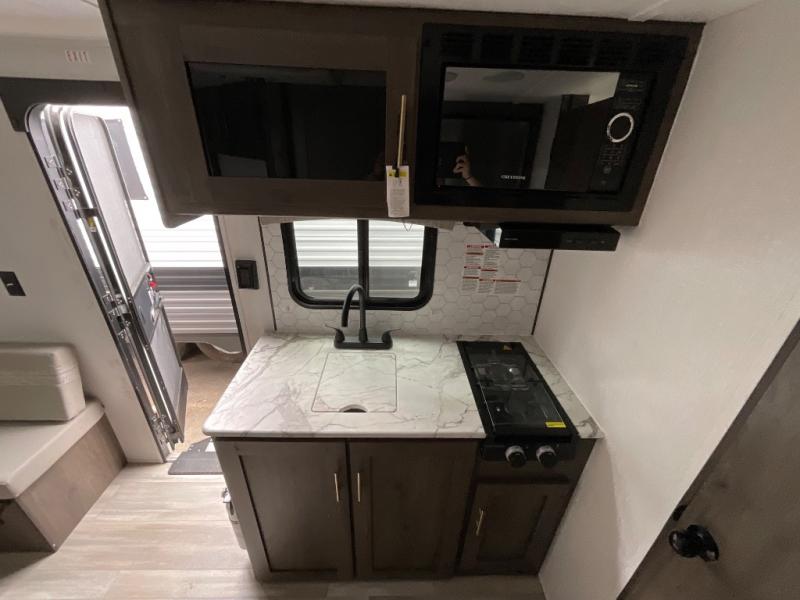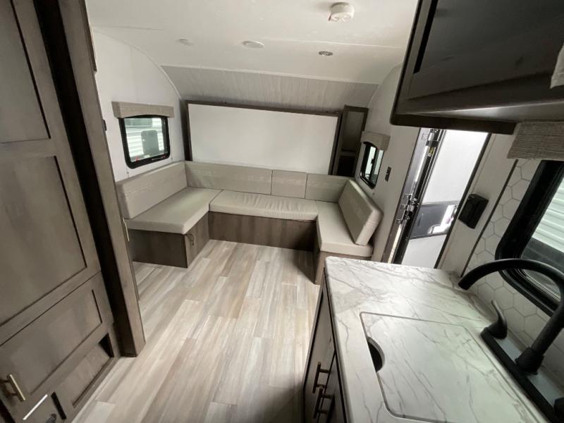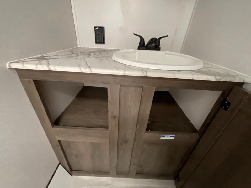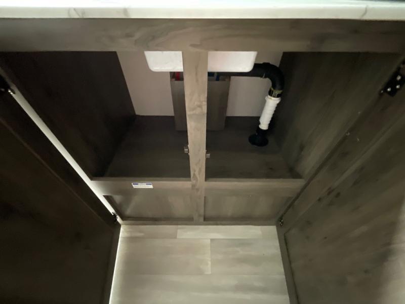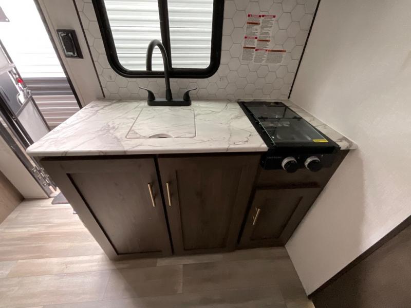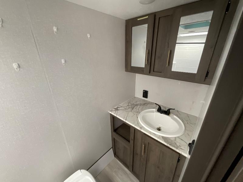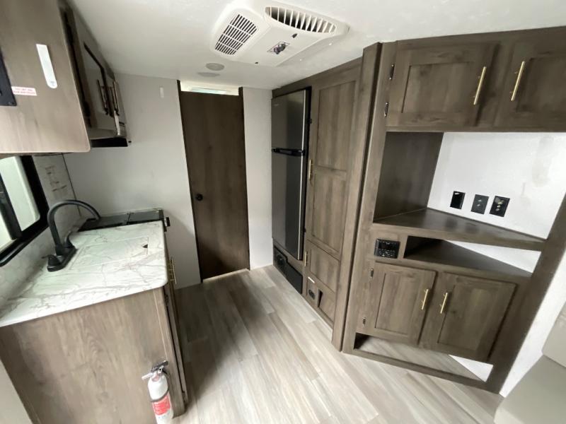 Camping in this single-axle will just feel right with its full bath, comfortable sleeping space, and plenty of storage space for your belongings. Each morning you can fold up the Murphy bed so you can enjoy breakfast around the U-shaped dinette, then freshen up in the full bath before heading out for the day. There is a 7 cu. ft. gas/electric refrigerator and a pantry for store your food for the weekend, and a front wardrobe by the bed to keep your clothes in order. This model also incudes an entertainment center where you can add an optional fireplace!