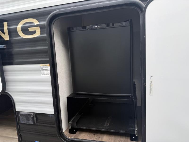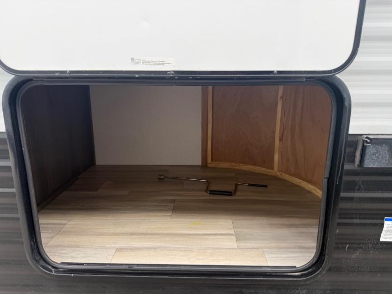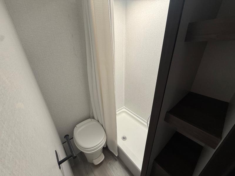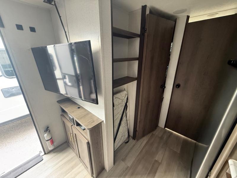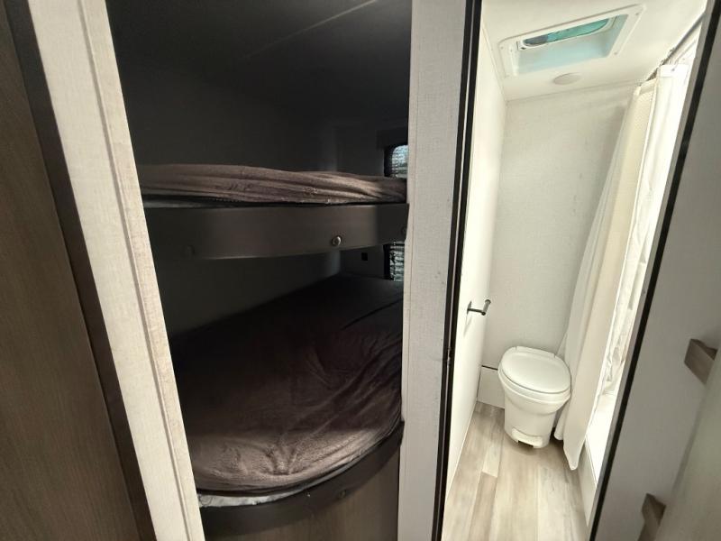 You and your family or friends will experience versatile living with a front Murphy bed located behind the U-shaped dinette with a free-standing table, and the bed can be pulled down after you have enjoyed your dinner and played a few card games at the dinette. And the kids or your guests will love the bunk beds! There is a private shower and toilet room which includes a linen closet to keep your towels, plus the vanity is just outside of the bathroom for your convenience. The kitchen offers full amenities, plus a pantry with upper bunk storage, and the cook can make meals using the outside kitchen as well.