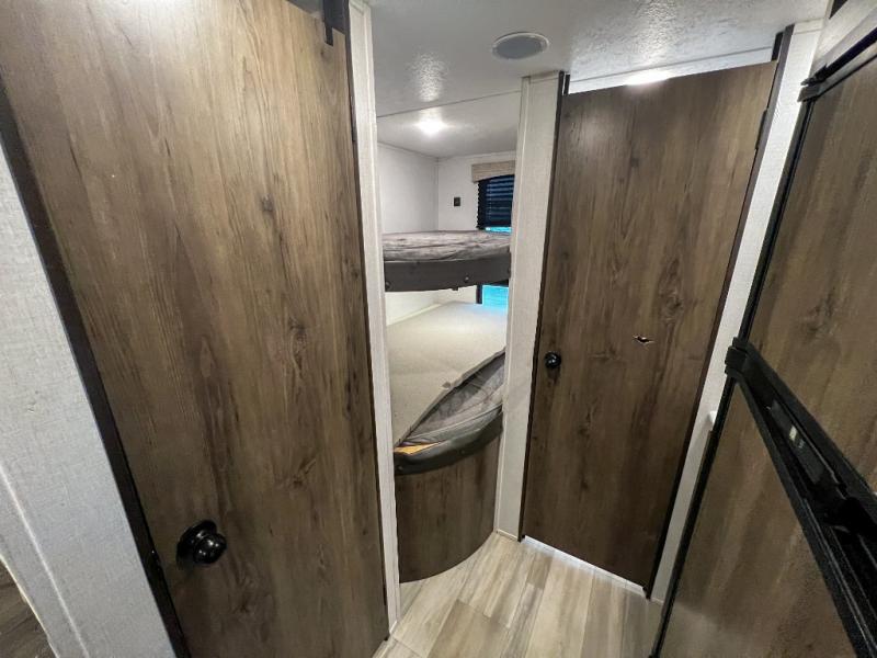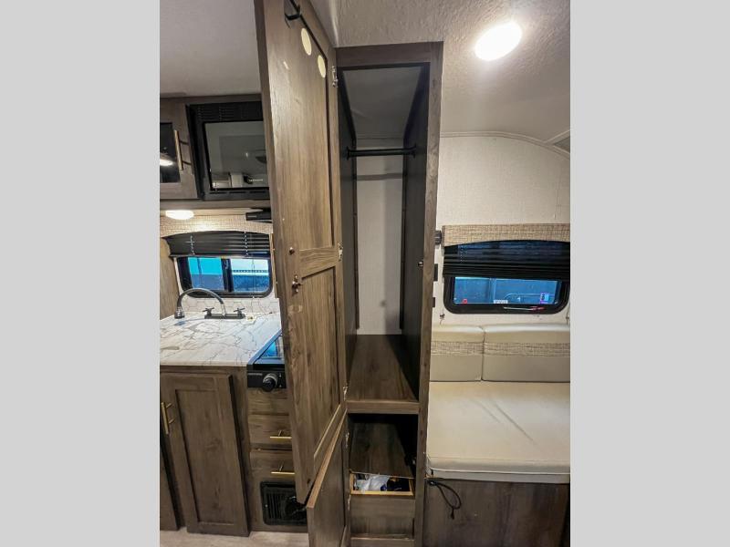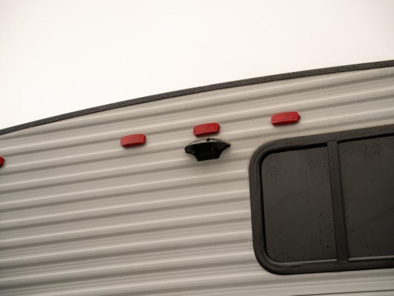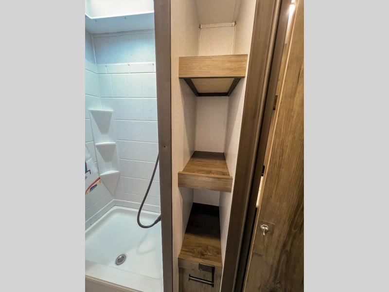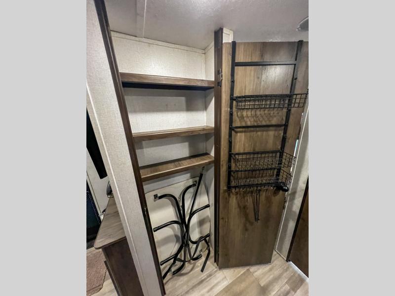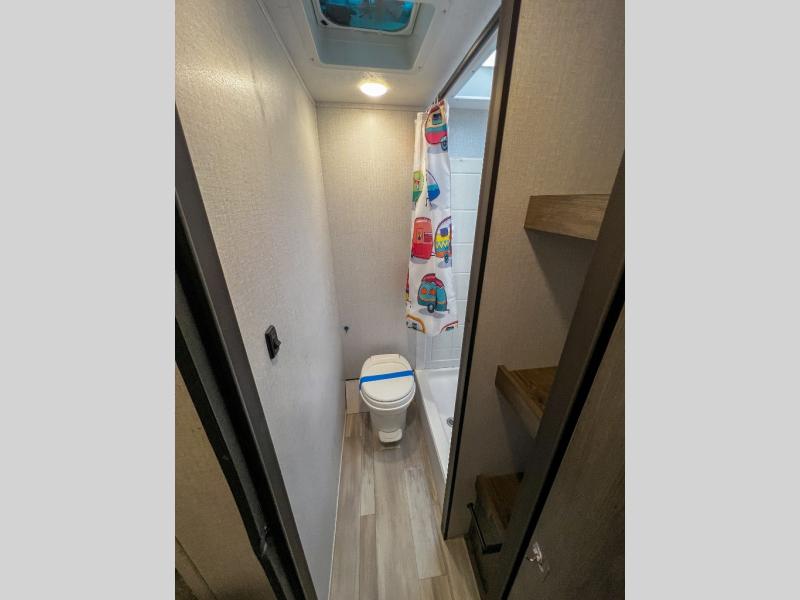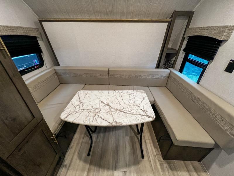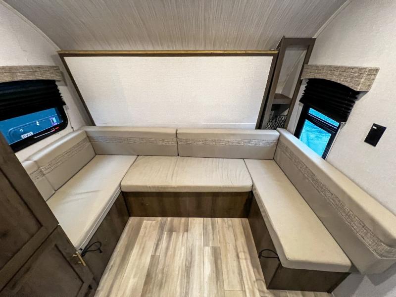 You and your family or friends will experience versatile living with a front Murphy bed located behind the U-shaped dinette with a free-standing table, and the bed can be pulled down after you have enjoyed your dinner and played a few card games at the dinette. And the kids or your guests will love the bunk beds! There is a private shower and toilet room which includes a linen closet to keep your towels, plus the vanity is just outside of the bathroom for your convenience. The kitchen offers full amenities, plus a pantry with upper bunk storage, and the cook can make meals using the outside kitchen as well.