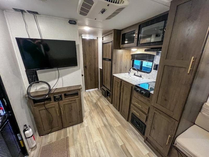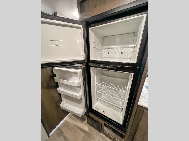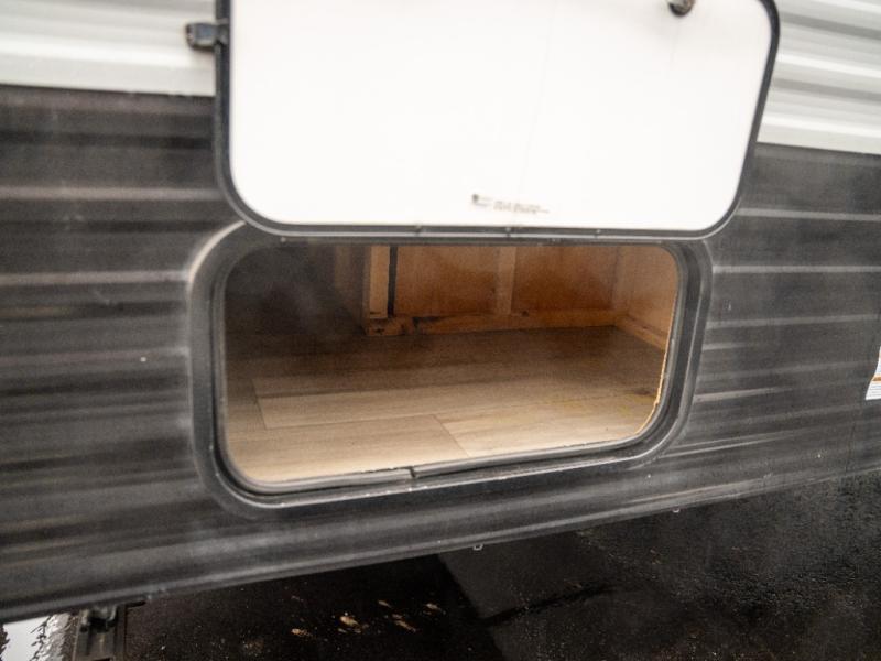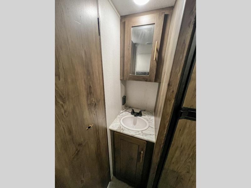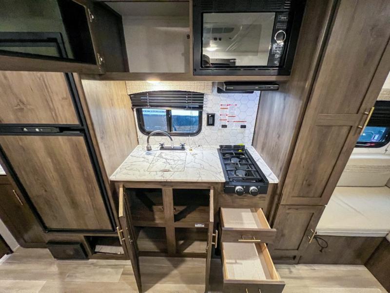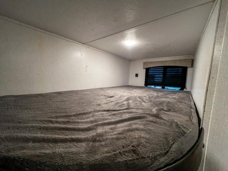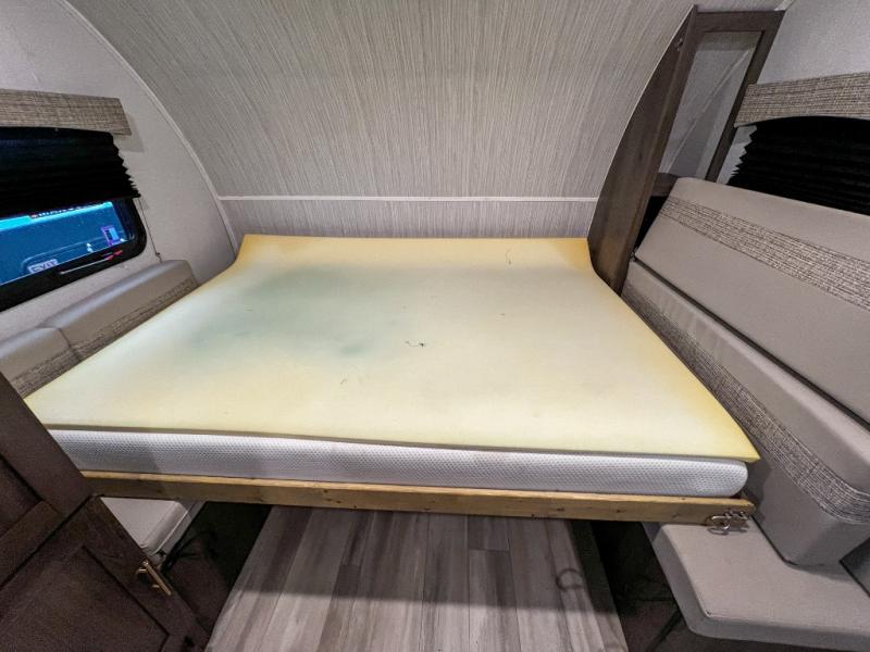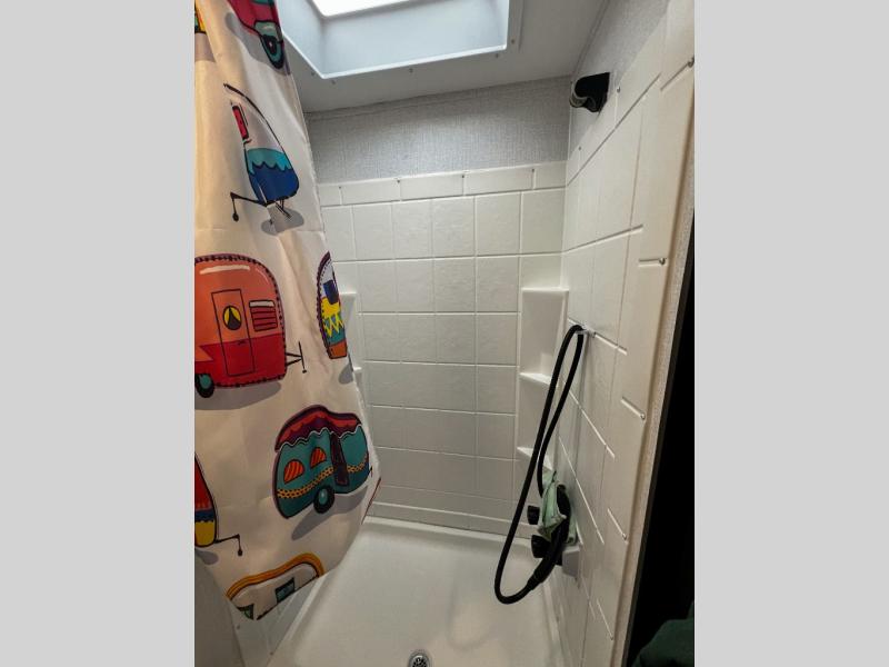 You and your family or friends will experience versatile living with a front Murphy bed located behind the U-shaped dinette with a free-standing table, and the bed can be pulled down after you have enjoyed your dinner and played a few card games at the dinette. And the kids or your guests will love the bunk beds! There is a private shower and toilet room which includes a linen closet to keep your towels, plus the vanity is just outside of the bathroom for your convenience. The kitchen offers full amenities, plus a pantry with upper bunk storage, and the cook can make meals using the outside kitchen as well.