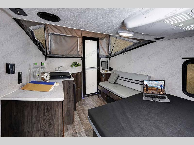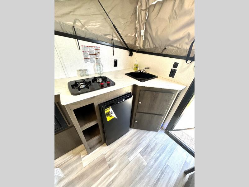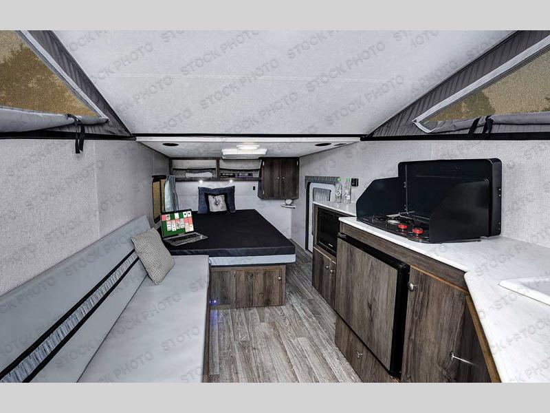 Make your camping life easier by choosing the Viking Express Series folding pop-up camper! The interior offers you 100% adhesion residential-grade linoleum, dark ash cabinetry, and residential laminated countertops. You'll also have 12V LED interior lights to help you see. The exterior is constructed with an E-coated tubular steel frame, and there are heavy-duty tongue jacks with wheels, Wide Trac ultra-lube spring axles, electric brakes, and radial tires. The laminated fiberglass roof and automotive-grade metal will protect the exterior for years to come.