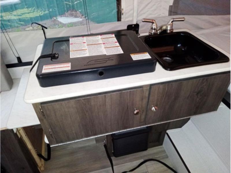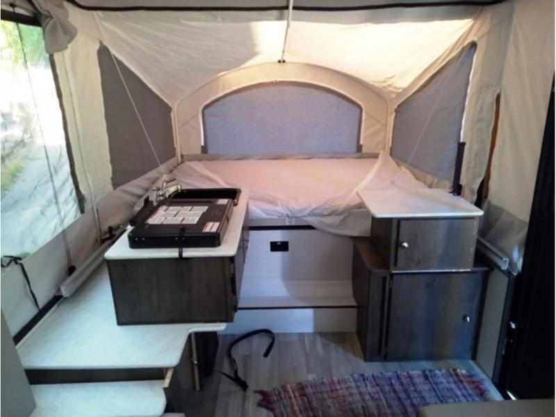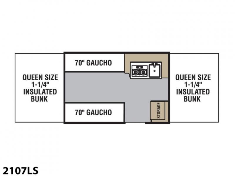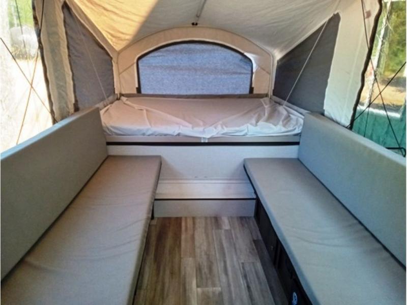 You will find comfort features all throughout this folding pop-up camper! The queen tent end insulated beds supported by Glide-N-Lock cables offer a comfortable night's rest, and you can even transform the two opposing 70" gaucho sofas into an extra sleeping space. Enjoy home cooked meals with the two burner high output range, cold beverages with the 120 watt/12V refrigerator/freezer cooler, and an easy clean up with a deep acrylic sink bowl. The new exterior style storage and shroud lets you bring more items to the campsite and the exterior awning will protect you rain or shine!