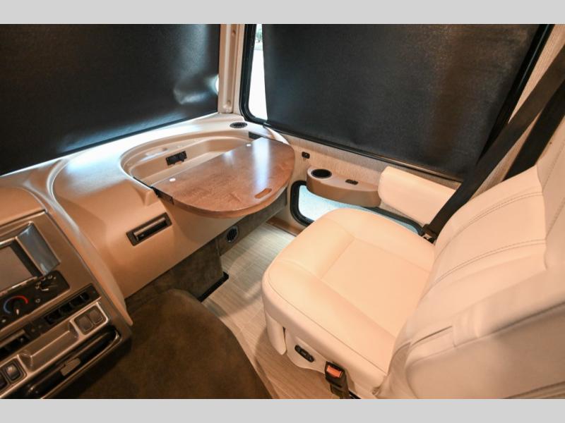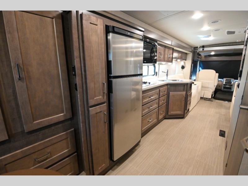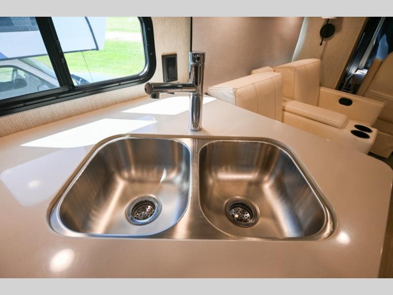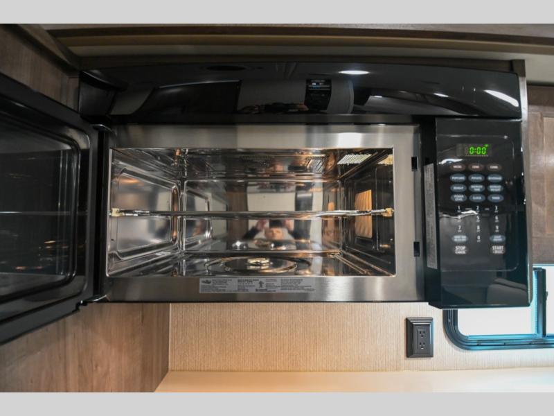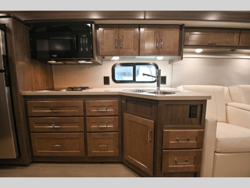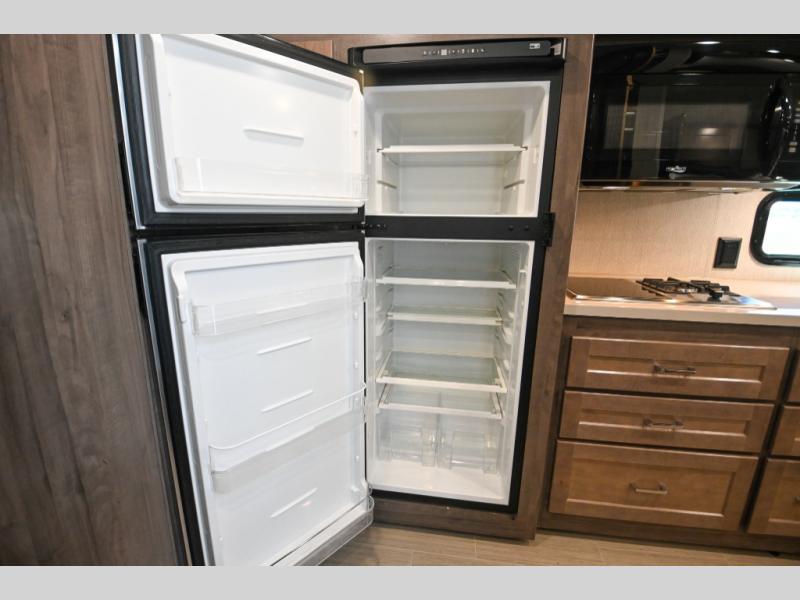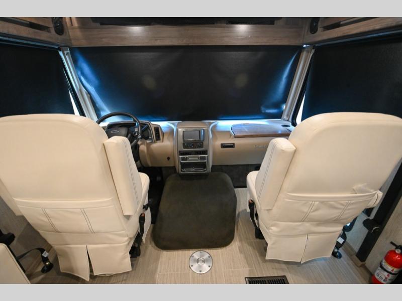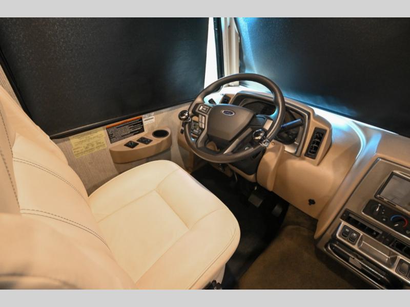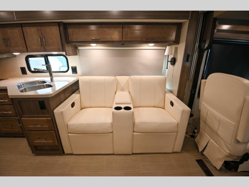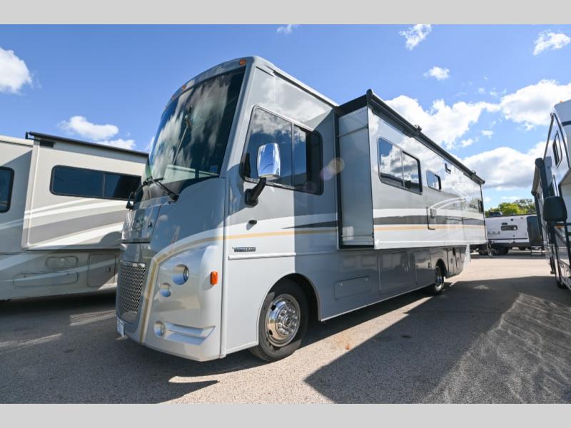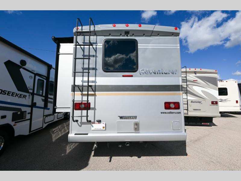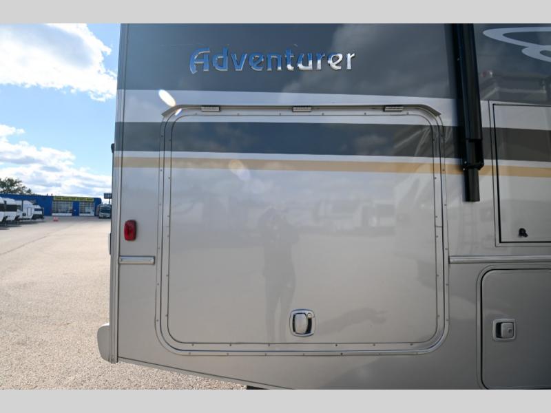 The family-friendly Adventurer Class A gas motorhome by Winnebago is the ultimate family getaway for your trips near and far. The swivel captain's seats include fixed lumbar support and multi-adjustable slide/recline for a truly comfortable ride. You will appreciate the 7" Bluetooth multimedia radio with a rearview/sideview monitor system and color touchscreen for easy navigation, and the powered MCD blackout roller visor/shade on the front windshield will provide privacy when you stop for lunch. Each model includes residential vinyl flooring throughout, a soft vinyl ceiling, a solid-surface kitchen countertop, and a double stainless steel sink with bamboo sink covers. The under-bed storage will provide a place for your luggage, and you'll find lighted storage compartments outside for all your larger gear. These models are constructed with a premium high-gloss fiberglass skin for a sleek look, and the electronic stability control will provide a smooth ride wherever the road takes you!