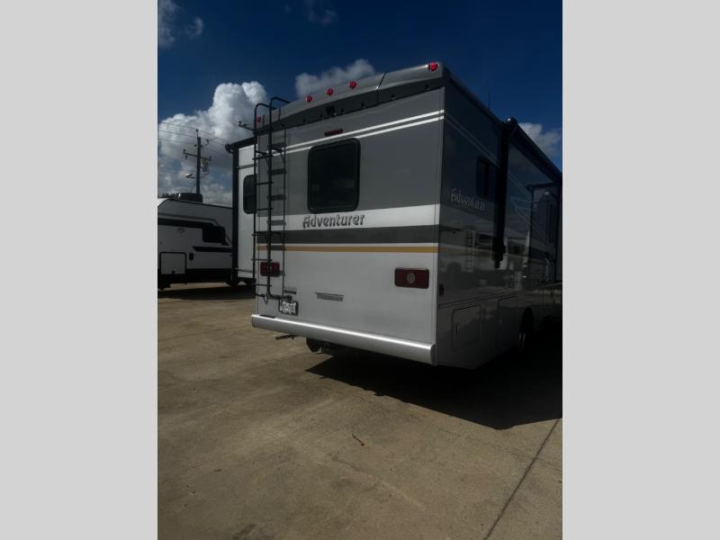 The family-friendly Adventurer Class A gas motorhome by Winnebago is the ultimate family getaway for your trips near and far. The swivel captain's seats include fixed lumbar support and multi-adjustable slide/recline for a truly comfortable ride. You will appreciate the 7" Bluetooth multimedia radio with a rearview/sideview monitor system and color touchscreen for easy navigation, and the powered MCD blackout roller visor/shade on the front windshield will provide privacy when you stop for lunch. Each model includes residential vinyl flooring throughout, a soft vinyl ceiling, a solid-surface kitchen countertop, and a double stainless steel sink with bamboo sink covers. The under-bed storage will provide a place for your luggage, and you'll find lighted storage compartments outside for all your larger gear. These models are constructed with a premium high-gloss fiberglass skin for a sleek look, and the electronic stability control will provide a smooth ride wherever the road takes you!