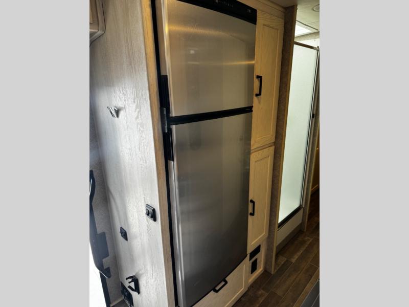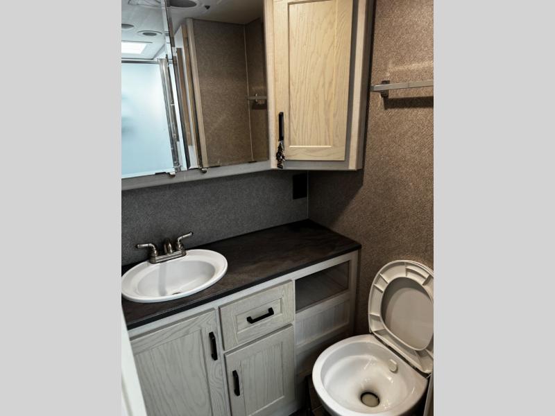 If you're looking to upgrade from a travel trailer to a motorhome, this Adventurer Class A gas motorhome is for you! You will find plenty of comfortable seating spaces on the TrueComfort+ sofa, the dining table with chairs that also includes storage, plus the swivel captain's seats. The dual opposing slides in the main living area will open up the coach so that everyone can move about freely, and you'll find a third slide out in the rear bedroom. Prepare meals on the recessed three-burner range top or in the convection microwave, and then take your plate to sit under the 19' power awning. This model features a private toilet and sink with the independent shower right across the hall so that two people can freshen up at once, and the rear bedroom will feel just like home. Here, you'll enjoy the queen bed slide, dual nightstands, plus your own 24" HDTV! The kids can sleep on the TruComfort+ Sofa, and you can choose to add the optional Studio Loft bed for even more sleeping space!
