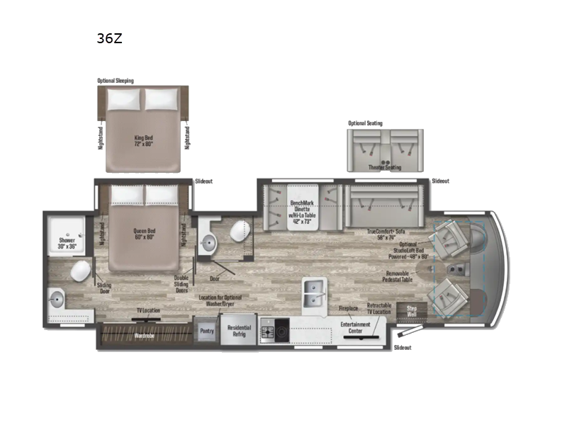 This Adventurer Class A gas motorhome is the perfect home on wheels for your next big adventure. The full-wall slide along with two additional slides provide an open and inviting space to stretch out. While the chef of the family is preparing dinner on the gas/induction range top, the kids can watch a show on the 48" HDTV. Comfortable seating space will be found on the TrueComfort+ Sofa or the BenchMark Dinette, and these areas will convert into the kids' sleeping space at night! This model includes plenty of storage space, including a large bedroom wardrobe plus a pantry that can also be used to add an optional washer and dryer if you choose. Nothing says convenience like a full and half bath, and you'll get just that with this model. Plus, you can add the optional StudioLoft bed for additional sleeping space.