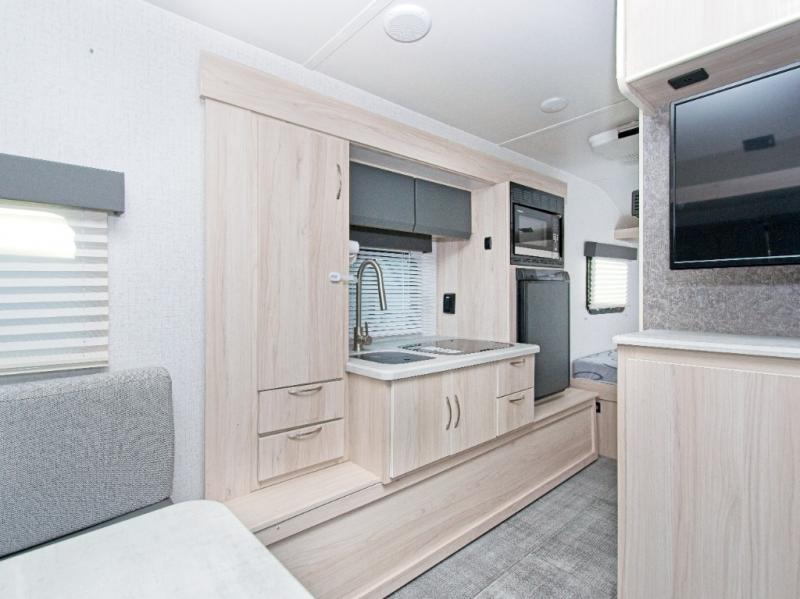 Cooking is a breeze with a recessed two-burner cooktop, gas/electric refrigerator, and convection microwave—so you can enjoy more than just cereal for breakfast! Gather around the rear U-shaped dinette for meals or convert it into an extra sleeping space when needed. Plus, keep your essentials organized with a pantry for snacks and a wardrobe for clothes.