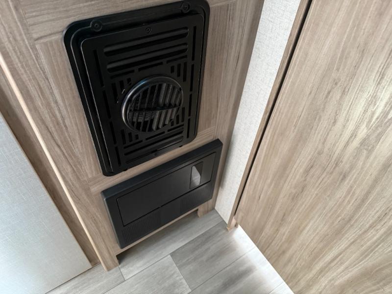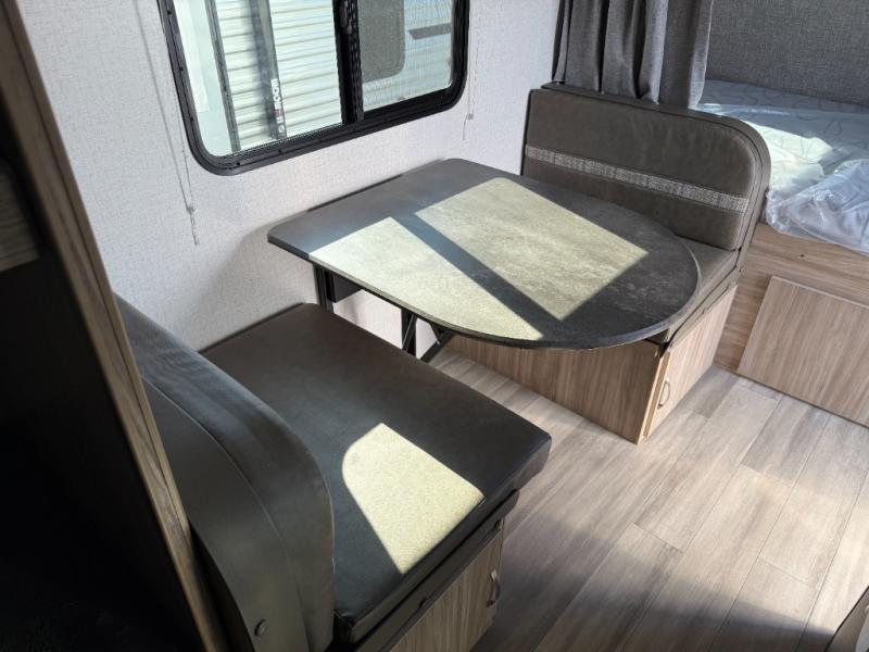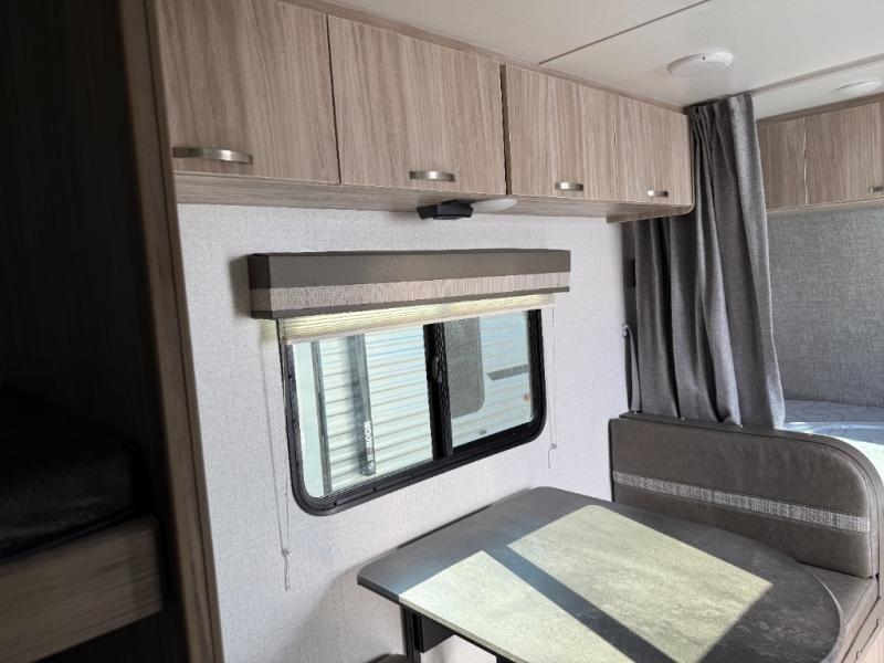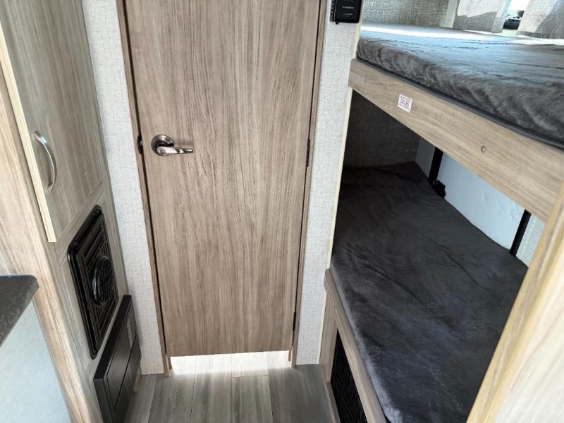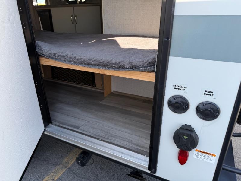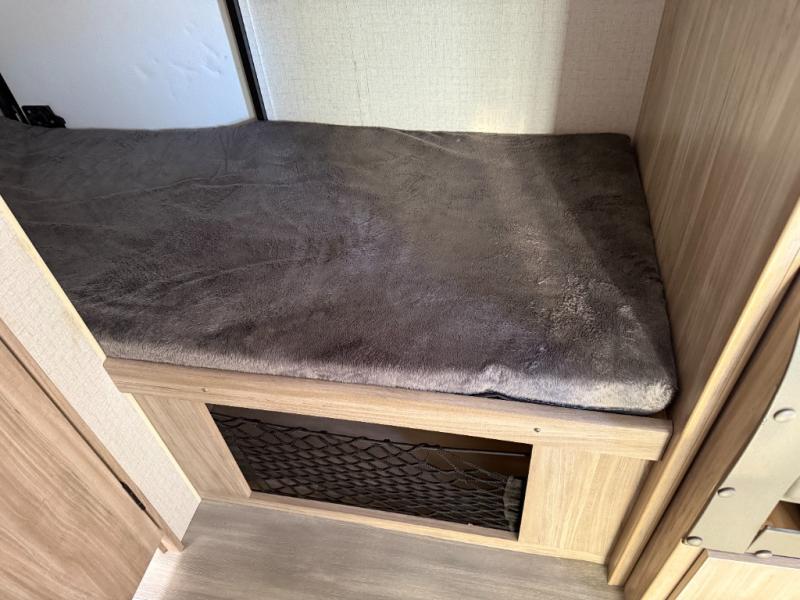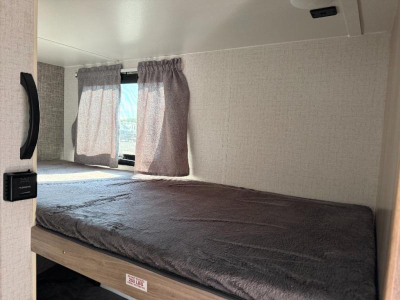 This travel trailer is ideal for a family or group of friends! With a set of bunk beds in the rear corner and a front 54" x 74" bed, everyone will enjoy a good night's rest. There is even an exterior pack-n-play door allowing you to easily store items under the bunks so they are safe inside. The rear corner bathroom features a shower and toilet so that you don't have to use the public facilities. Once you are squeaky clean, you can grab a beverage from the refrigerator and play a card game at the 32" x 74" booth dinette. And the power awning will provide an outdoor living area protected from the elements so you can relax and unwind while enjoying the outdoors.