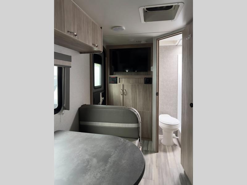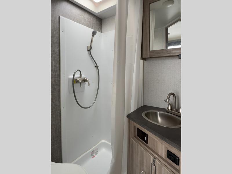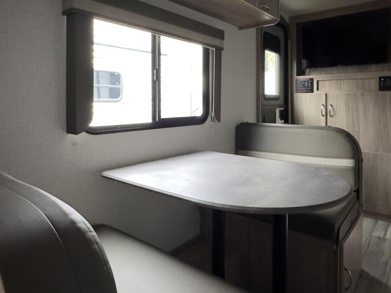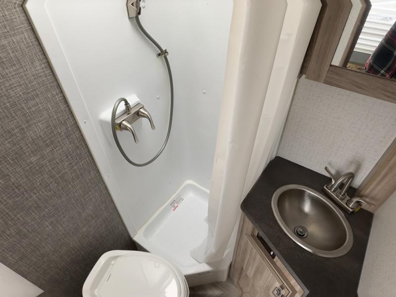 You and your spouse can head out to the best adventure with this travel trailer! Start each morning feeling refreshed after sleeping on the front RV queen bed and get ready for your day in the rear corner bathroom which features a toilet, sink, and 24" x 24" angled shower. The 32" x 74" booth dinette is not only great for eating your meals at or playing games, but it can also be transformed into an extra sleeping space for a guest. End your nights by relaxing underneath the power awning with LED lights and your favorite tunes playing through the patio speakers!