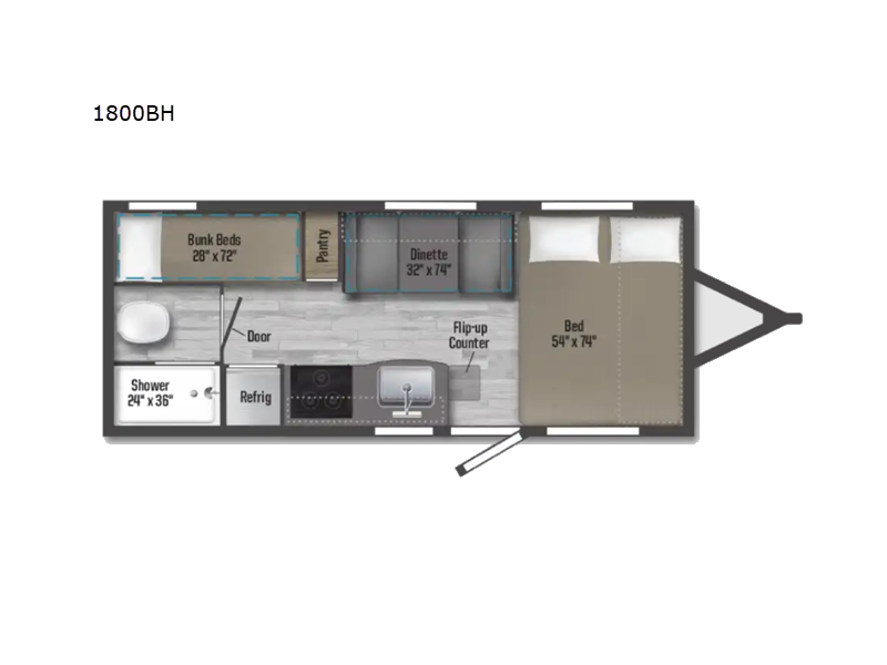 Pack your bags and load up the kids to head out on a great camping adventure as a family! There is a front 54" x 74" RV queen bed for you and a set of rear corner bunk beds for the kids, plus they can bring a friend to sleep on the 32" x 74" booth dinette. You can prepare meals for the whole group with the three burner cooktop and the 10.3 cu. ft. refrigerator, plus you can pop a bag of popcorn in the microwave for movie night with the LED TV. And a private toilet and 24" x 36" shower next to the bunks and offers a great place to get ready for the day or bedtime.