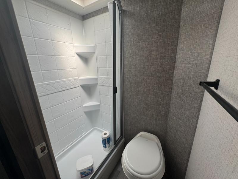 Get ready for a fun family weekend in the great outdoors with this trailer only steps away to enjoy inside comforts! The cook will love having everything to make warm meals, and can easily store leftovers in the double refrigerator, plus the flip-up counter gives them more space to prep or dry the dishes. The front 54" x 74" full bed has a divider curtain for privacy at night and the rear corner 28" x 72" bunk beds are conveniently next to the private toilet and shower room. The booth dinette slide gives you a place to dine as well as sleep one more person, plus you will love the extra floor space that it provides. You might like to choose the EZ Glide Sofa Sleeper and table option in its place, the option is yours!