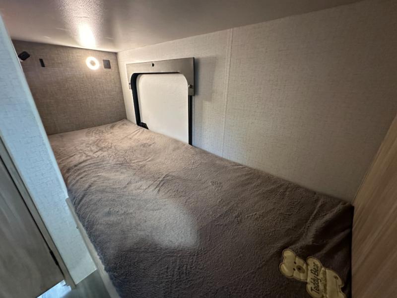 Get ready for a fun family weekend in the great outdoors with this trailer only steps away to enjoy inside comforts! The cook will love having everything to make warm meals, and can easily store leftovers in the double refrigerator, plus the flip-up counter gives them more space to prep or dry the dishes. The front 54" x 74" full bed has a divider curtain for privacy at night and the rear corner 28" x 72" bunk beds are conveniently next to the private toilet and shower room. The booth dinette slide gives you a place to dine as well as sleep one more person, plus you will love the extra floor space that it provides. You might like to choose the EZ Glide Sofa Sleeper and table option in its place, the option is yours!