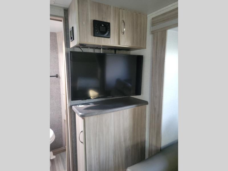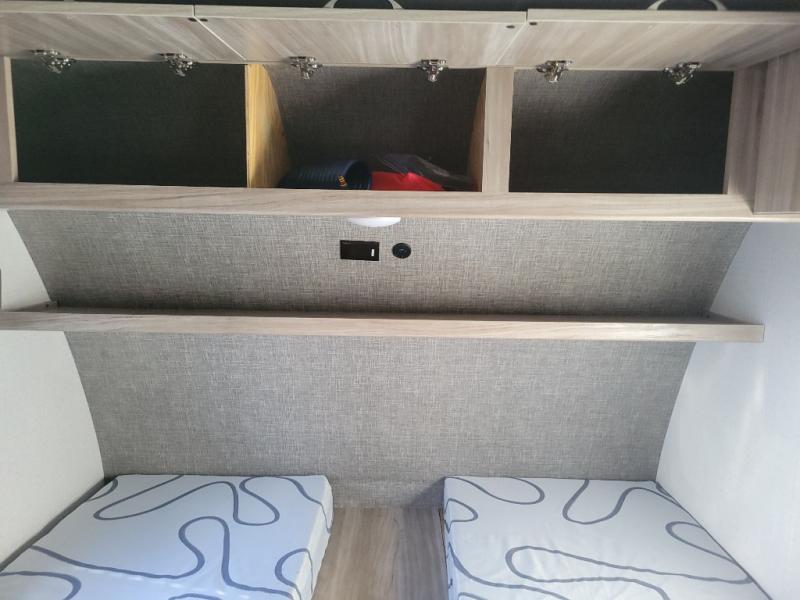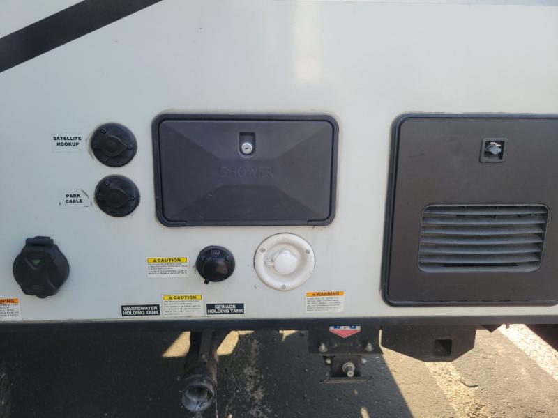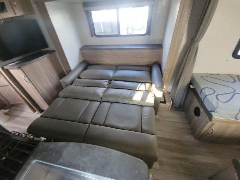 Come see just how accommodating this travel trailer can be! The two 32" x 74" twin beds up front have a nightstand in between them and a divider curtain to draw, plus they can convert into one 74" x 82" king-size bed. The 44" x 72" booth dinette slide can also convert into an extra sleeping space when you're not using it for meal time or play games. Everyone can get squeaky clean in the full rear bathroom, and the wardrobe is a convenient place to store your linens and extra clothes. Grab a snack from the kitchen pantry or pop a bag of popcorn in the microwave then watch a movie on the LED TV or head outdoors and relax underneath the power awning while your favorite tunes play through the patio speakers!