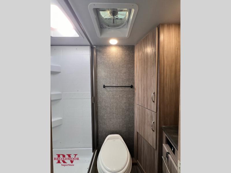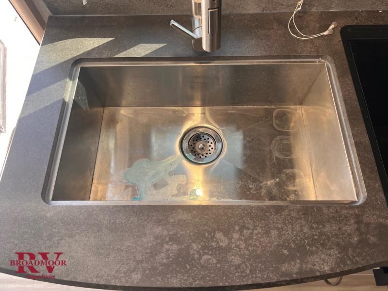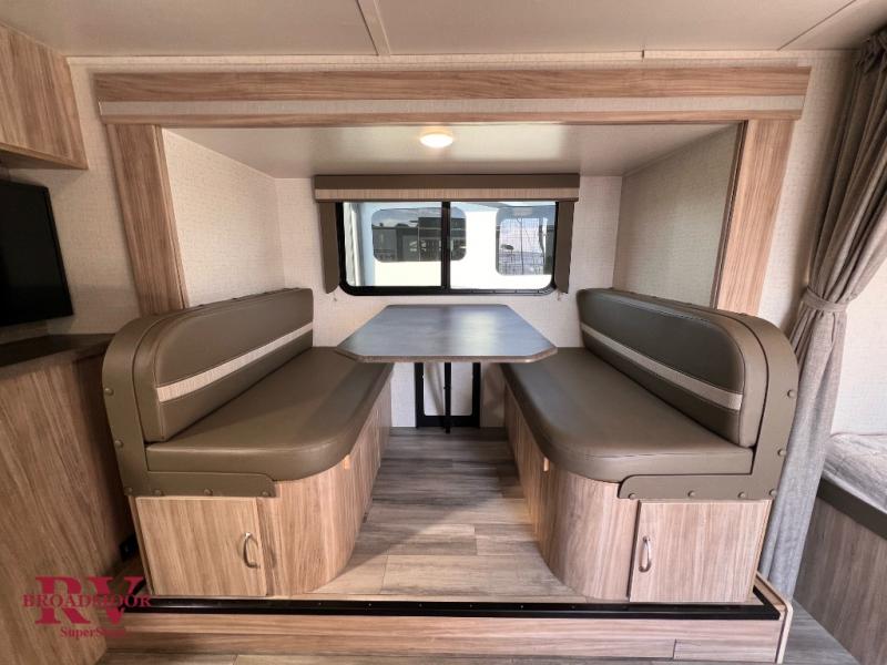 Come see just how accommodating this travel trailer can be! The two 32" x 74" twin beds up front have a nightstand in between them and a divider curtain to draw, plus they can convert into one 74" x 82" king-size bed. The 44" x 72" booth dinette slide can also convert into an extra sleeping space when you're not using it for meal time or play games. Everyone can get squeaky clean in the full rear bathroom, and the wardrobe is a convenient place to store your linens and extra clothes. Grab a snack from the kitchen pantry or pop a bag of popcorn in the microwave then watch a movie on the LED TV or head outdoors and relax underneath the power awning while your favorite tunes play through the patio speakers!