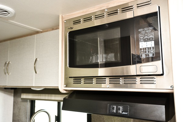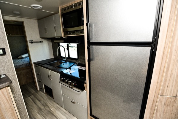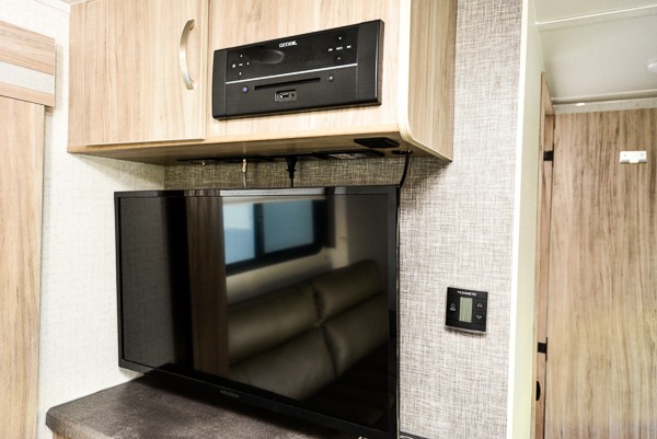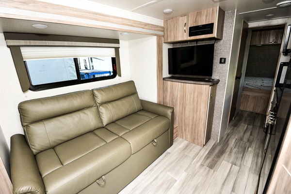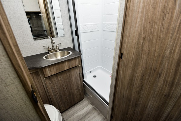 This is a perfect couples trailer as well as family RV if you utilize the furniture as sleeping space! The rear 32" x 74" dinette is a great place to enjoy your meals, play some card games, and even transform into an extra sleeping space for one. You can take an afternoon nap on the EZ Glide Sofa Sleeper or watch your favorite movie on the LED TV if mother nature rains on your parade. Start each morning feeling fresh after sleeping on the 54" x 74" full bed and enjoy cross ventilation from the windows on both sides. Take the fun outside with patio speakers and a power awning with LED lighting!