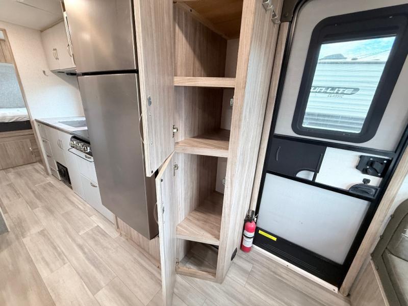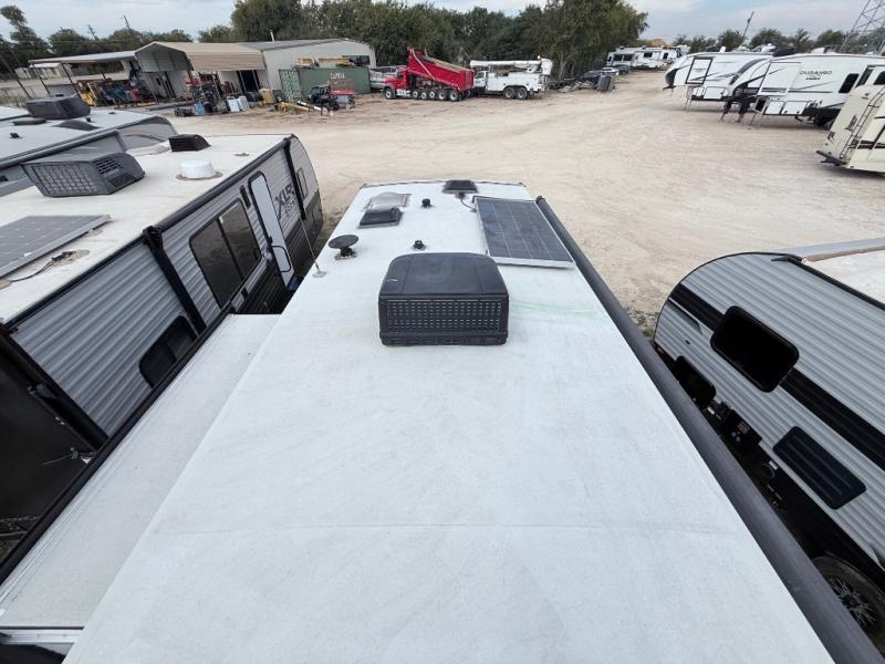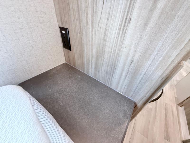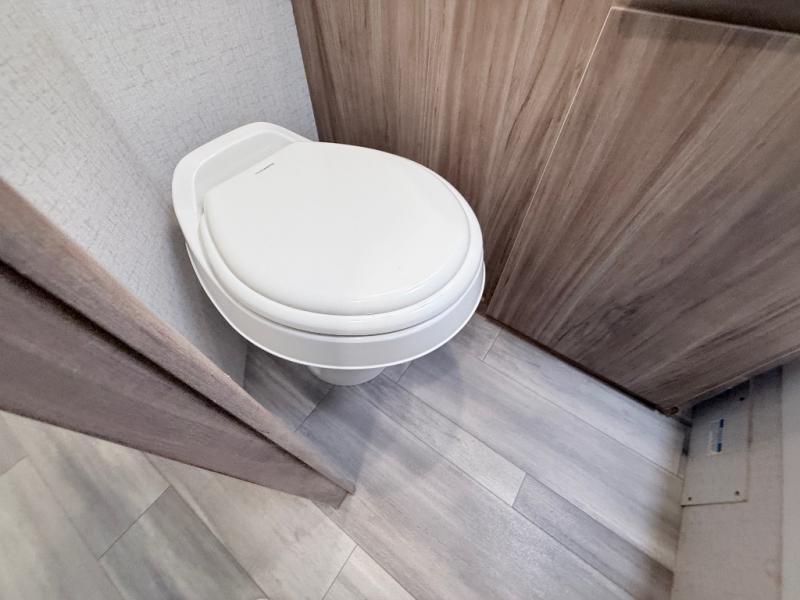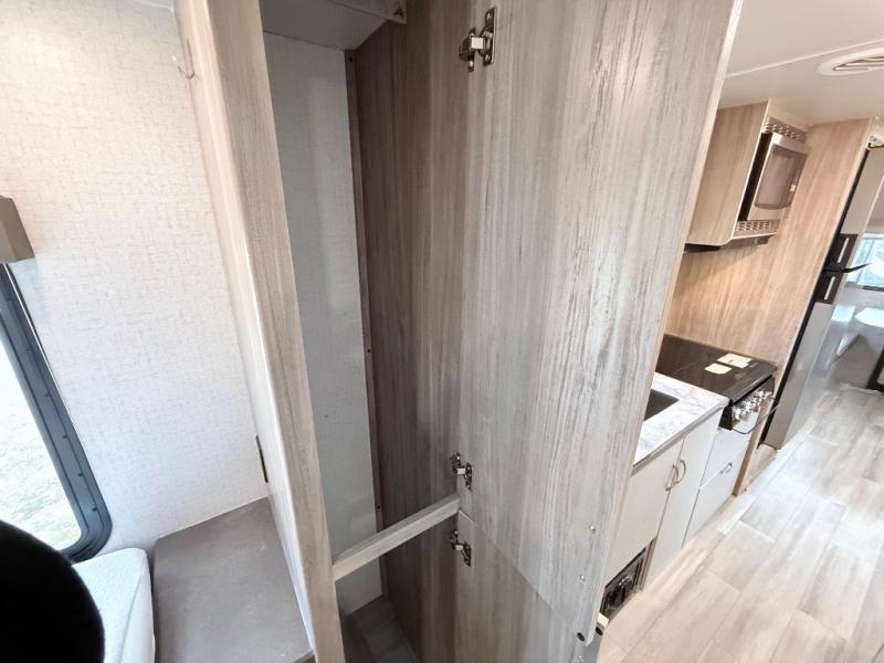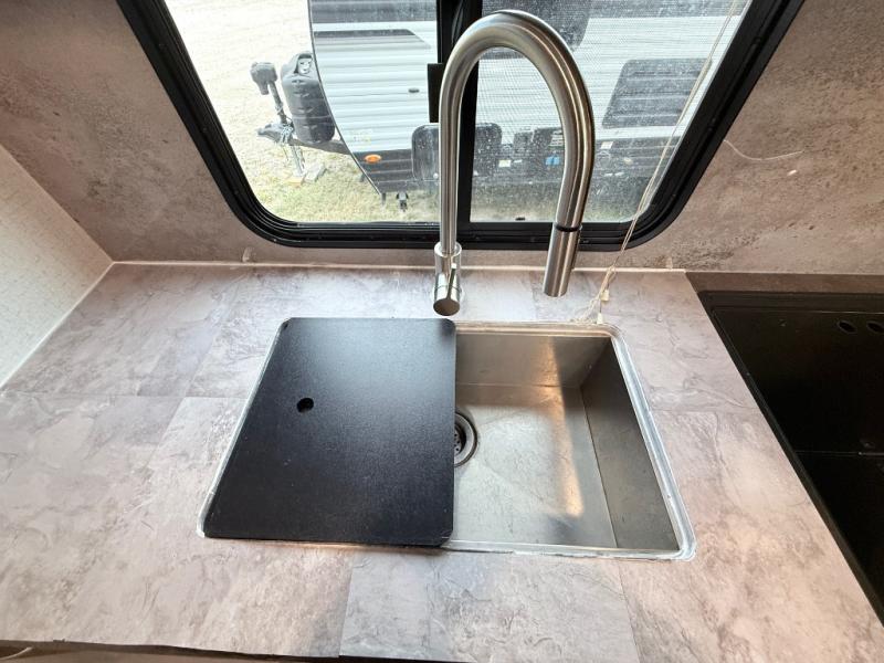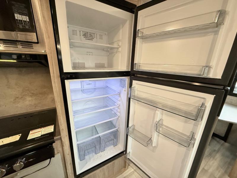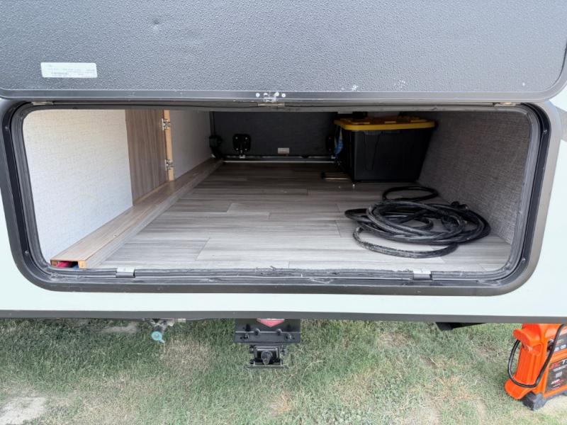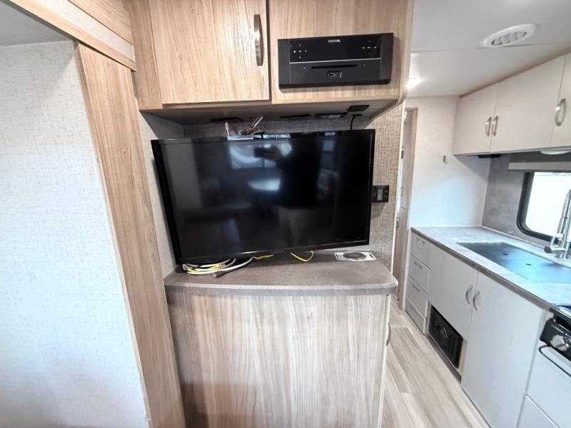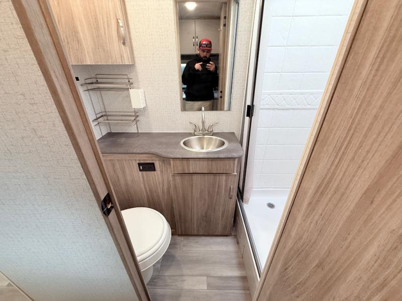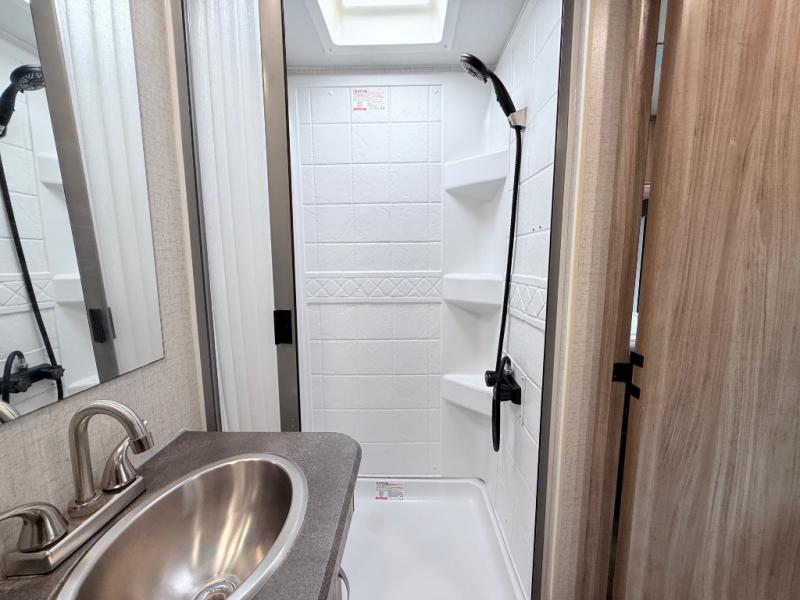 This is a perfect couples trailer as well as family RV if you utilize the furniture as sleeping space! The rear 32" x 74" dinette is a great place to enjoy your meals, play some card games, and even transform into an extra sleeping space for one. You can take an afternoon nap on the EZ Glide Sofa Sleeper or watch your favorite movie on the LED TV if mother nature rains on your parade. Start each morning feeling fresh after sleeping on the 54" x 74" full bed and enjoy cross ventilation from the windows on both sides. Take the fun outside with patio speakers and a power awning with LED lighting!