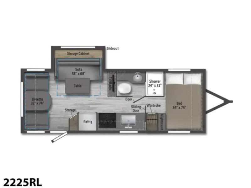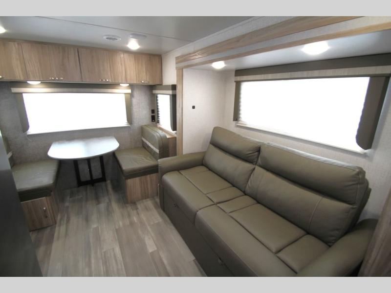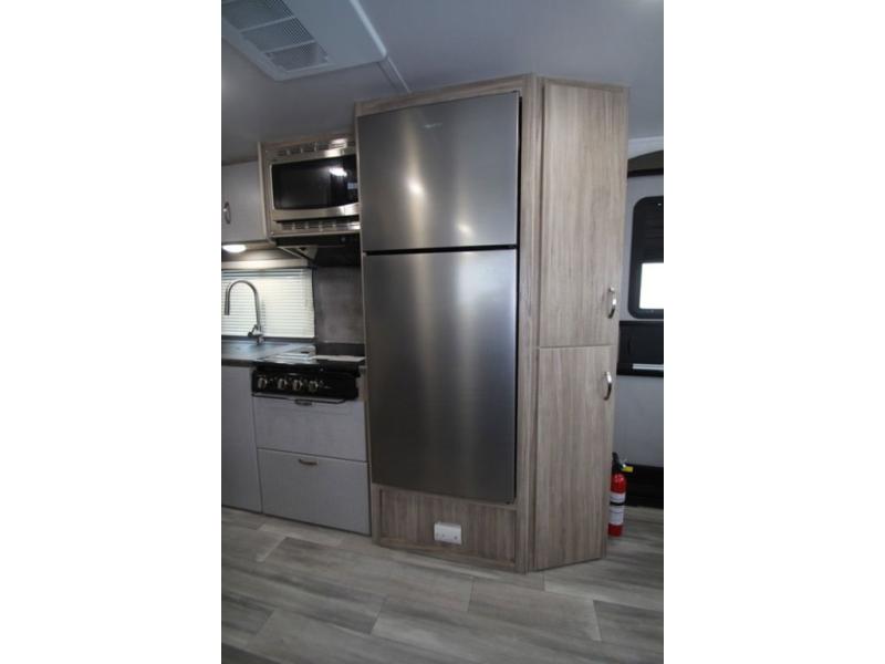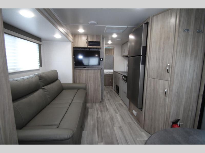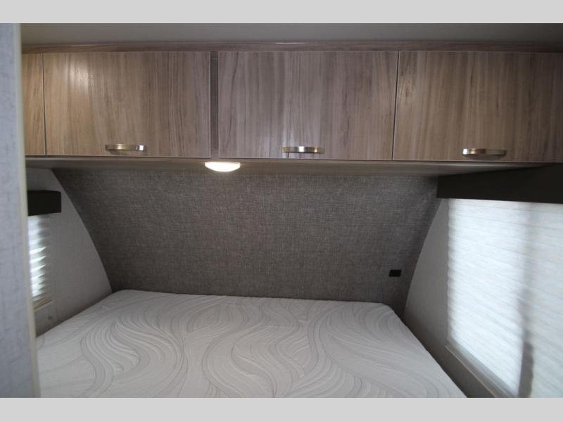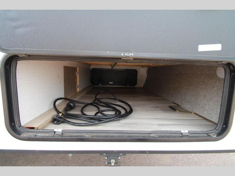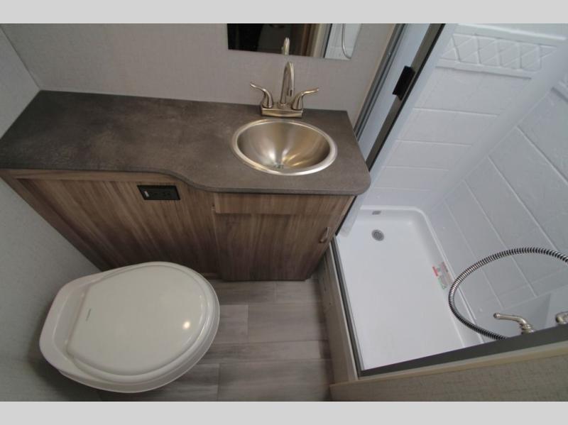 This is a perfect couples trailer as well as family RV if you utilize the furniture as sleeping space! The rear 32" x 74" dinette is a great place to enjoy your meals, play some card games, and even transform into an extra sleeping space for one. You can take an afternoon nap on the EZ Glide Sofa Sleeper or watch your favorite movie on the LED TV if mother nature rains on your parade. Start each morning feeling fresh after sleeping on the 54" x 74" full bed and enjoy cross ventilation from the windows on both sides. Take the fun outside with patio speakers and a power awning with LED lighting!