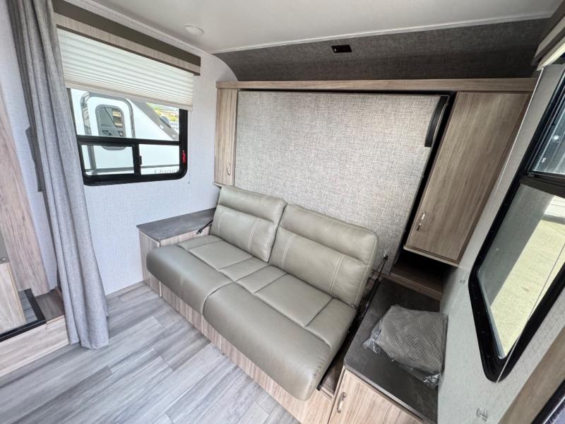 Take this Micro Minnie FLX travel trailer out to a familiar campsite or across the country on a new exploration! With its ability to sleep five people, this trailer provides you with a comfortable resting area to offer to friends or family that are traveling with you. There is a single slide so that you have more interior living space, and the full galley kitchen is equipped with a recessed three-burner cooktop and convection microwave so that you can cook even when you don't have a fire going. You'll have a full bathroom with a radius shower and linen closet, and the front Murphy bed can fold down into a bed that can be sectioned off with a divider curtain, or it can fold away to reveal a sofa for afternoon lounging.