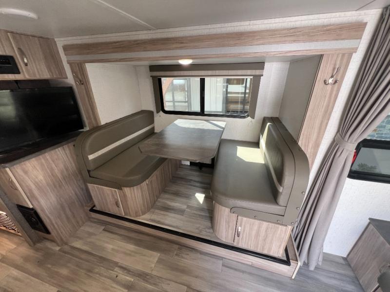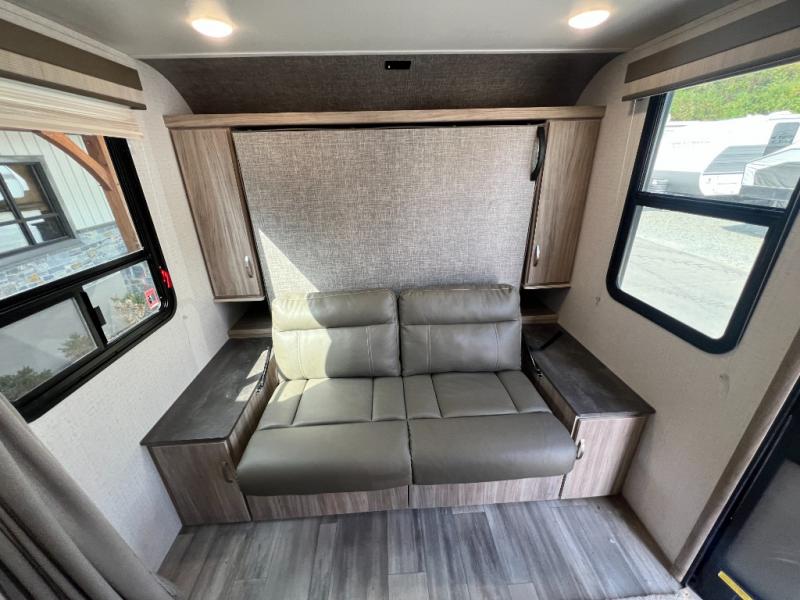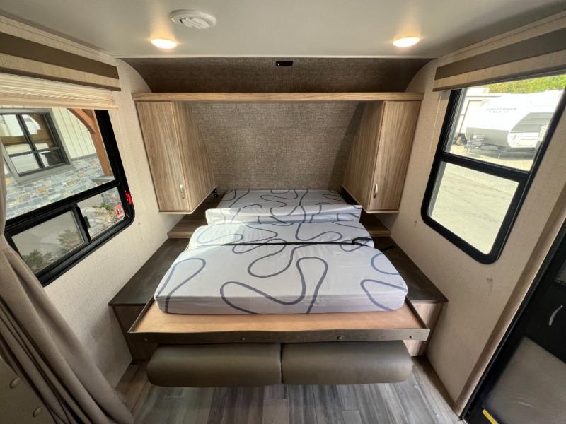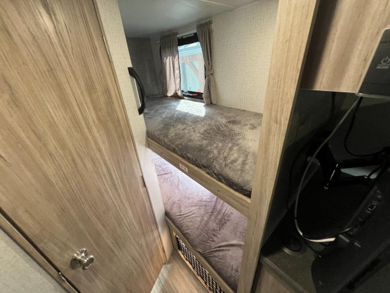 Load your kids into this travel trailer and experience a fun family getaway! The front Murphy bed offers versatile living by transforming into a 54" x 74" bed to sleep on at night and a sofa to sit on during the day. The 44" x 72" booth dinette slide is a great place to enjoy your meals at, play games as a family, and even transform into an extra sleeping space if your kids want a friend to tag along. The kids will love sleeping on the rear corner 28" x 72" bunk beds and having the rear corner bathroom right next to them. As if that wasn't enough, there is an exterior pack-n-play door, a power awning with LED lighting, and patio speakers to crank up the tunes!