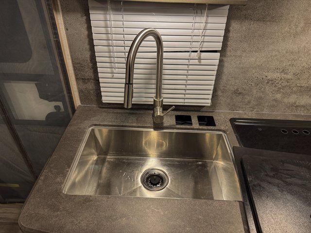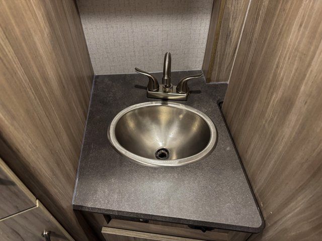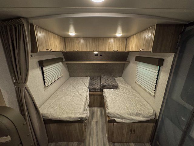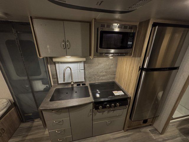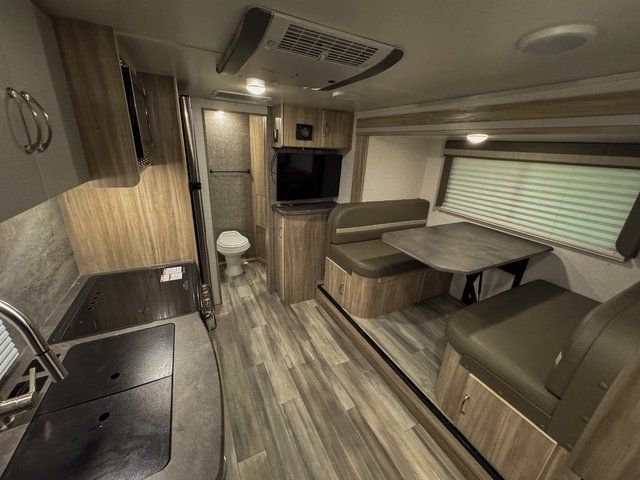Head to your favorite destination with your favorite person in this Micro Minnie FLX travel trailer! It features two 32" x 74" twin beds up front with a nightstand in between and the ability to convert into a 74" x 82" king bed. You also have a divider curtain for privacy at night. Keep your bellies full with home cooked meals prepared with the recessed three burner cooktop, enjoy your meals at the 44" x 72" booth dinette slide, and store any leftovers in the 10.3 cu. ft. refrigerator. You could even switch out the dinette for the optional 60" x 75" sofa with table and cabinet above it. A pocket door closes off the full rear bathroom which has a 30" x 36" shower and a wardrobe to keep your towels close!