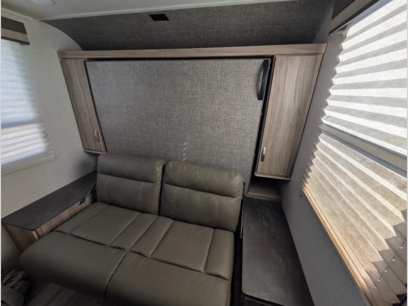 Take this Micro Minnie FLX travel trailer out to a familiar campsite or across the country on a new exploration! With its ability to sleep five people, this trailer provides you with a comfortable resting area to offer to friends or family that are traveling with you. There is a single slide so that you have more interior living space, and the full galley kitchen is equipped with a recessed three-burner cooktop and convection microwave so that you can cook even when you don't have a fire going. You'll have a full bathroom with a radius shower and linen closet, and the front Murphy bed can fold down into a bed that can be sectioned off with a divider curtain, or it can fold away to reveal a sofa for afternoon lounging.