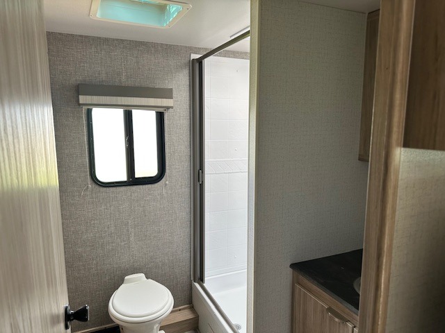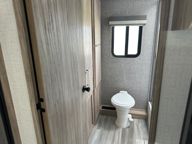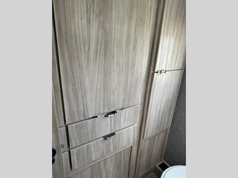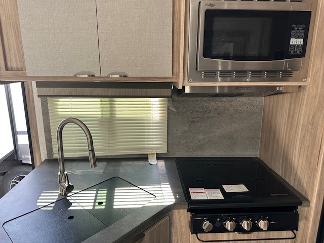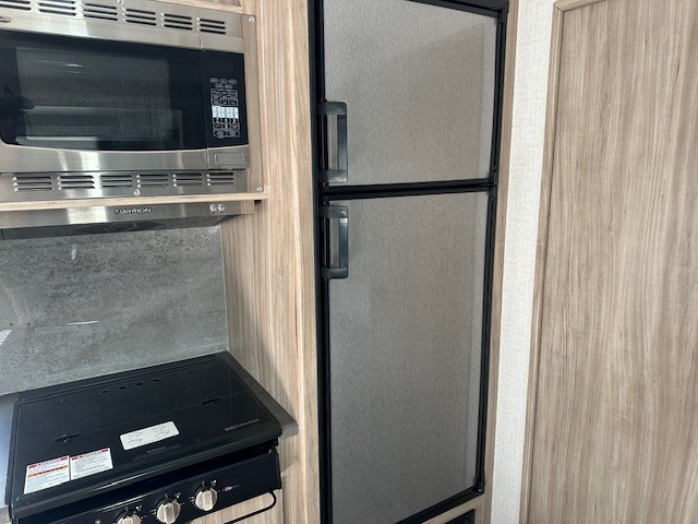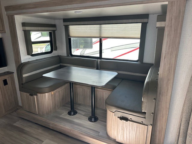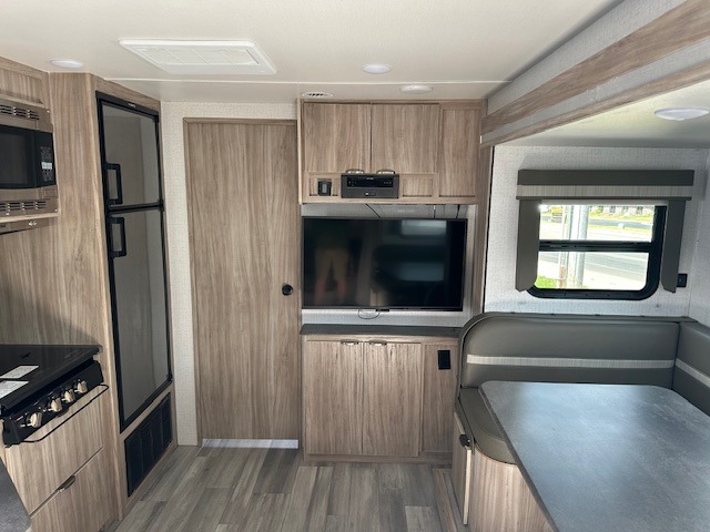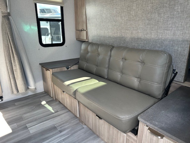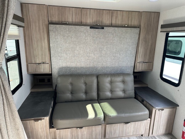Versatility comes standard in this spacious travel trailer that can sleep four people each night. The Murphy bed will provide a great night's rest each night, and it can fold away in the morning to relax on the 72" sofa. There are dual wardrobes on either side of the bed for your clothes, and the spacious full rear bath is an added comfort you won't want to camp without. Your guests can sleep on the U-shaped dinette slide out when it's not being used to dine at, and there is an LED TV in the living area to enjoy movie night. This model also includes a three burner cooktop, a convection microwave, and a 10.3 cu. ft. 12V refrigerator for perishables.