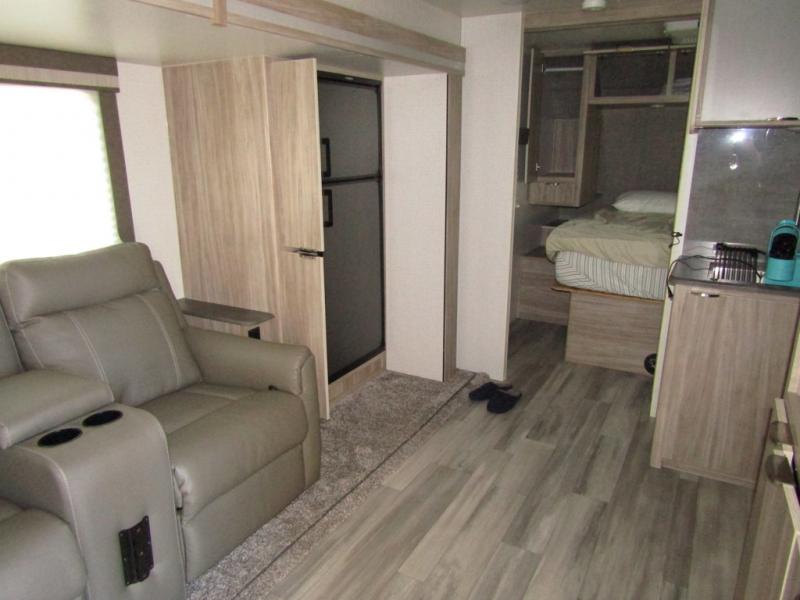Your crew will love camping in this fun travel trailer with double-size bunks, an outdoor kitchen, and a queen bed just like at home. You'll find a tri-fold sofa with a sofa table within the large slide out, and the LED TV across the sofa for easy viewing. There is a walk-in pantry just as you enter the unit that will be perfect for shoes, jackets, and dry goods, plus there are shelves and overhead cabinets in the kitchen for even more storage. You will love the spacious front private bedroom that includes a sliding door that saves space, a queen bed for comfort, and dual wardrobes to keep your clothes wrinkle-free.