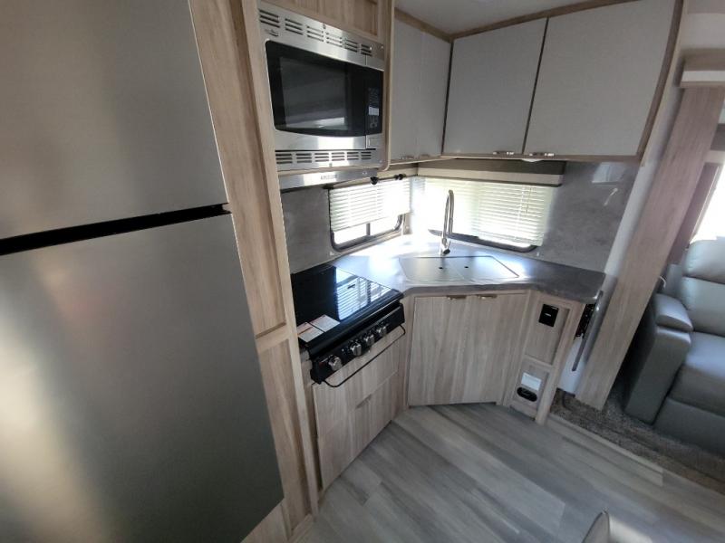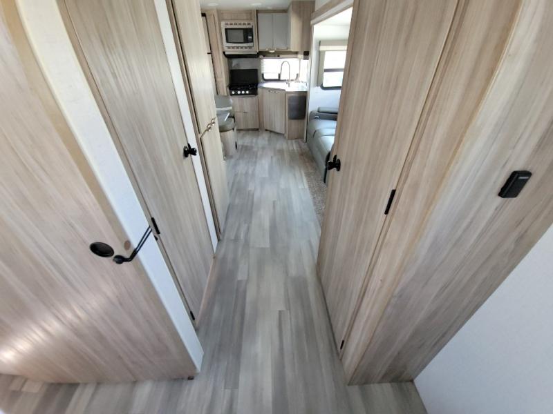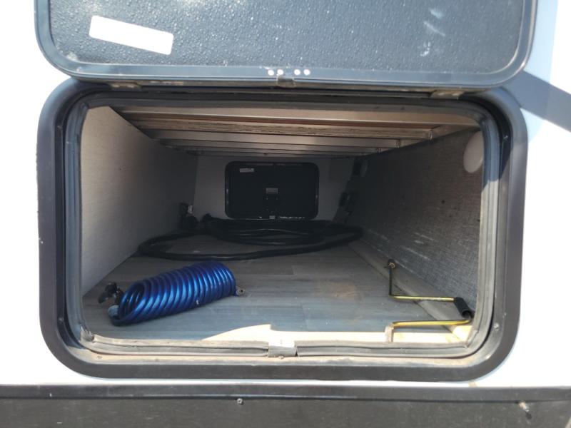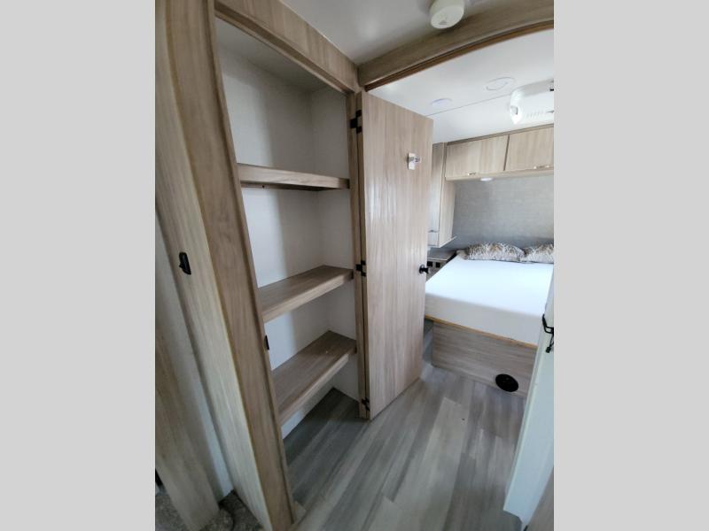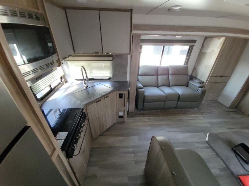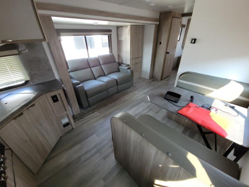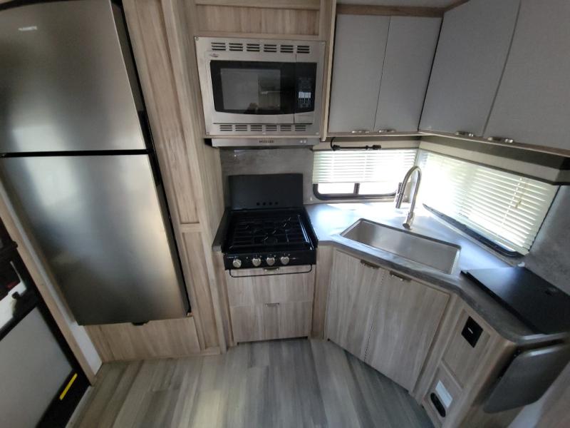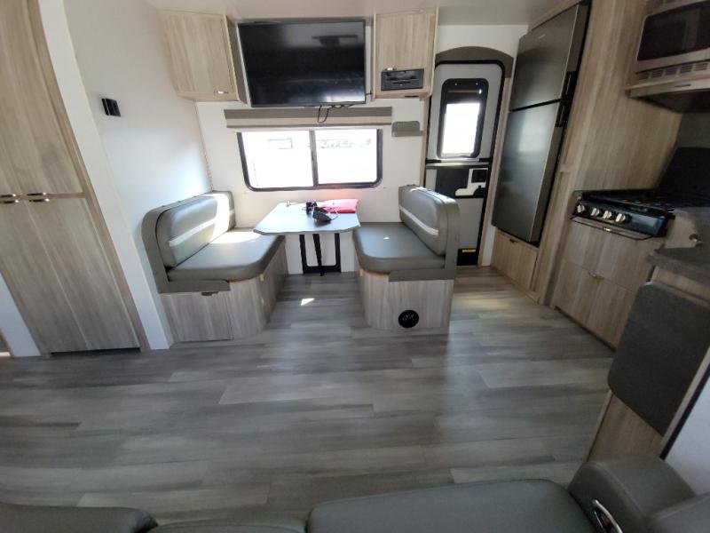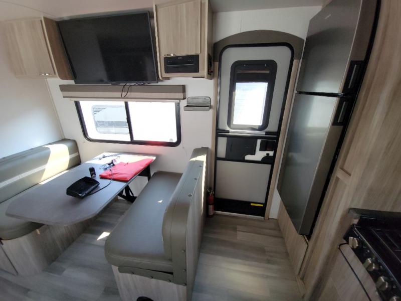 This travel trailer will feel just like home with its front private bedroom with its own exterior entry door, a full bath, plus a rear kitchen to cook up your best meals. Once lunch is made, you can dine at the booth dinette, or take your plate outdoors to sit under the 18' power awning with LED lights. The large slide out will provide more space to let the dog nap on the floor, and there is an LED TV to watch a movie on those rainy camp days. You'll also find plenty of storage space throughout this travel trailer for all your belongings, and exterior storage for camp gear!