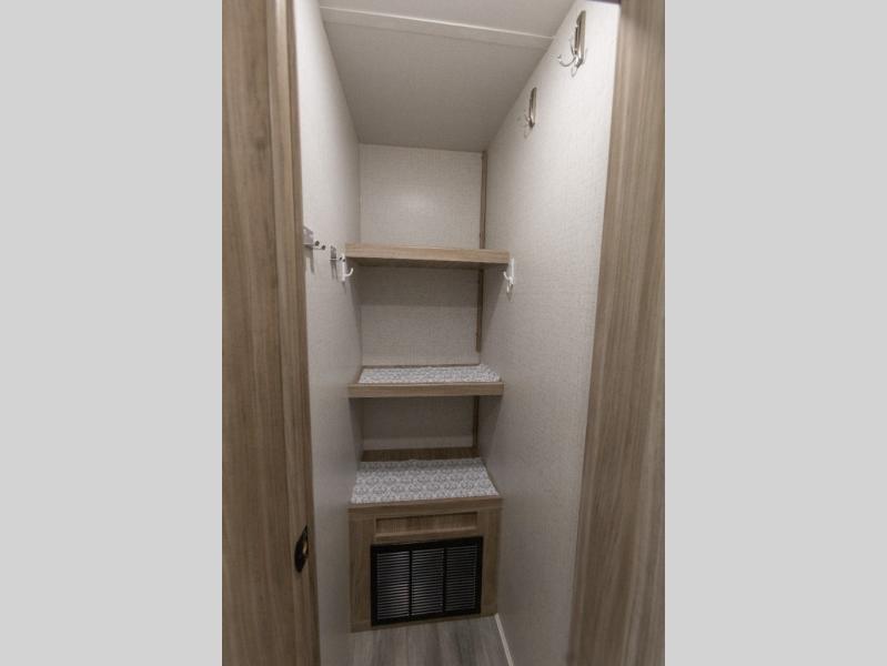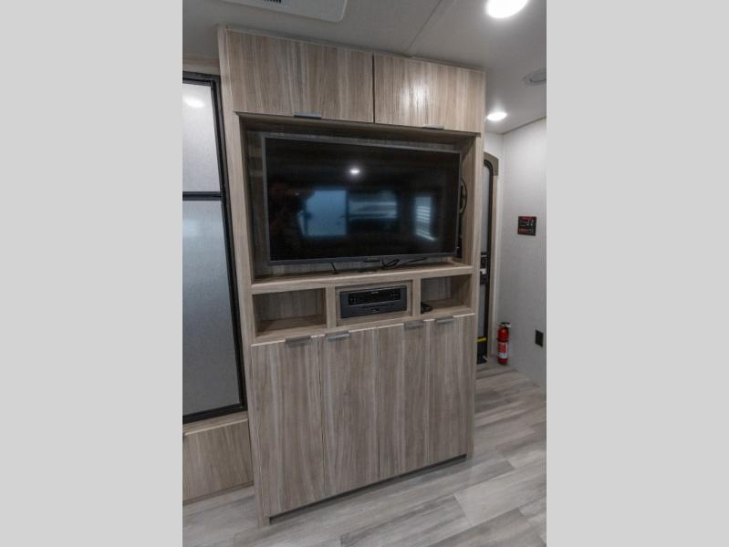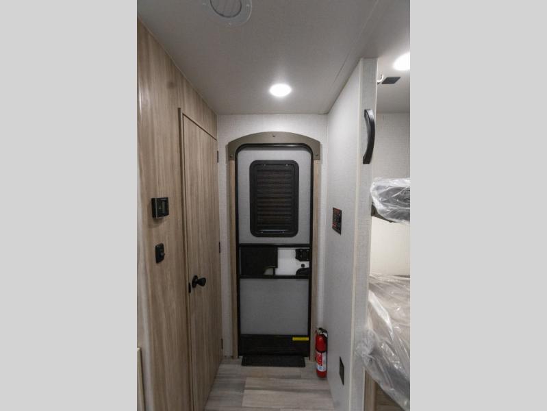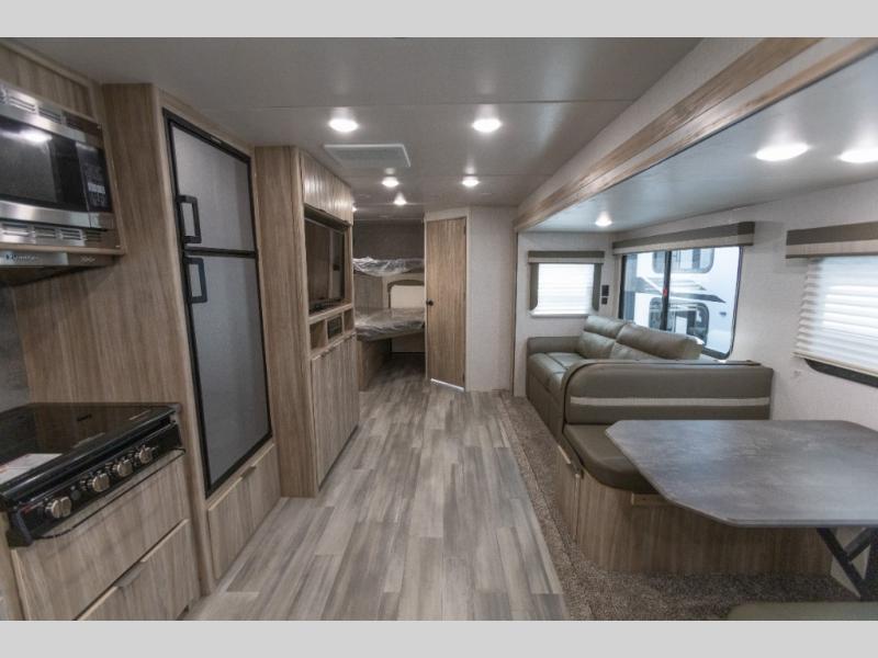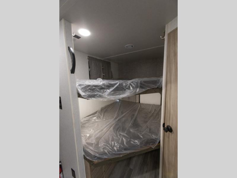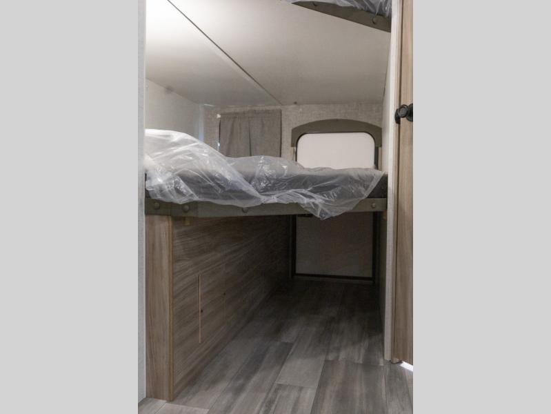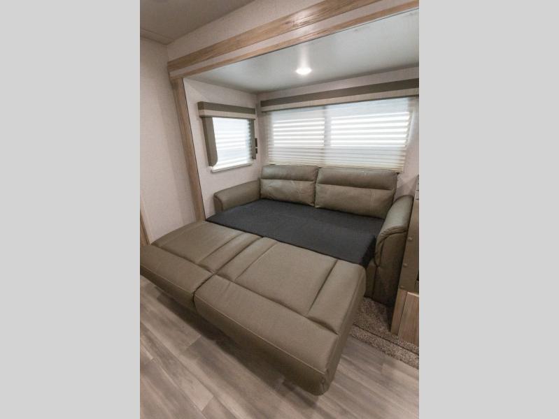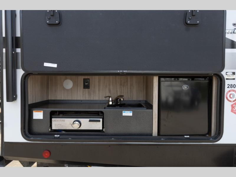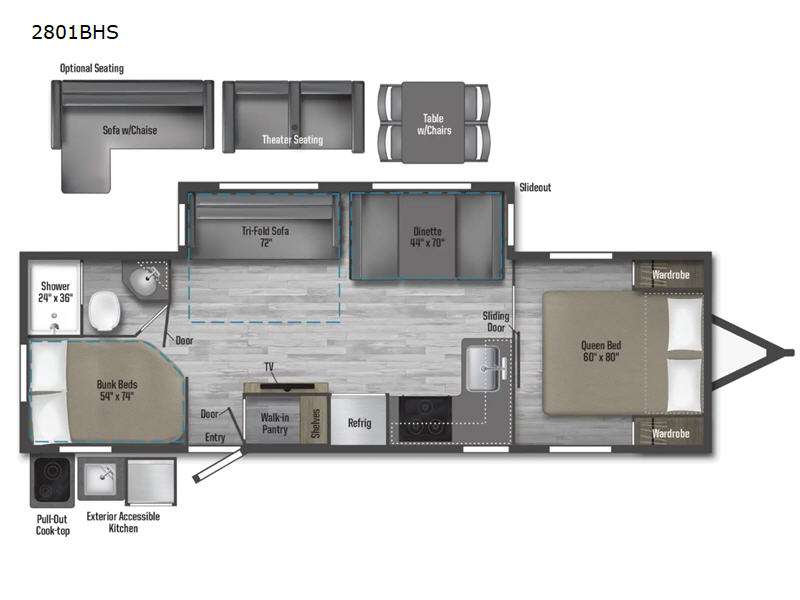 This model is similar to 2301BHS, but with a larger length and more seating space. Within the large slide out you'll find a tri-fold sofa and booth dinette to relax, dine, and sleep additional guests. The little ones are sure to love the double-size bunks, and there is a front private bedroom with a queen bed for you. The chef of your group can cook indoors on the three burner cooktop, or outdoors on the outside kitchen. And don't forget about all the storage space you'll find both indoors and outdoors!