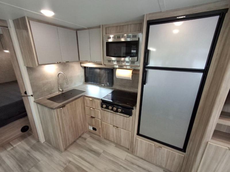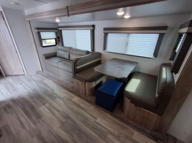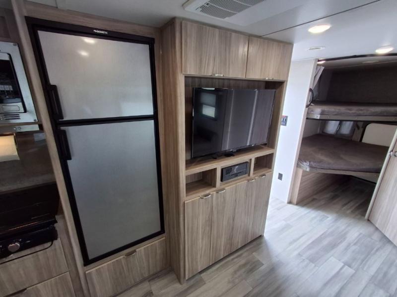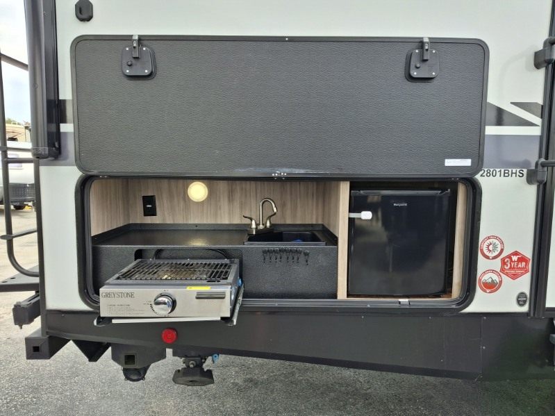 This model is similar to 2301BHS, but with a larger length and more seating space. Within the large slide out you'll find a tri-fold sofa and booth dinette to relax, dine, and sleep additional guests. The little ones are sure to love the double-size bunks, and there is a front private bedroom with a queen bed for you. The chef of your group can cook indoors on the three burner cooktop, or outdoors on the outside kitchen. And don't forget about all the storage space you'll find both indoors and outdoors!