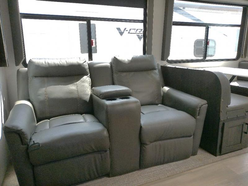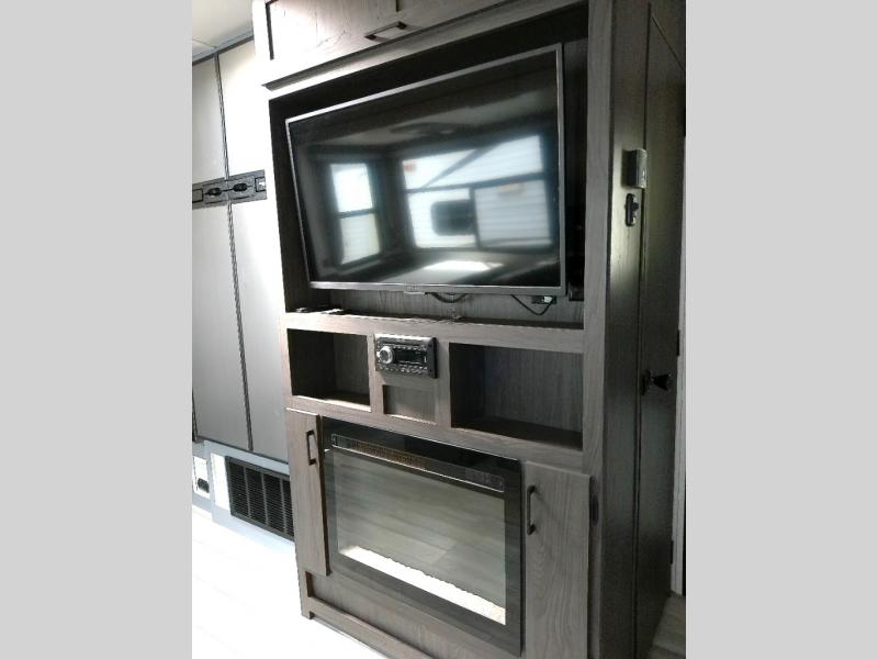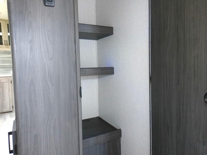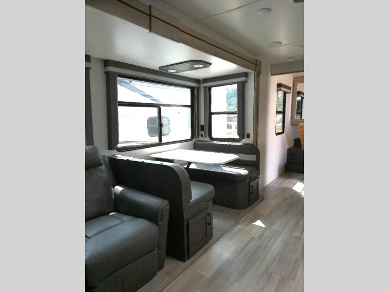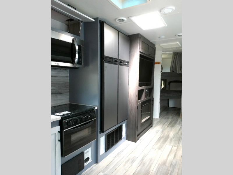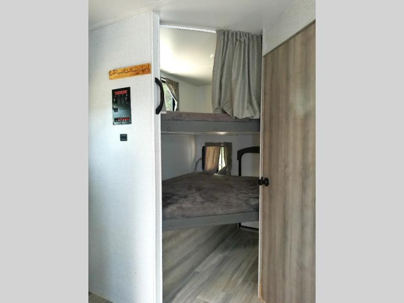 Whatever reason you get away from your daily schedule, you'll want to sleep in a little bit longer each morning since you will have your own private bedroom in the front with a queen bed or choose the king option, and since the bedroom has the second exterior entry door, you can come and go as you please. Your guests or your kids will also have a comfortable place to spend the night with the double-size bunks in the back. And if you do happen to have even more people traveling with you, there is a tri-fold sofa and booth dinette slide out that can provide more sleeping space. The indoor kitchen is fully equipped with a recessed three-burner cooktop and convection microwave for delicious meals, but there is also an exterior kitchen that you can use for some summertime fun.