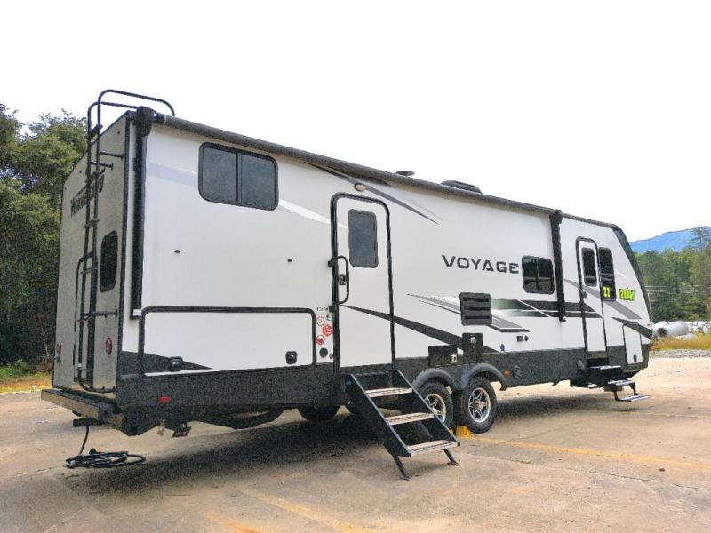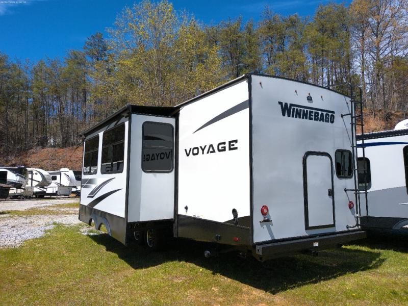 Each Voyage travel trailer by Winnebago Industries Towables includes two 100-watt solar panels with a charge control monitor so you can camp off-grid, satellite and antenna connections, and an antenna with wifi prep. Also included is a heated and enclosed underbelly with thermo foil insulation for four seasons of travel, a gel coat fiberglass front cap with integrated LED lighting, walk-on roof decking, plus four-point power/electric stabilizers for easy setup and stability. The interior offers comforts of home, large windows, ceiling LED lights, ductless flooring throughout, and full kitchen amenities. No voyage is better than the one taken in the Voyage travel trailer!